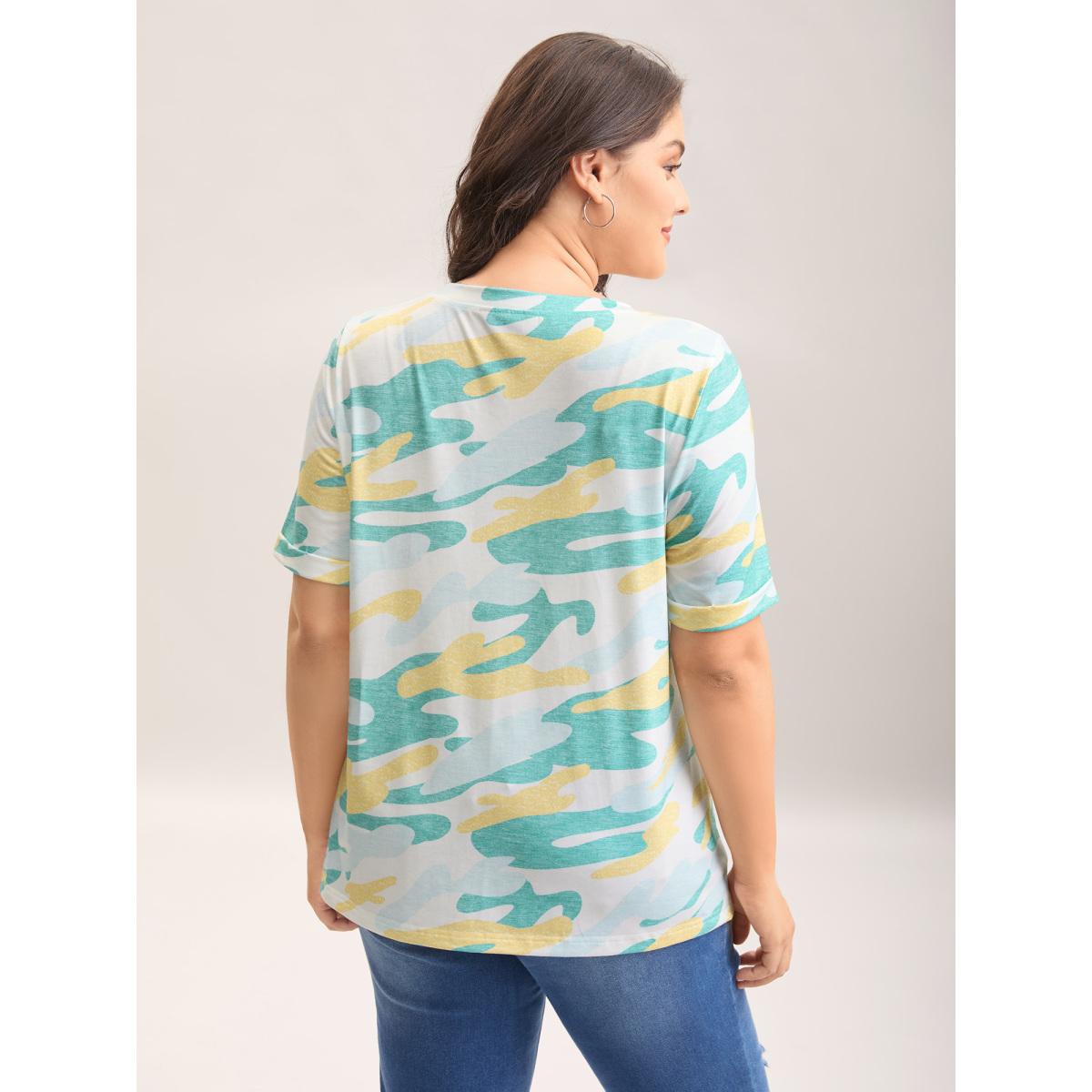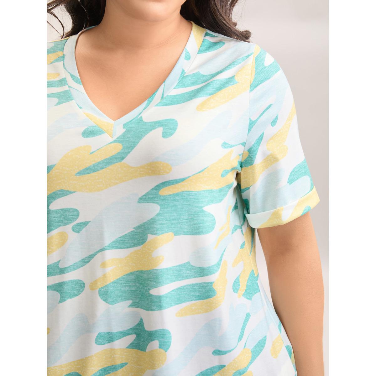Plus Size Camouflage Print V-Neck Curvy T-Shirt Turquoise Women Leisure Roll Hem V-neck Casual T-shirts BloomChic 10/M
