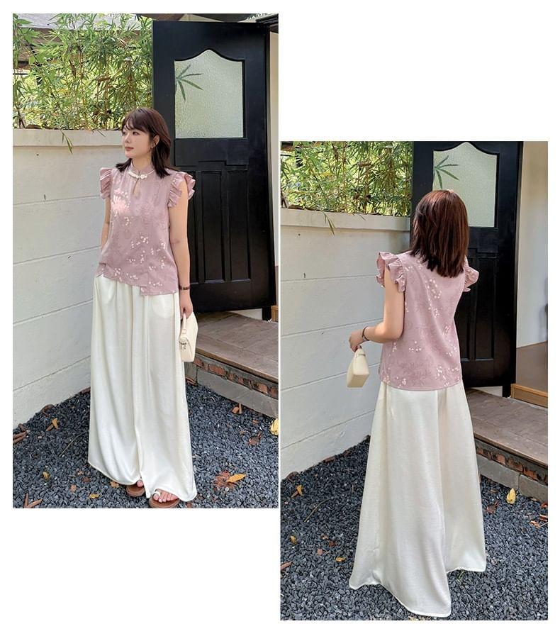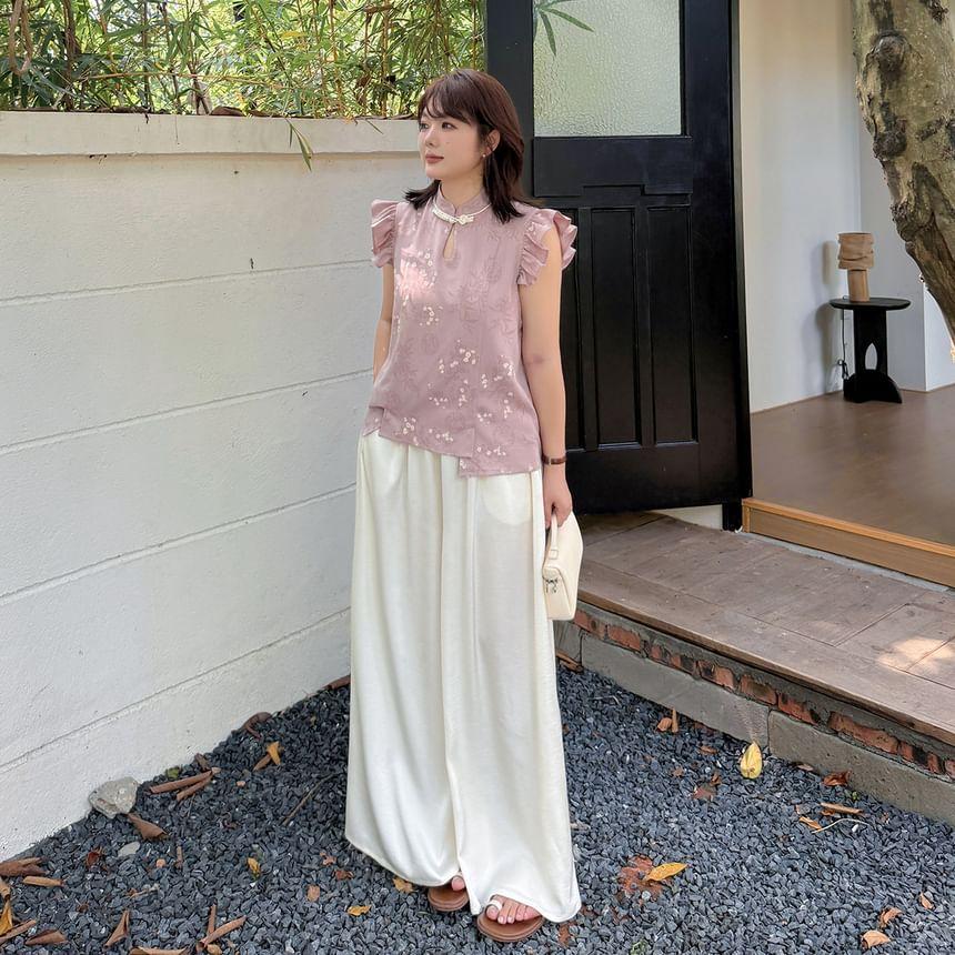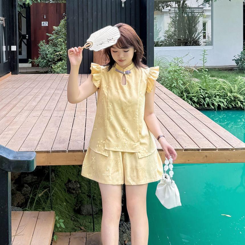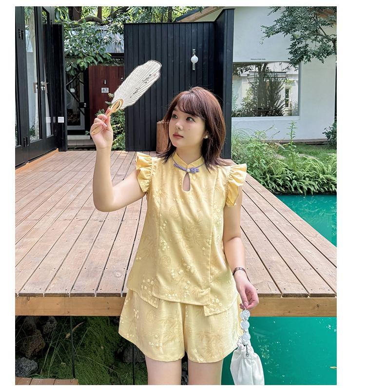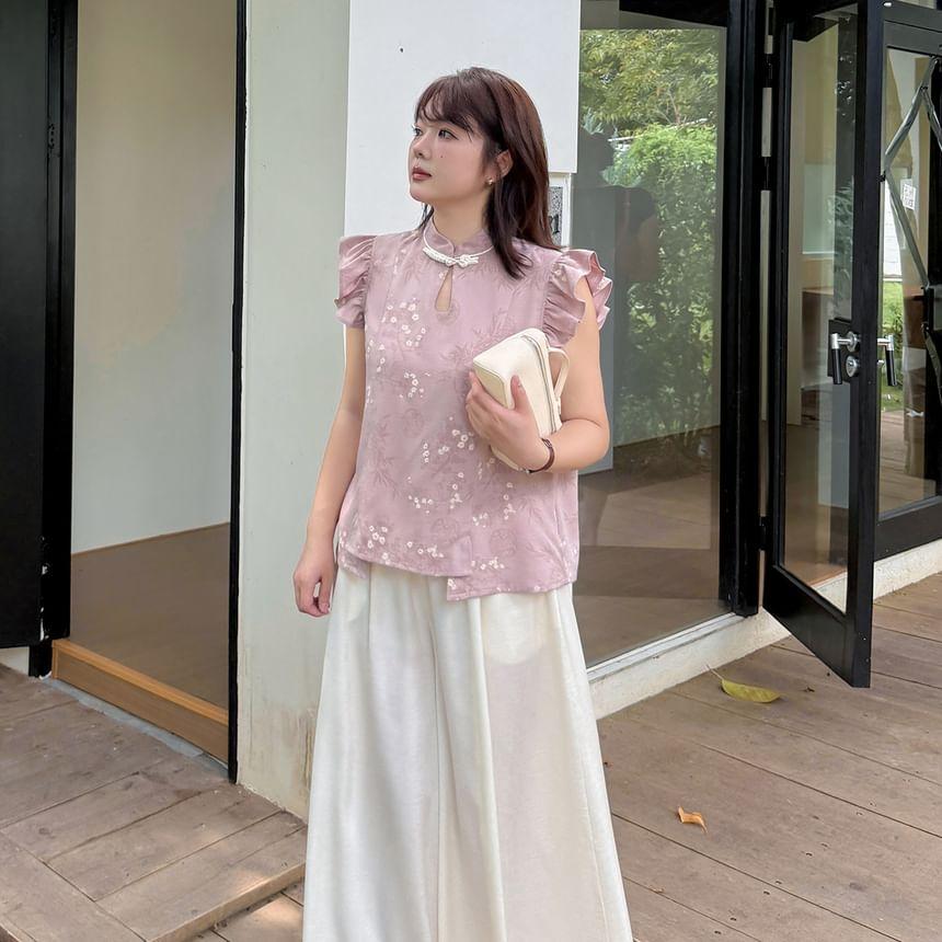Plus Size Cap-Sleeve Stand Collar Floral Print Cutout Frog Buttoned Blouse
