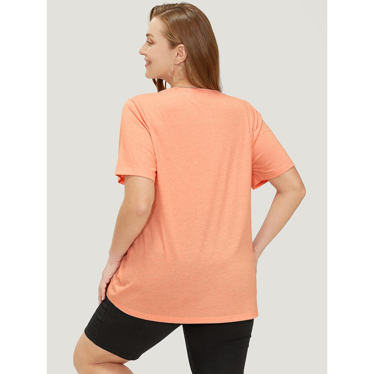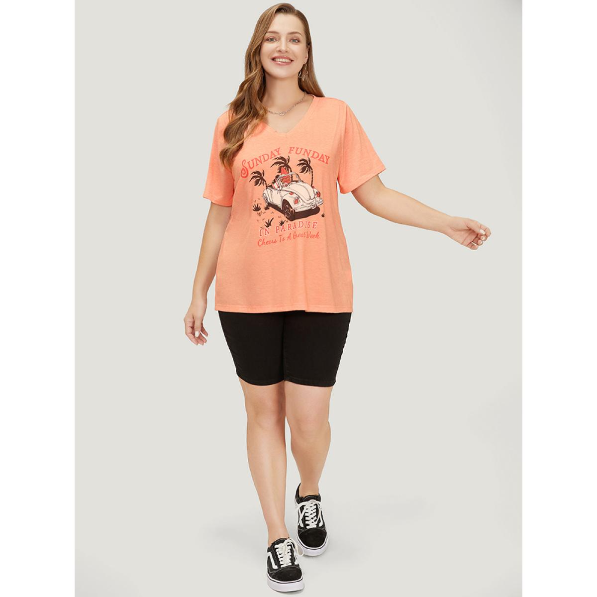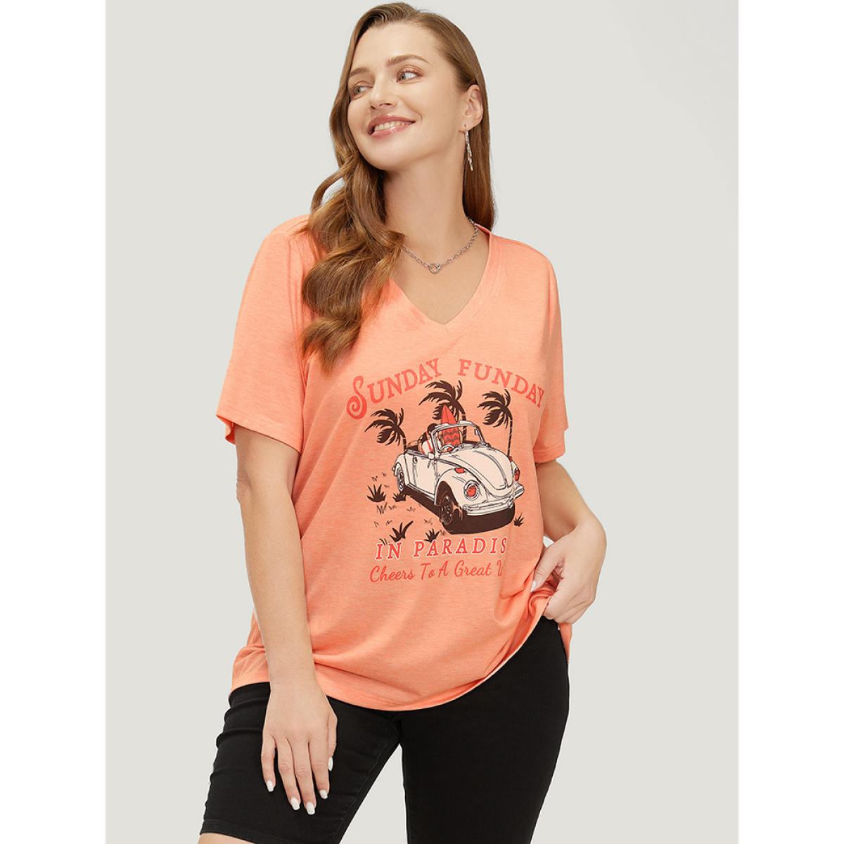 Plus Size Car & Letter Print V Neck Drop Shoulder T-shirt Coral Women Casual Tropical Dailywear T-shirts BloomChic 12/L