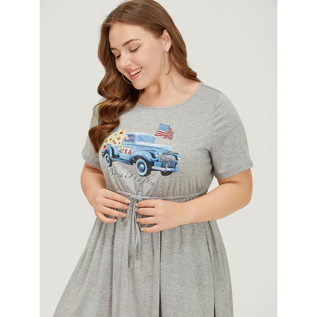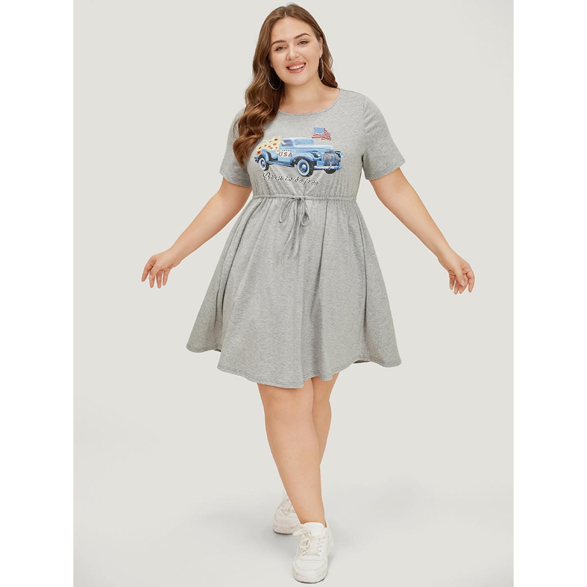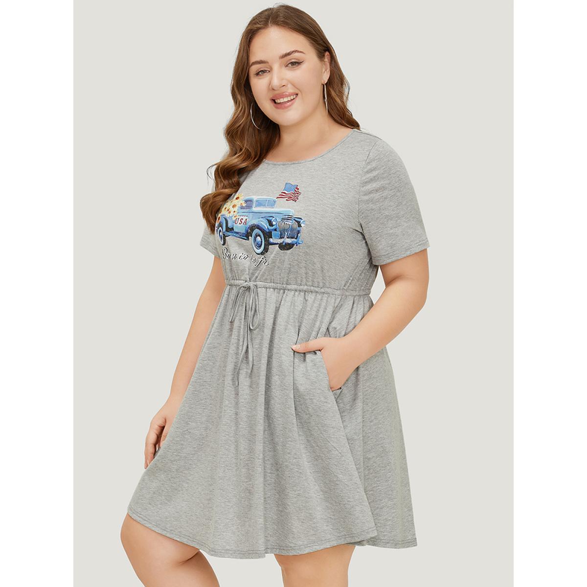 Plus Size Car Print Drawstring Pocket Flutter Graphic Dress LightGray Women Casual Drawstring Curvy Knee Dress BloomChic 10/M