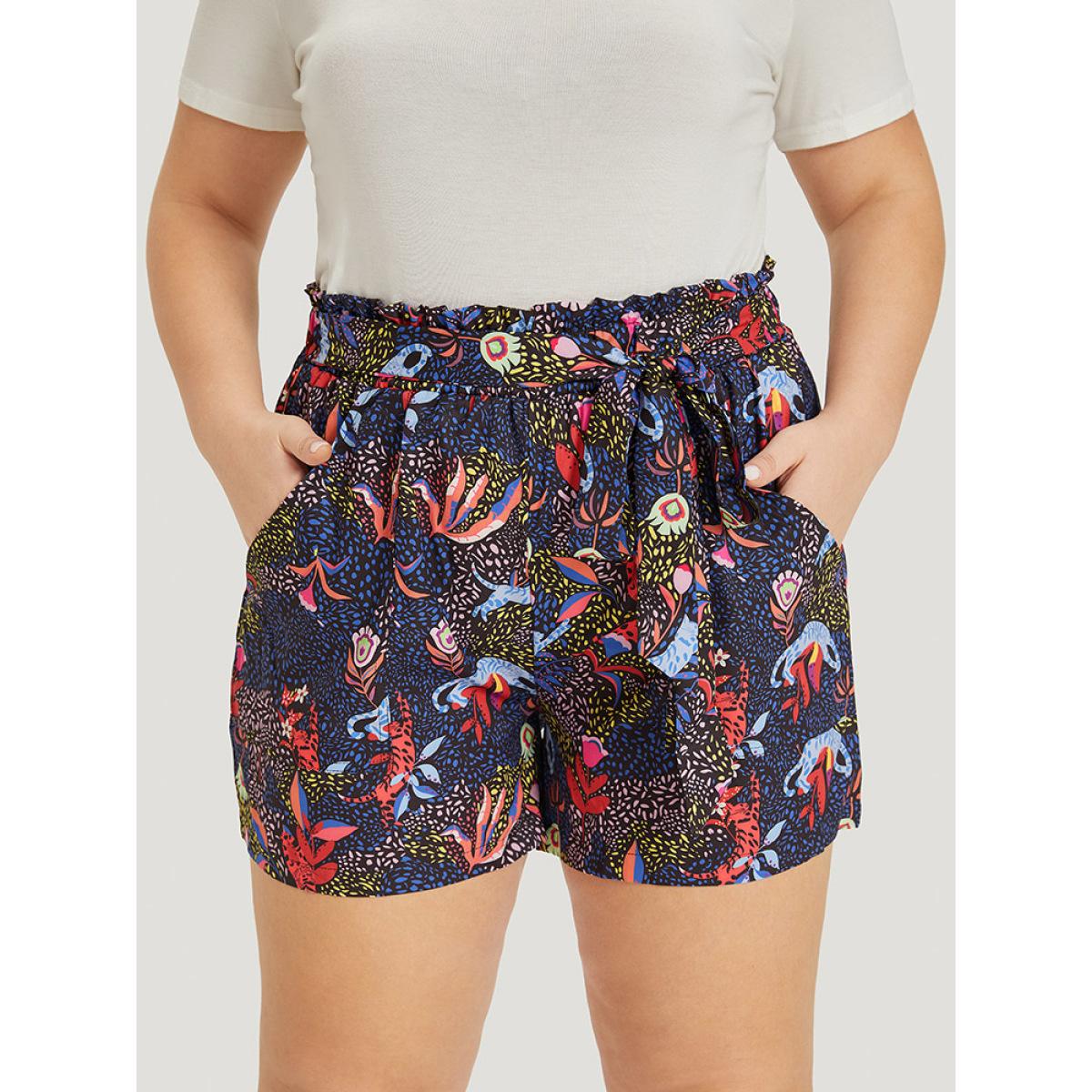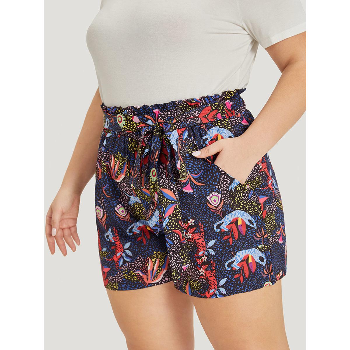 Plus Size Cat & Floral Print Paperbag Waist Belted Pocket Shorts Women Navy Casual Belted Dailywear Shorts BloomChic 30/6X