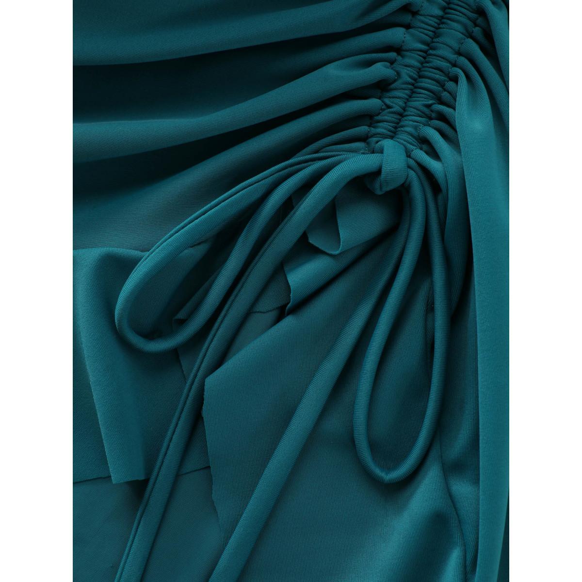 Plus Size Channel Drawstring Ruffled Swim Dress Women's Swimwear Cyan Resort Bodycon U-neck High stretch Curve Swim Dresses BloomChic 22-24/3X
