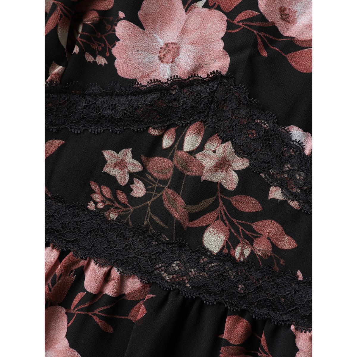 Plus Size Chiffon Floral Print Lace Trim Midi Dress Black Women Romantic Elastic Waist Heart neckline Elbow-length sleeve Curvy BloomChic 22-24/3X