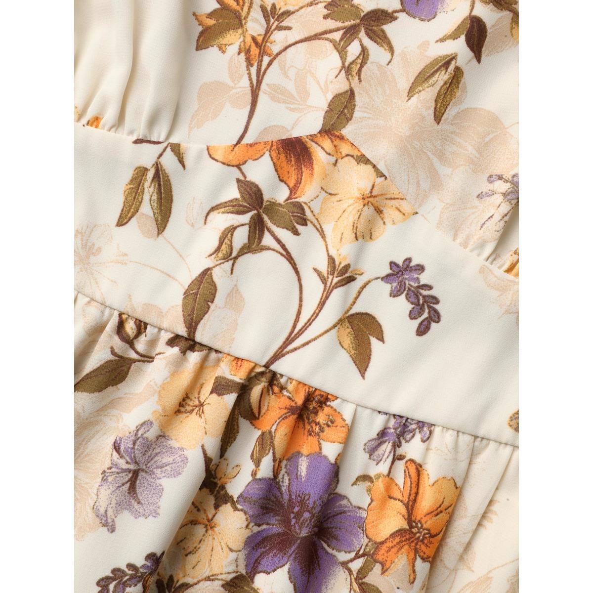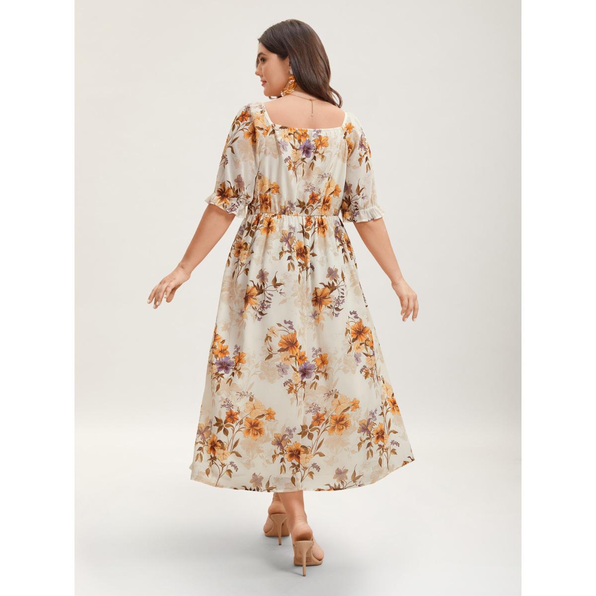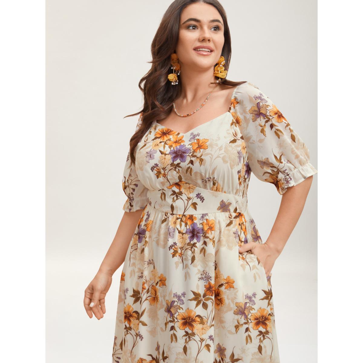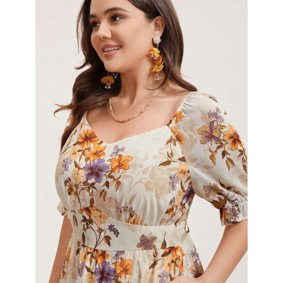 Plus Size Chiffon Floral Waist-Cinched Maxi Dress Beige Women Romantic Gathered Heart neckline Half Sleeve Curvy BloomChic 10/M Product Image
