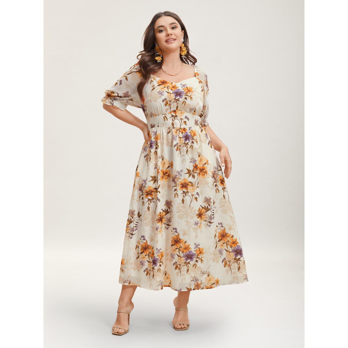 Plus Size Chiffon Floral Waist-Cinched Maxi Dress Beige Women Romantic Gathered Heart neckline Half Sleeve Curvy BloomChic 10/M