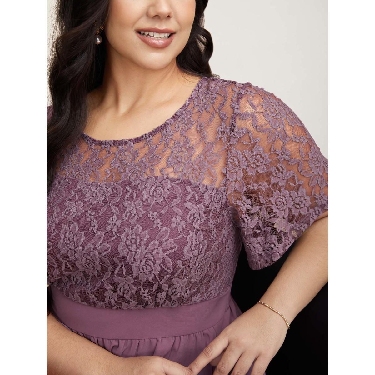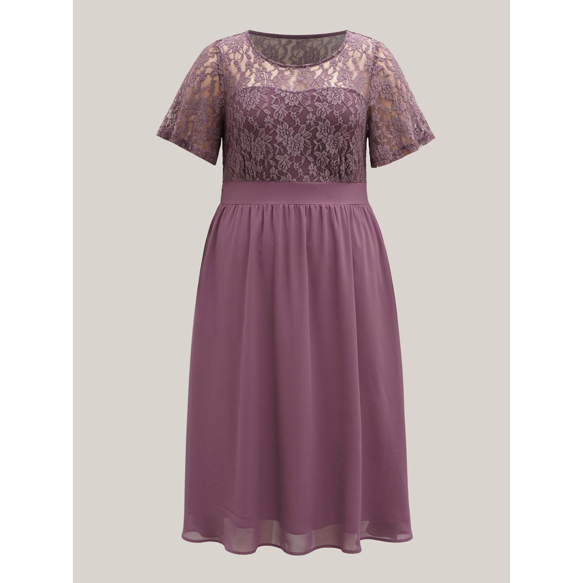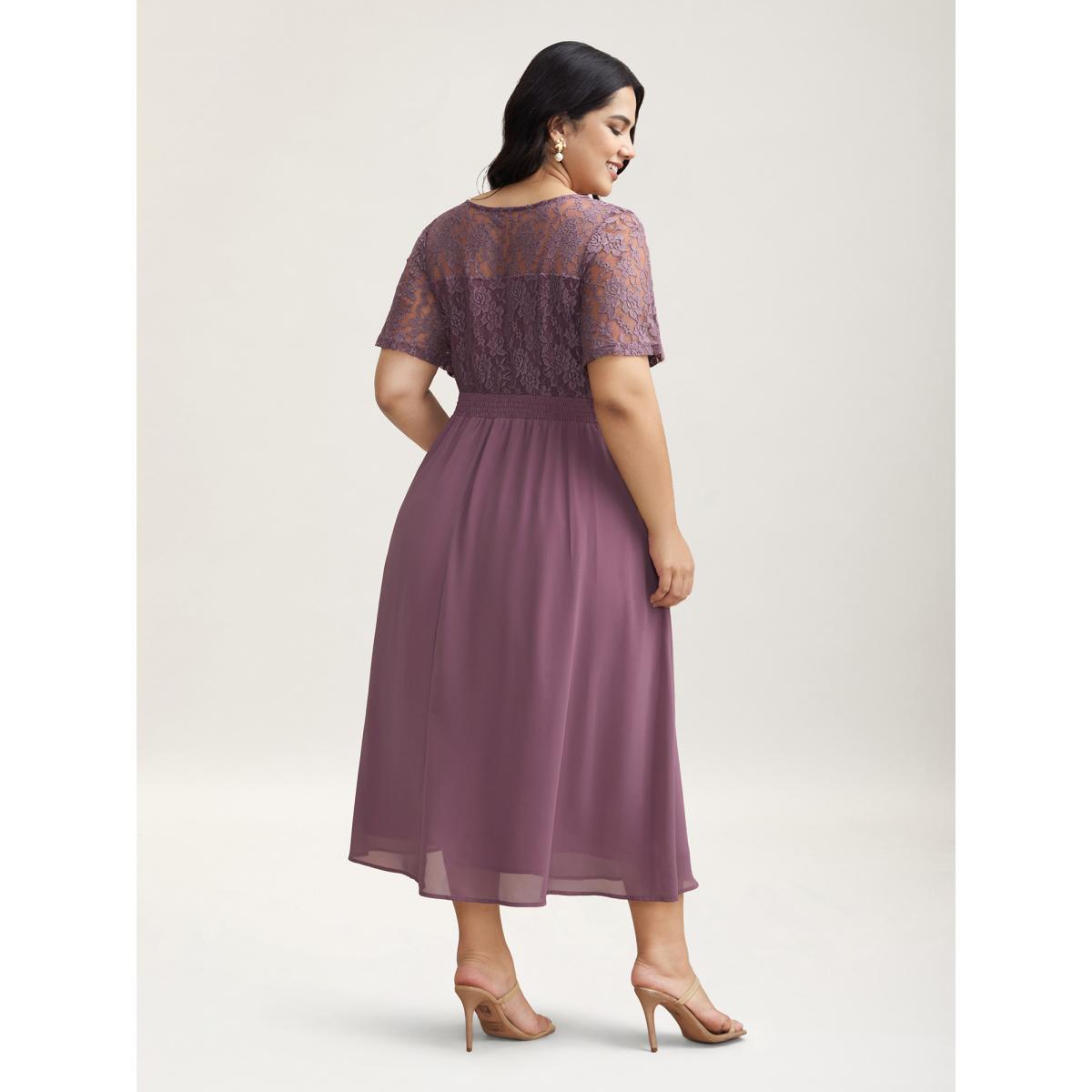 Plus Size Chiffon Lace Waist-Defining Midi Dress Heather Women Elegant Texture Round Neck Short sleeve Curvy BloomChic 14-16/1X