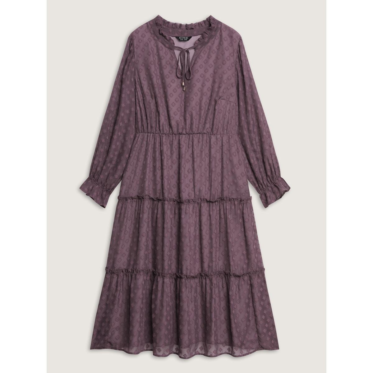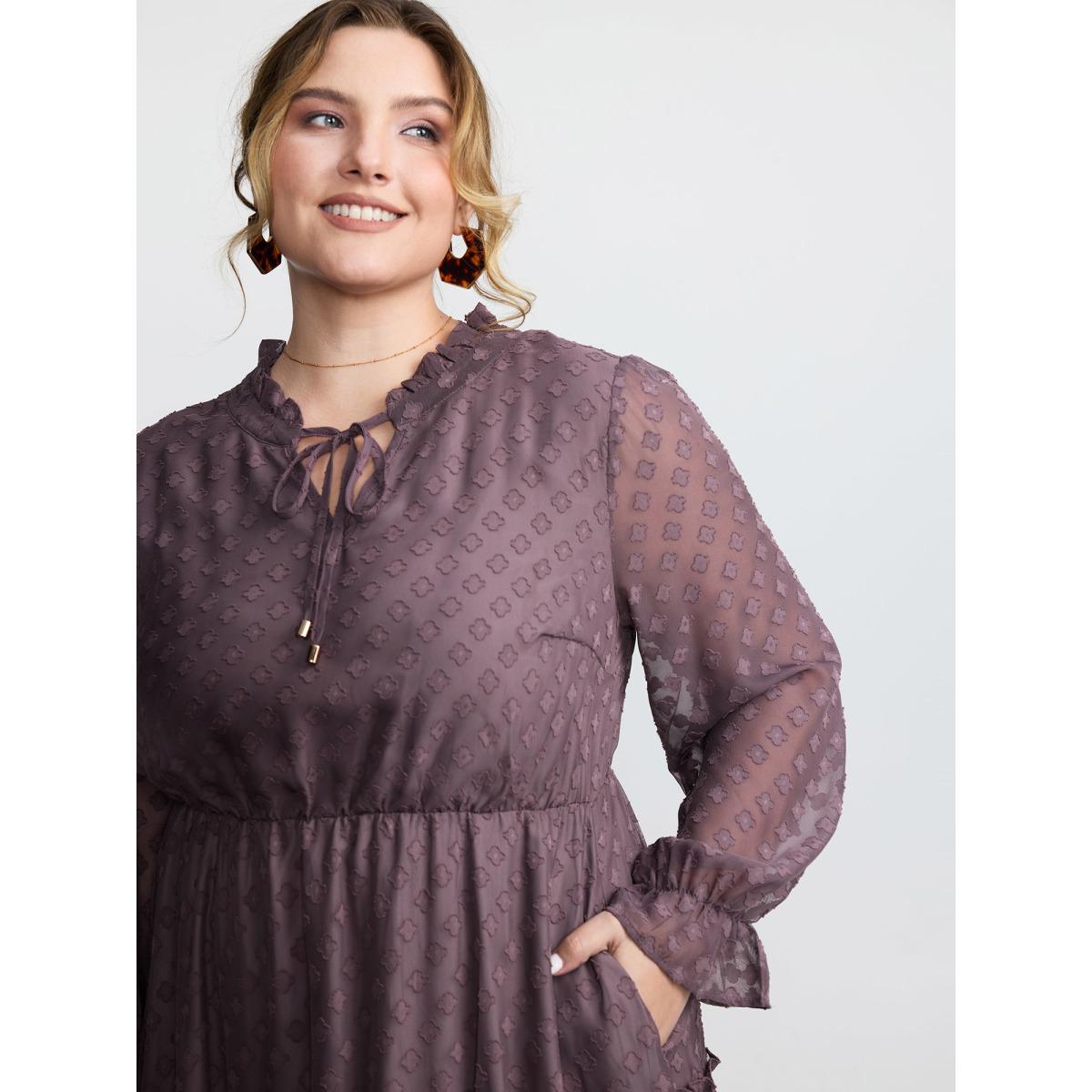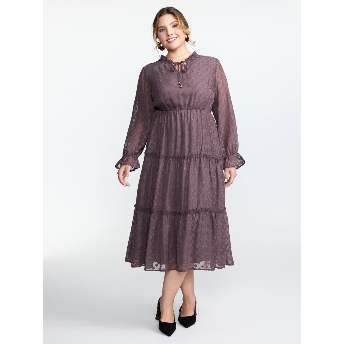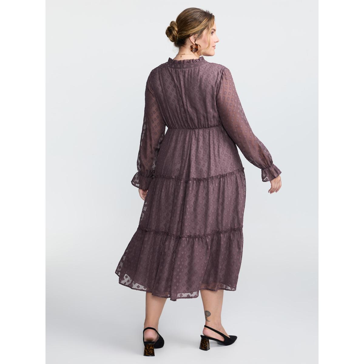 Plus Size Chiffon Textured Tiered Ruffled Midi Dress Mauve Women Flat collar with V-notch Extra Long Sleeve Curvy BloomChic 12/L Product Image