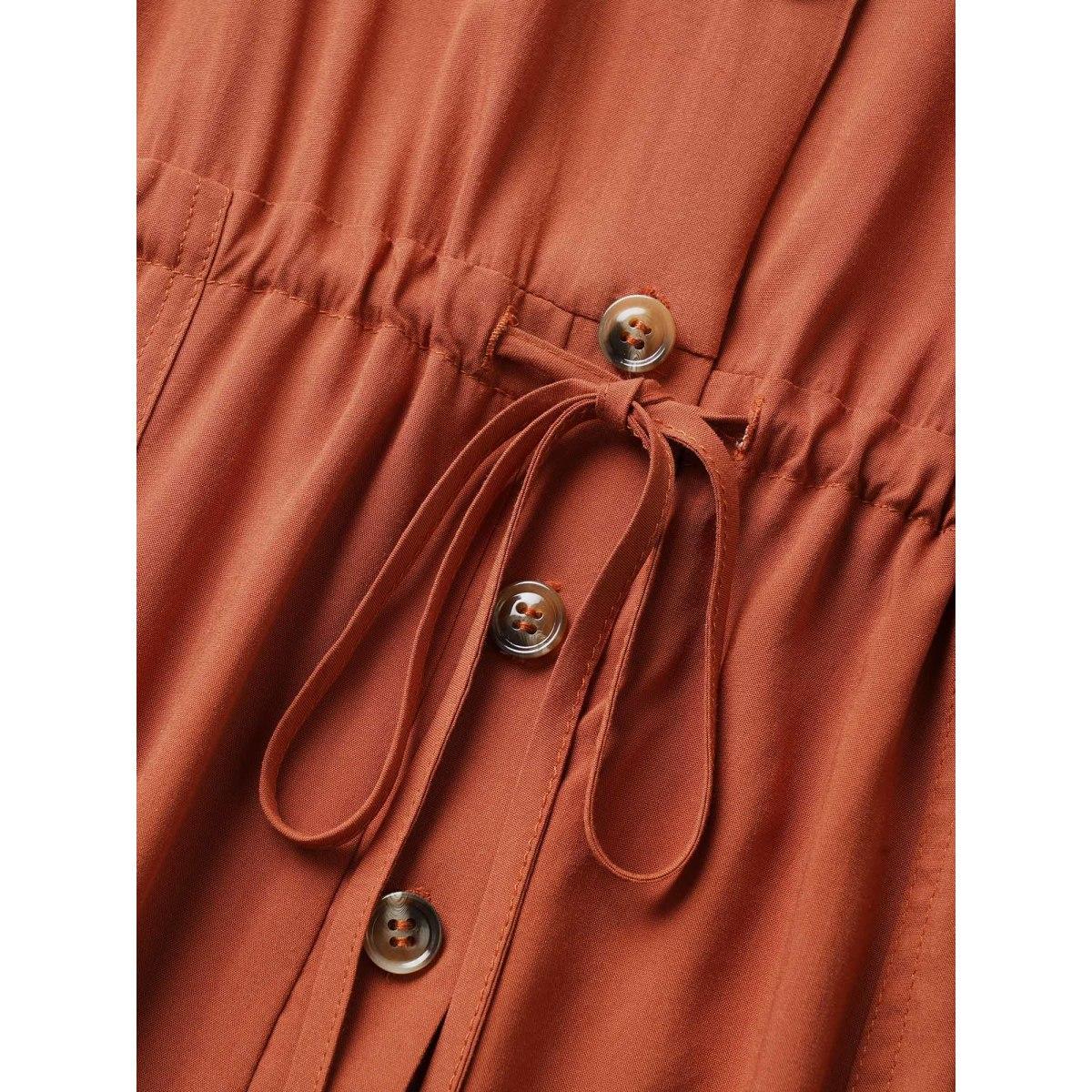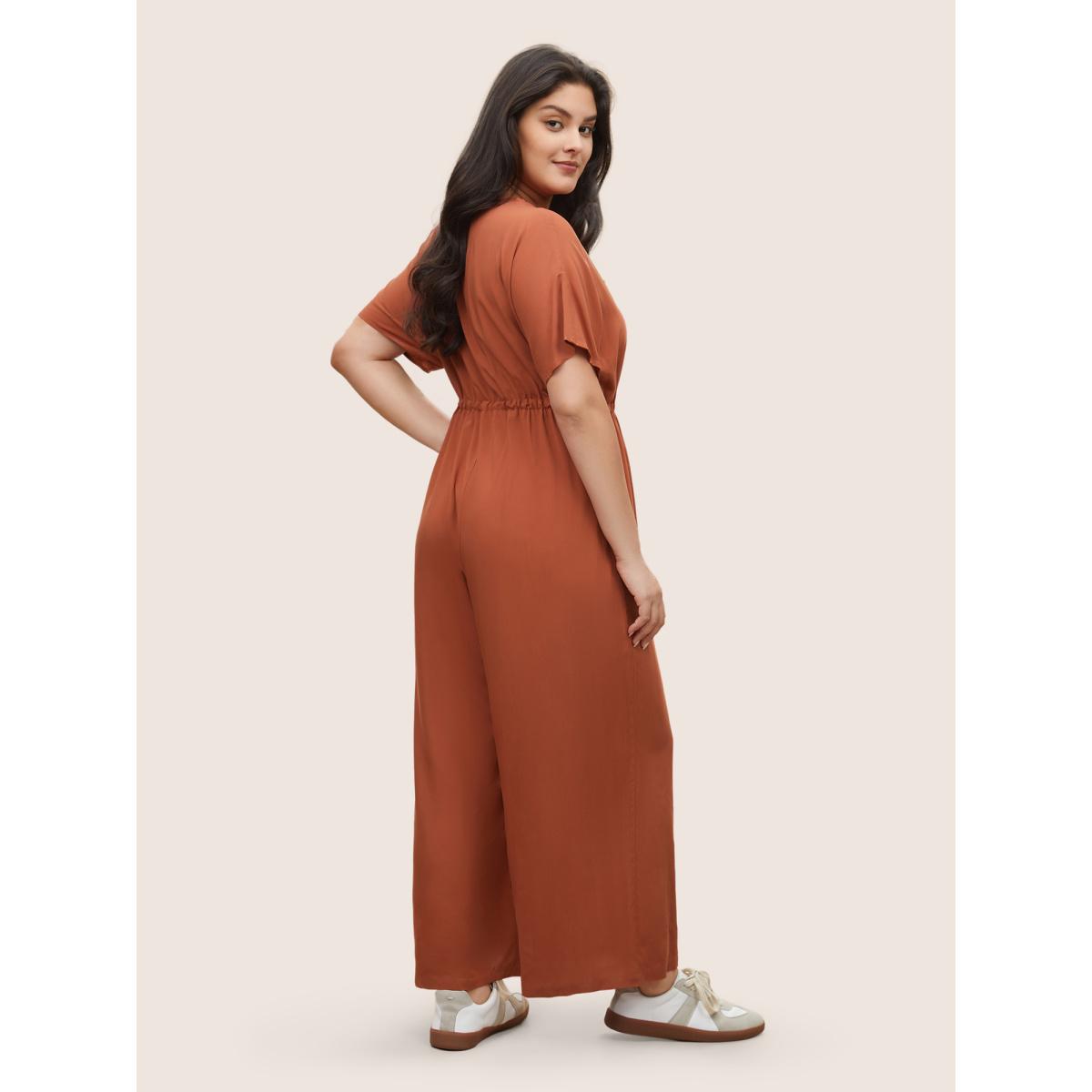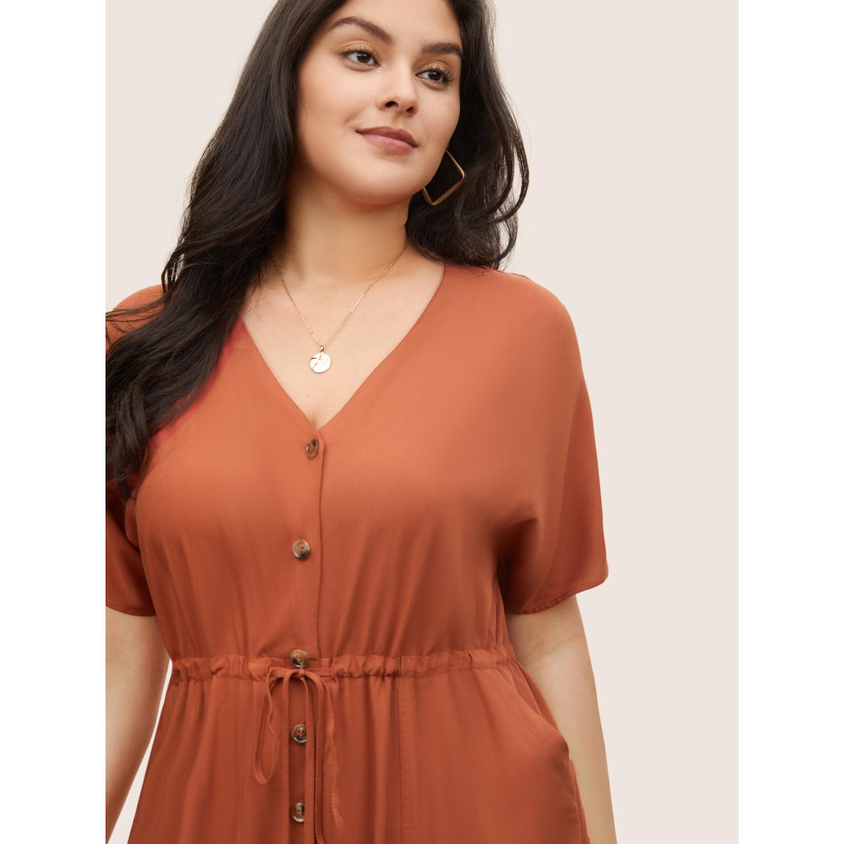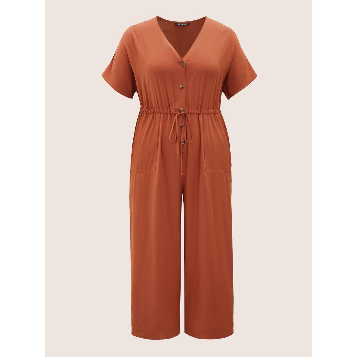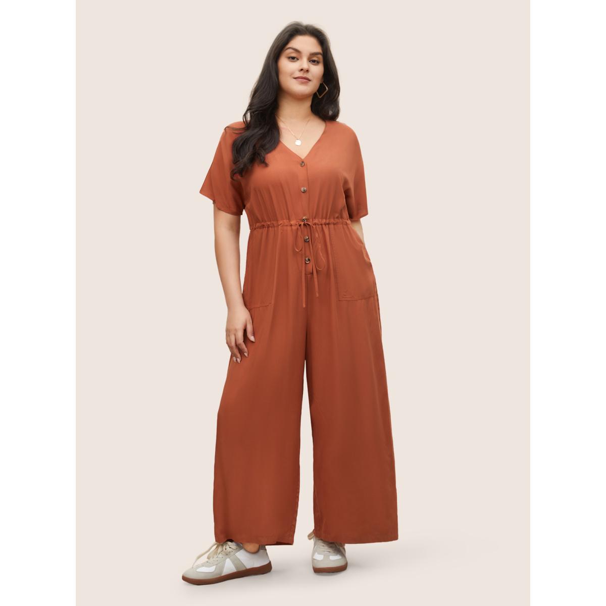 Plus Size Chocolate Plain Button Up Drawstring Gathered Pocket Jumpsuit Women Casual Short sleeve V-neck Everyday Loose Jumpsuits BloomChic 12/L