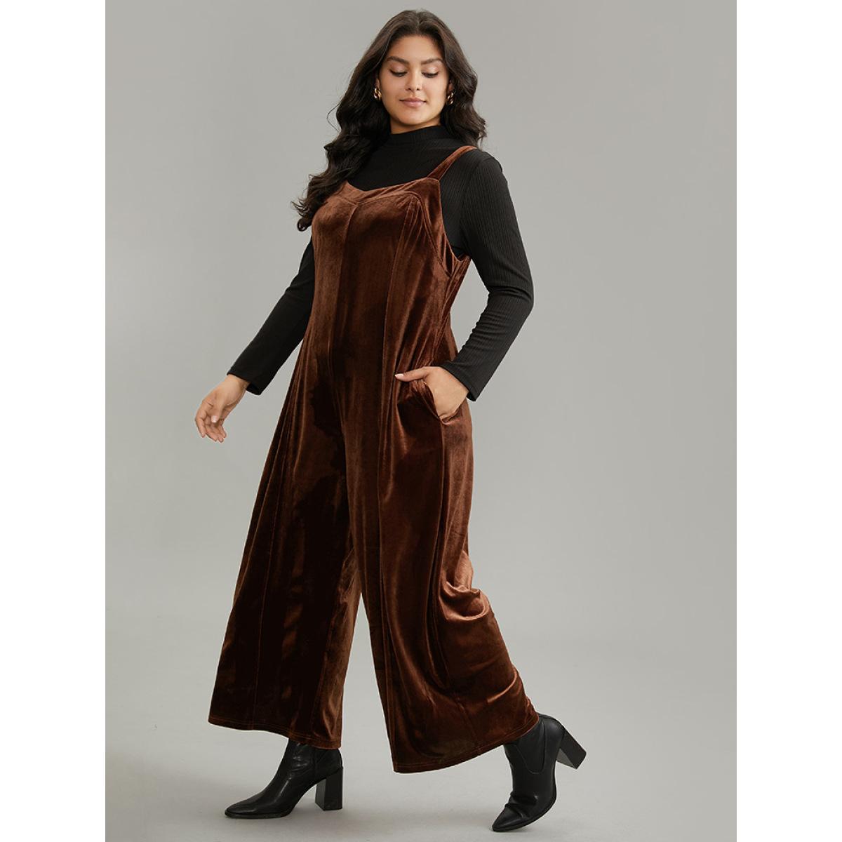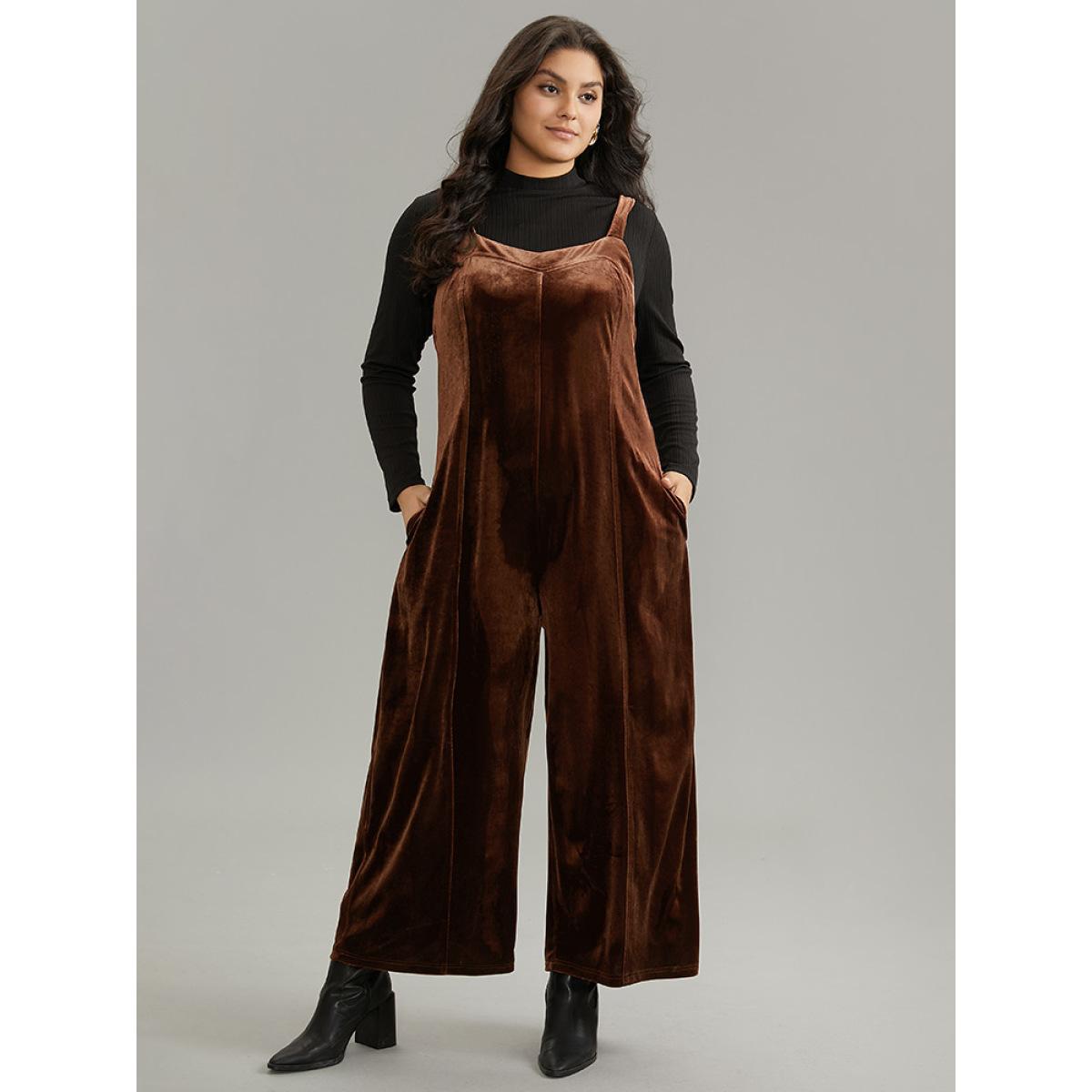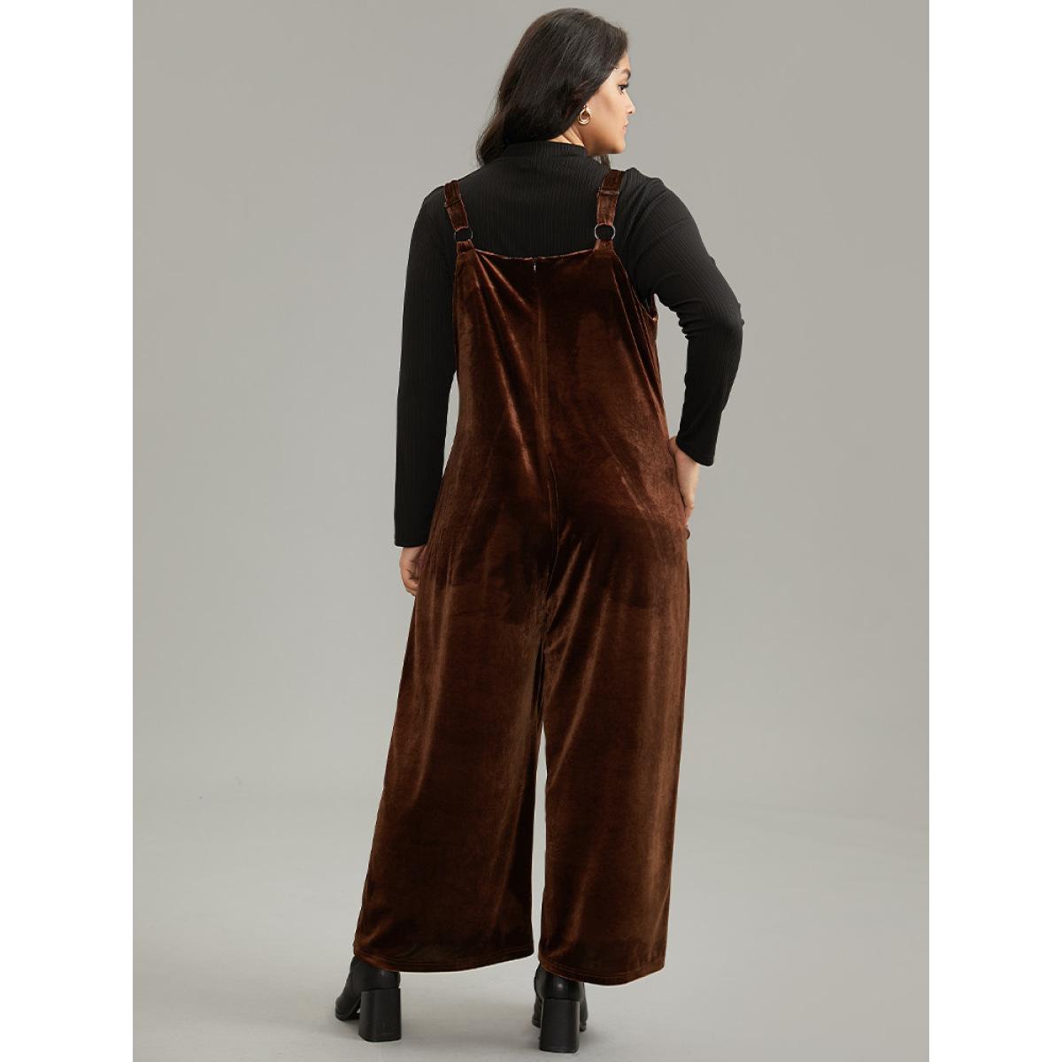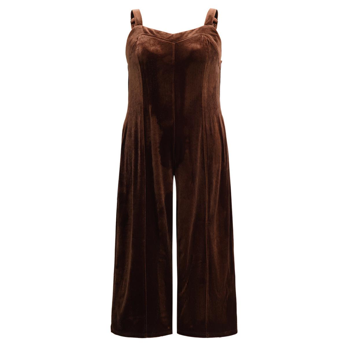 Plus Size Chocolate Plain Velvet Spaghetti Strap Pocket Jumpsuit Women Casual Sleeveless Spaghetti Strap Dailywear Loose Jumpsuits BloomChic 18-20/2X