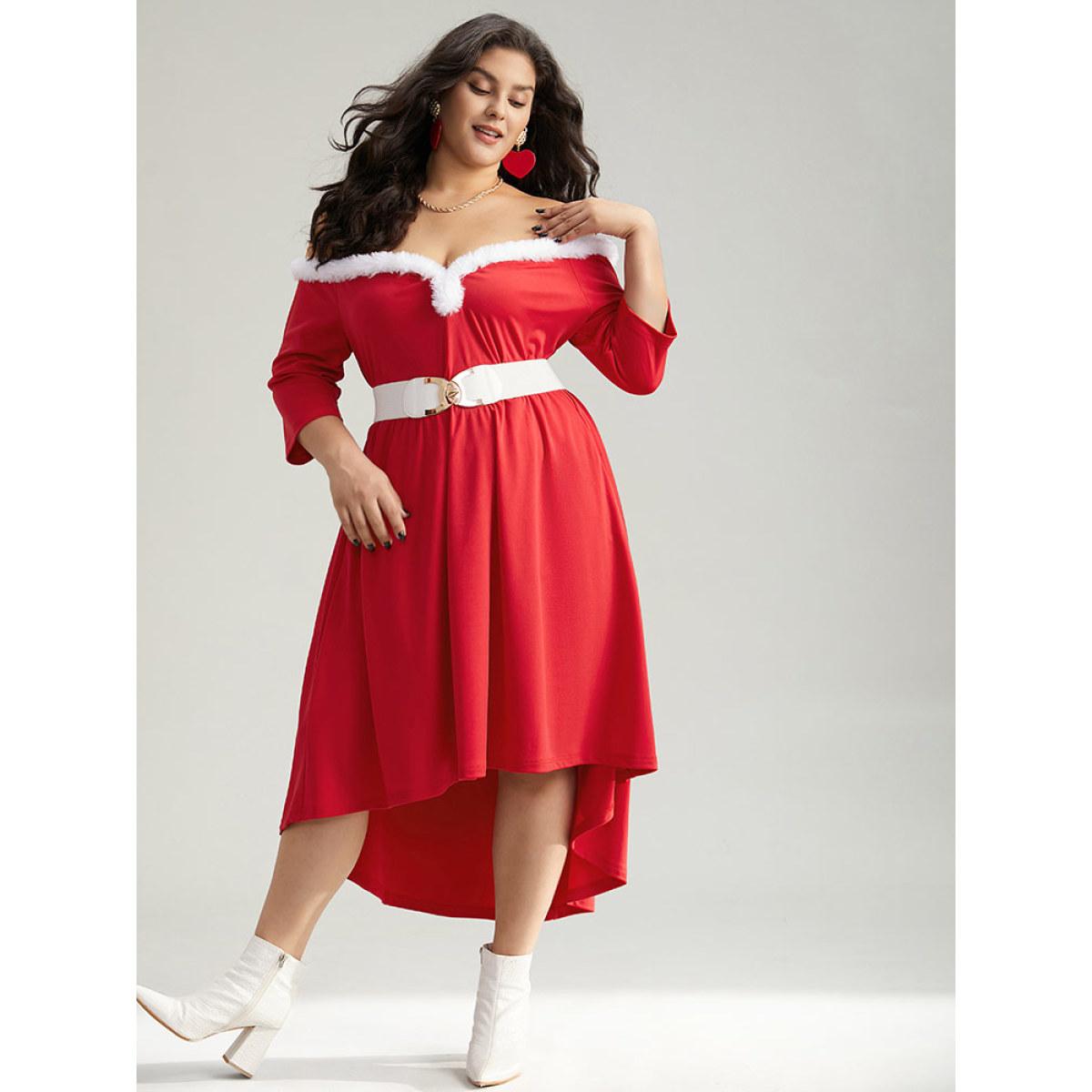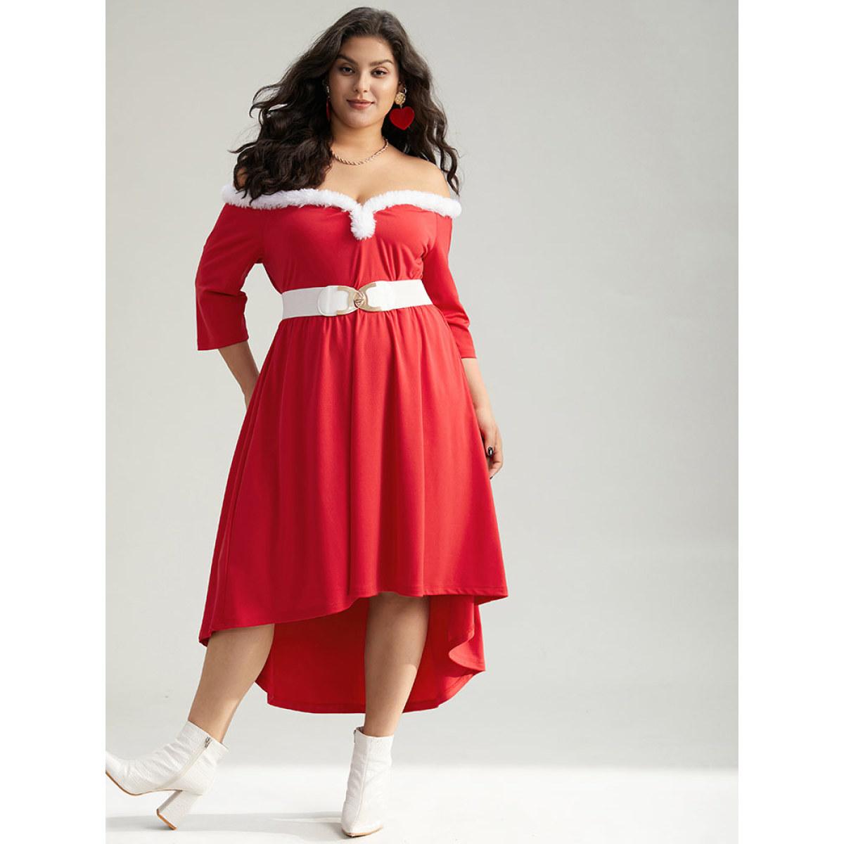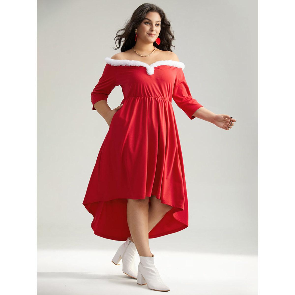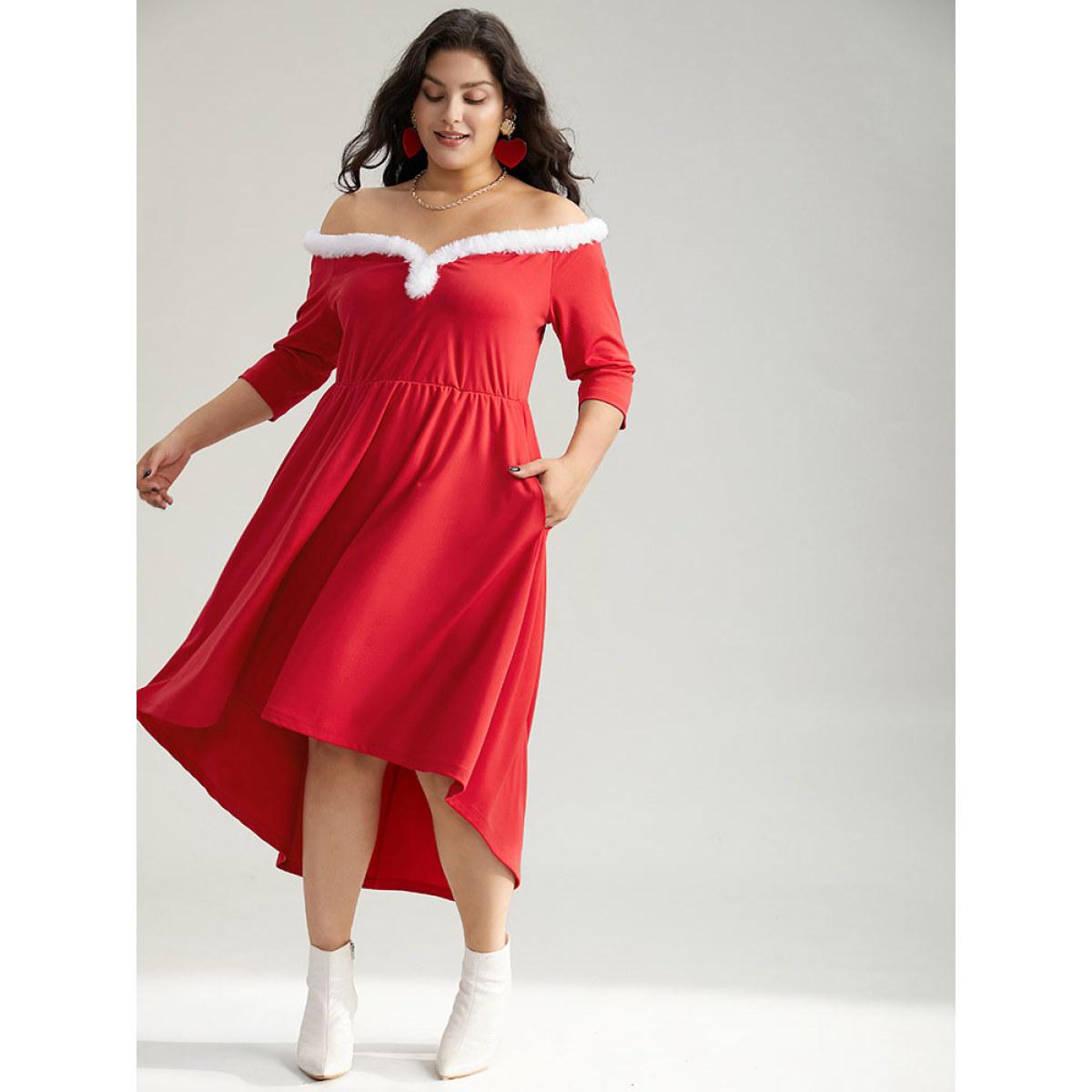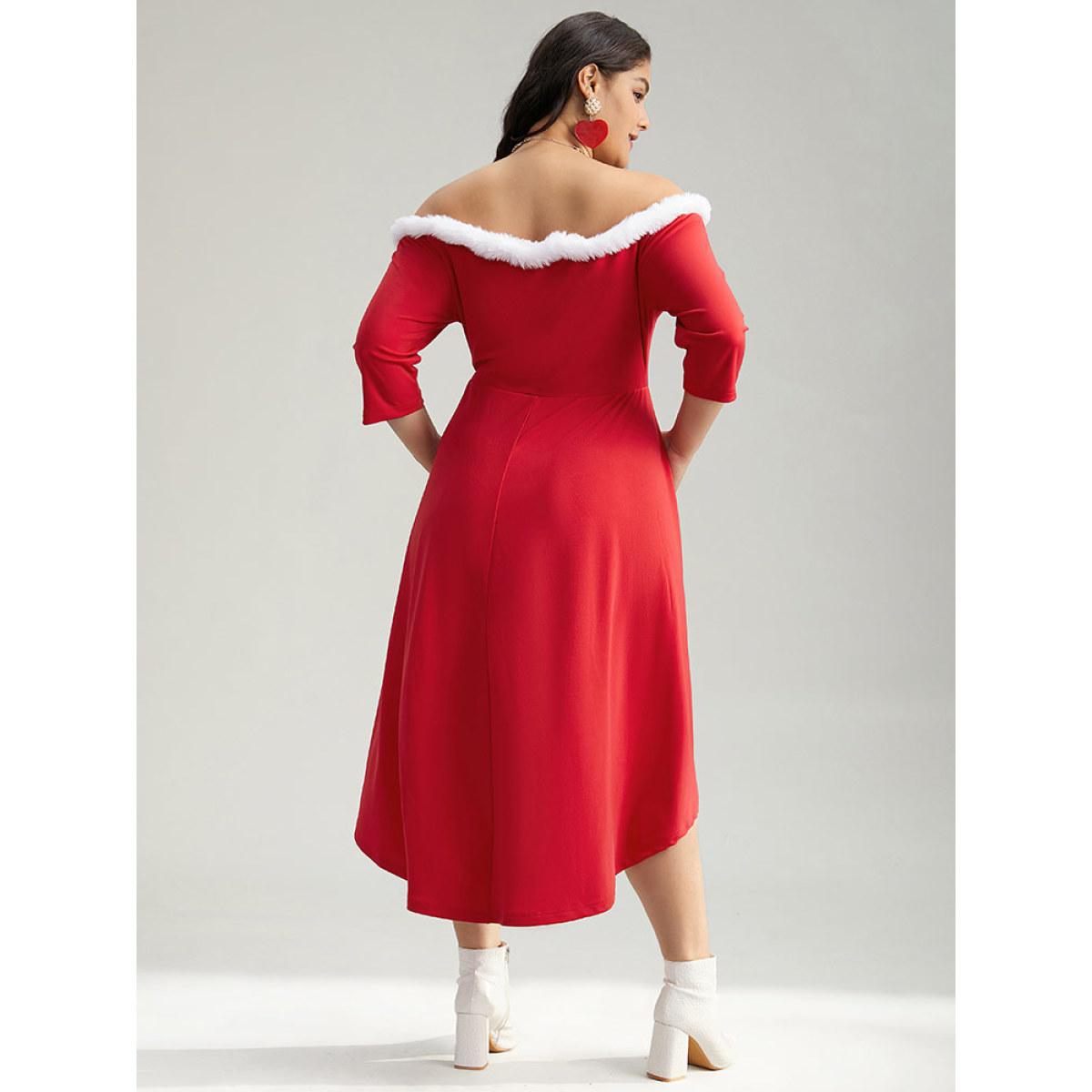 Plus Size Christmas Off Shoulder Fuzzy Trim High Low Hem Dress Red Women Party Patchwork One-shoulder neck Elbow-length sleeve Curvy Midi Dress BloomChic 26/4X