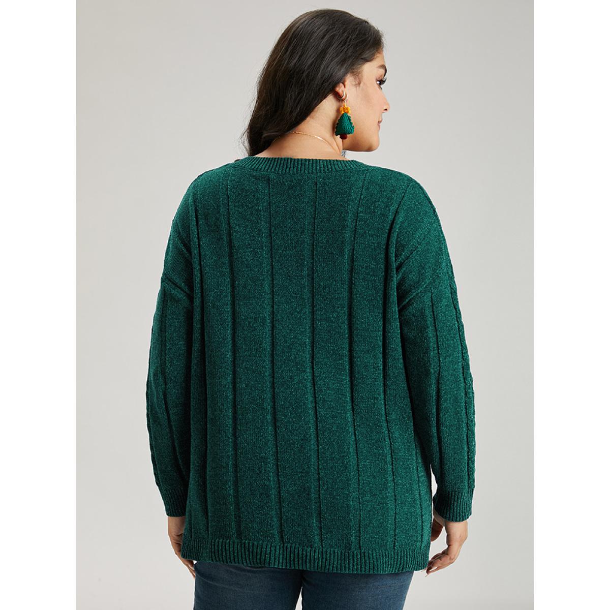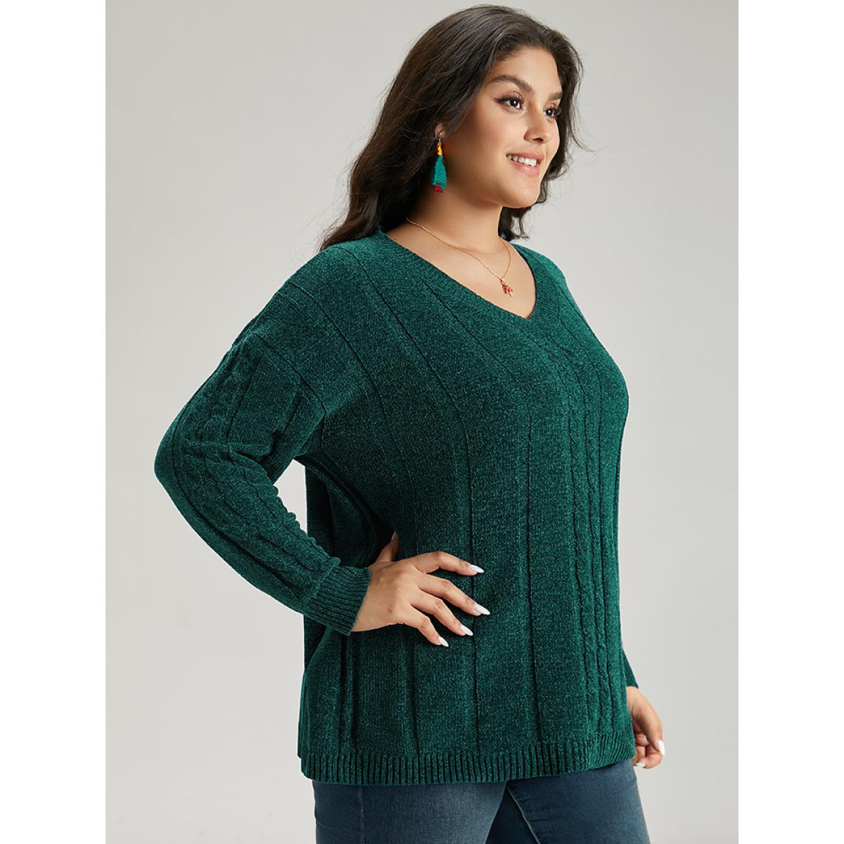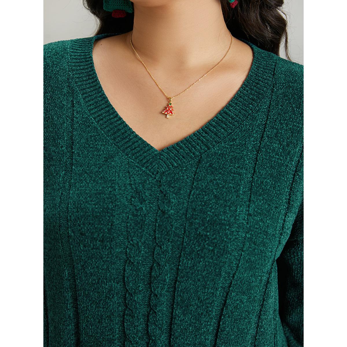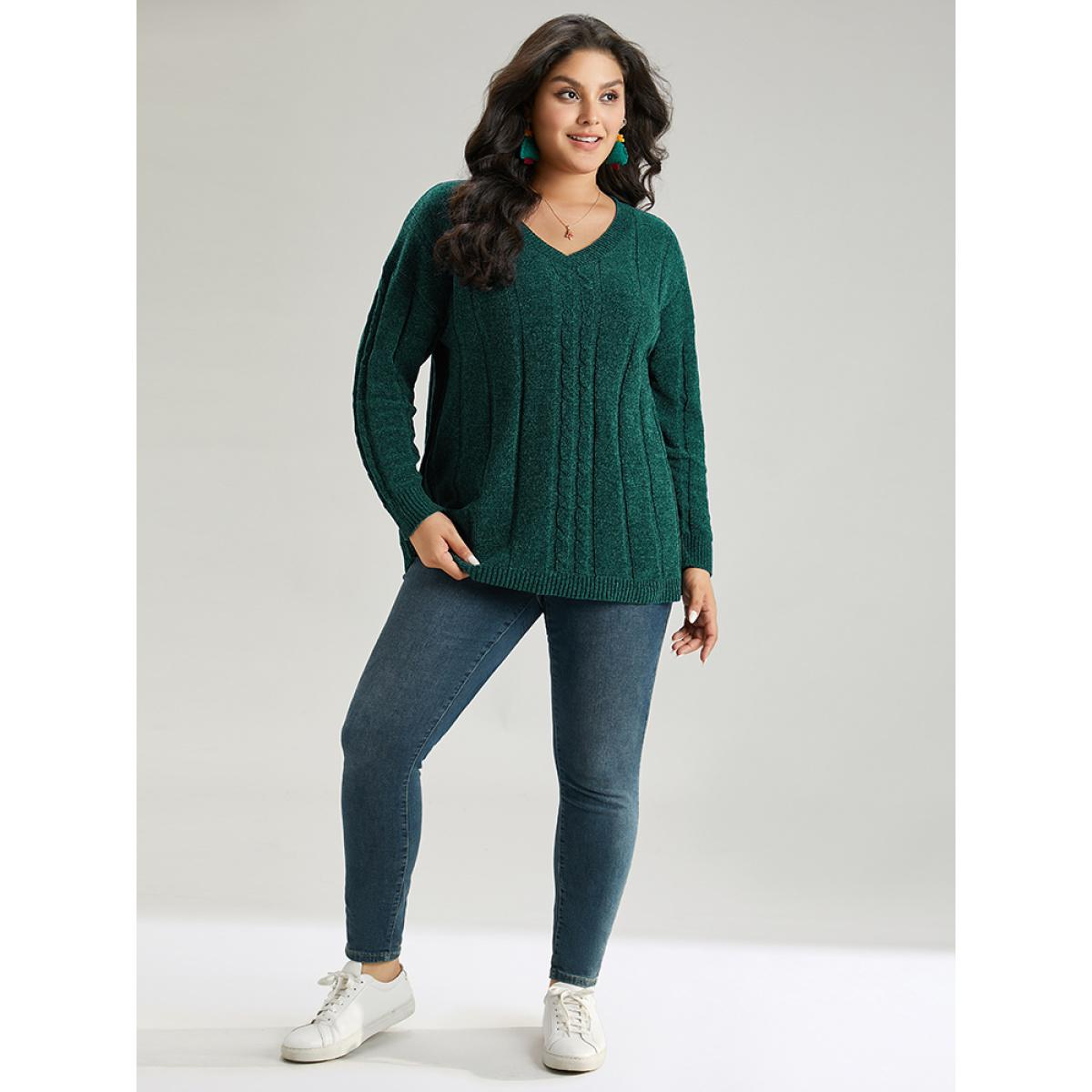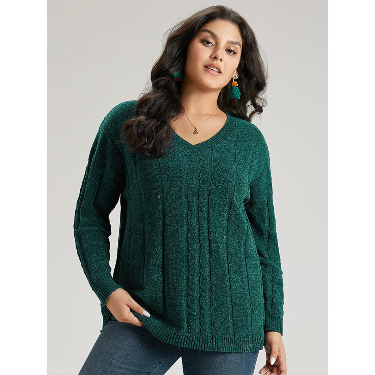 Plus Size Christmas Plain Cable Knit V Neck Pullover Emerald Women Casual Loose Long Sleeve V-neck Festival-Christmas Pullovers BloomChic 30/6X