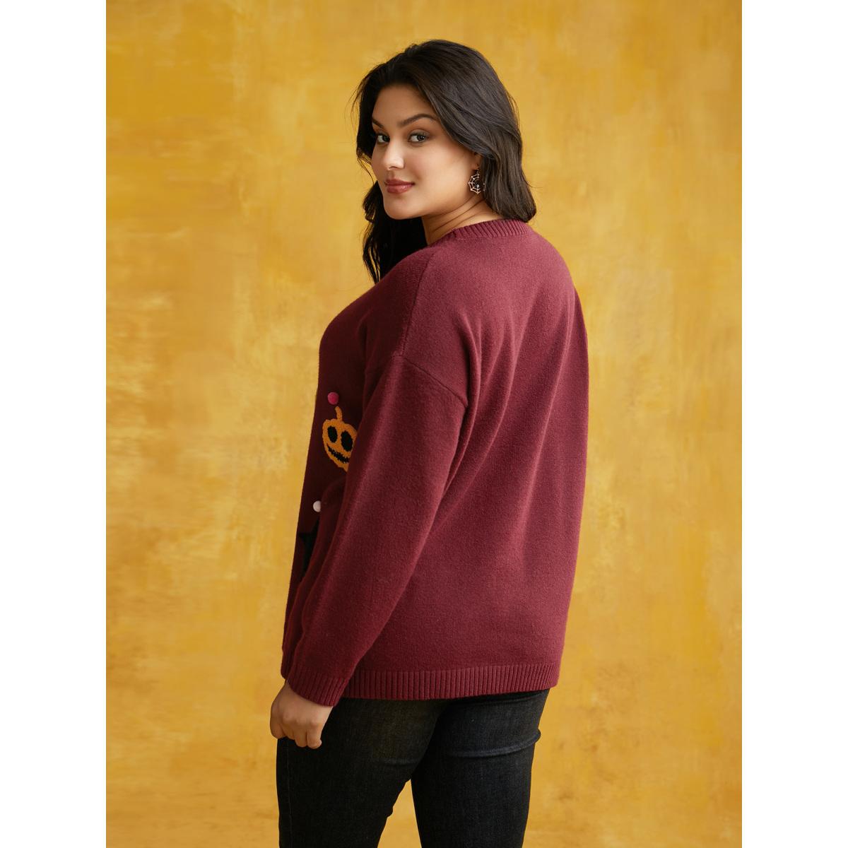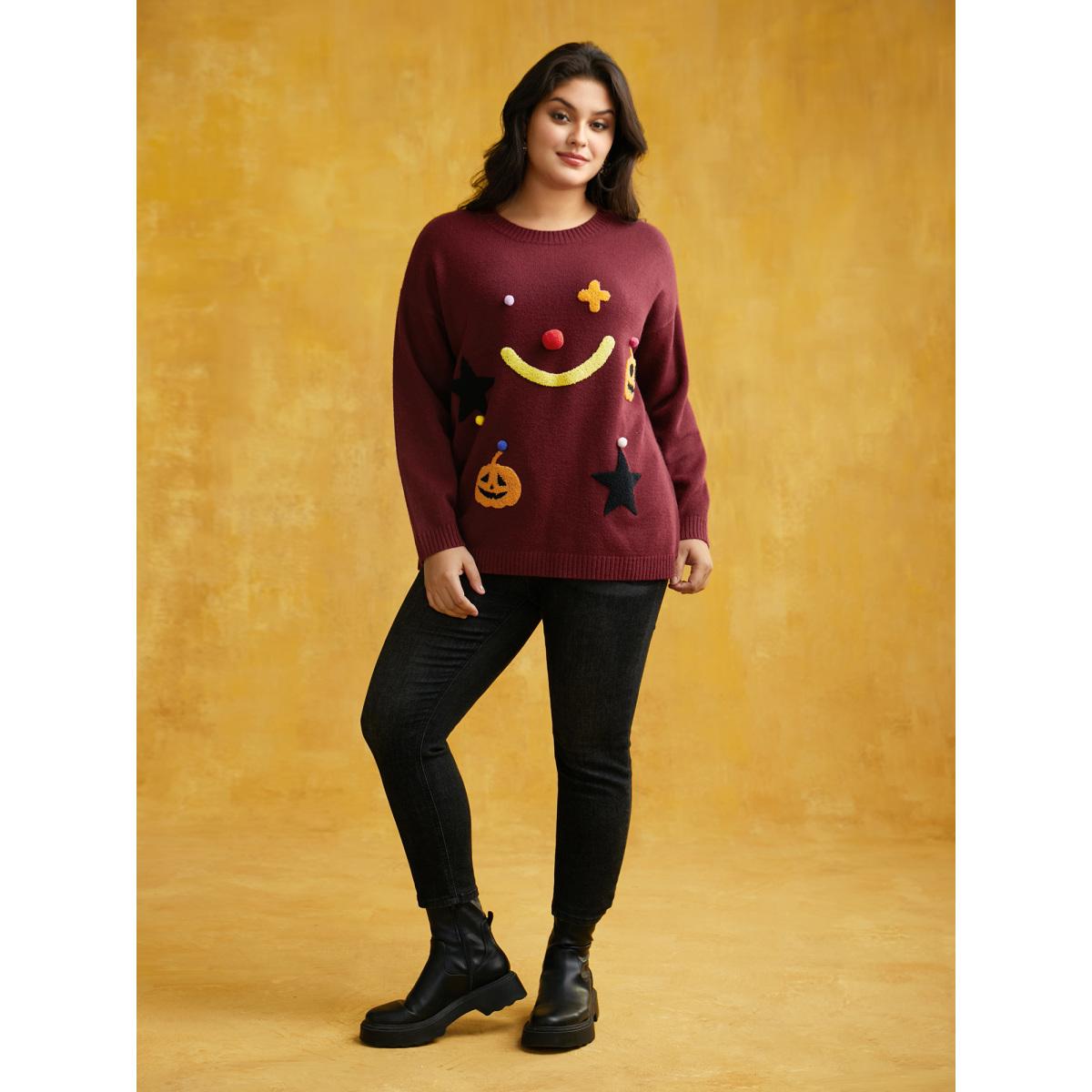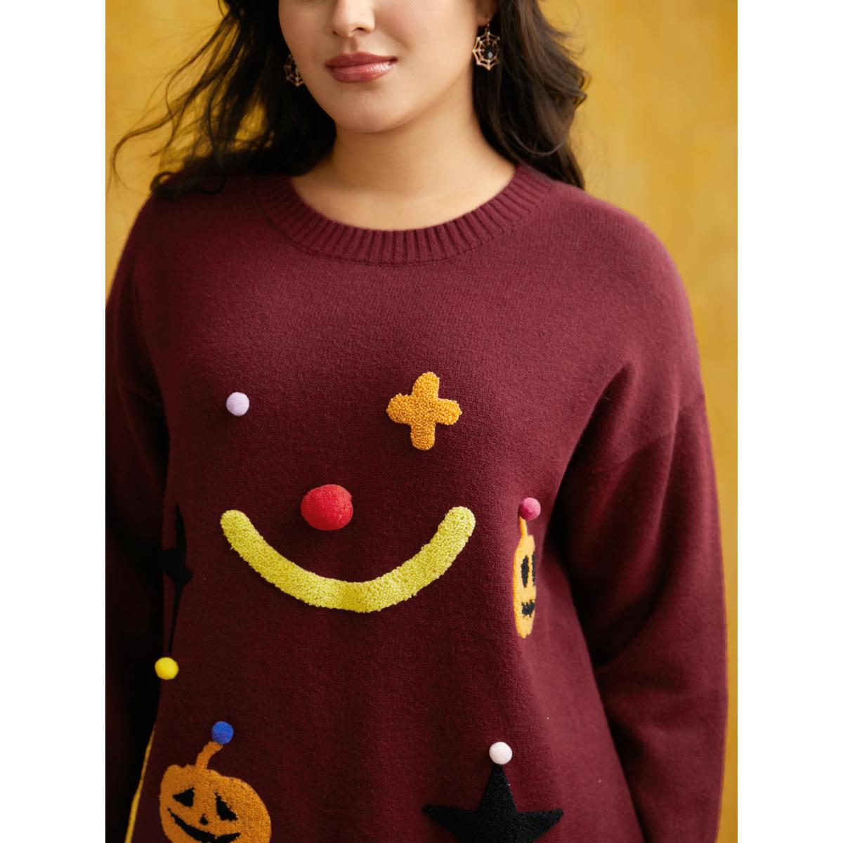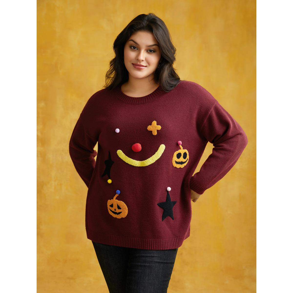 Plus Size Clown Pumpkin 3D Pompom Nose Pullover Burgundy Women Casual Loose Long Sleeve Round Neck Everyday Pullovers BloomChic 30/6X