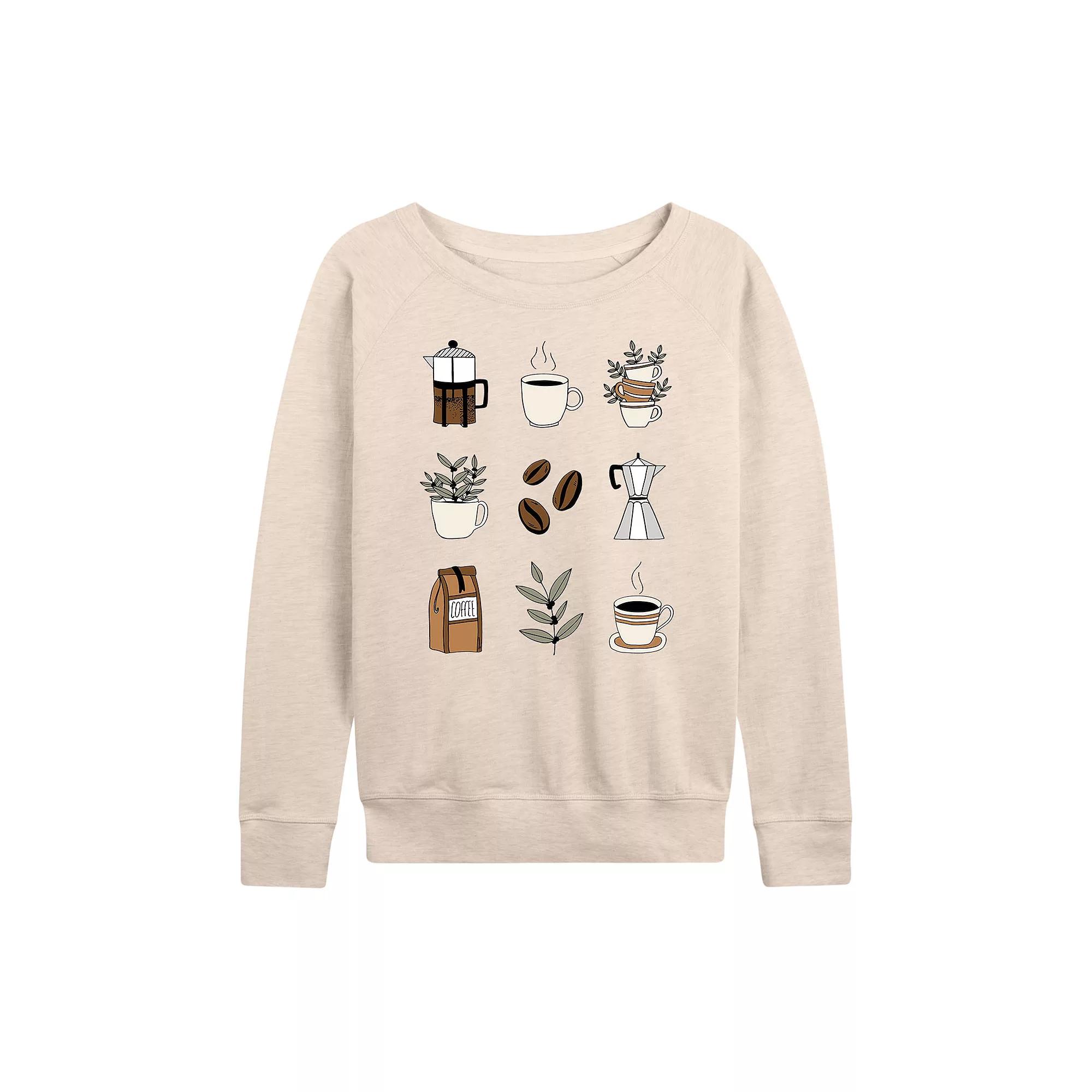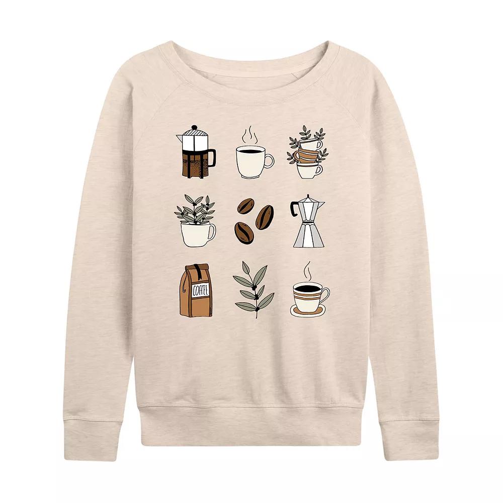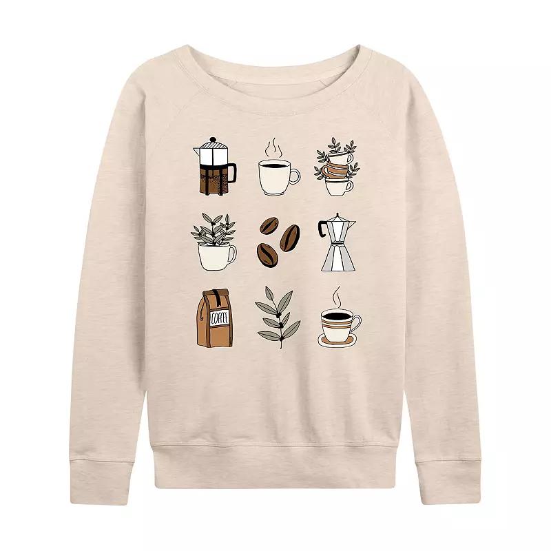 Birch Coffee Grid Pullover - Women & Plus. French terry pullover featuring a caffeine-inspired graphic and raglan-style sleeves. Size S: 24 long from high point of shoulder to hemLightweight French terry knit97% cotton / 3% polyesterMachine wash; tumble dryImported