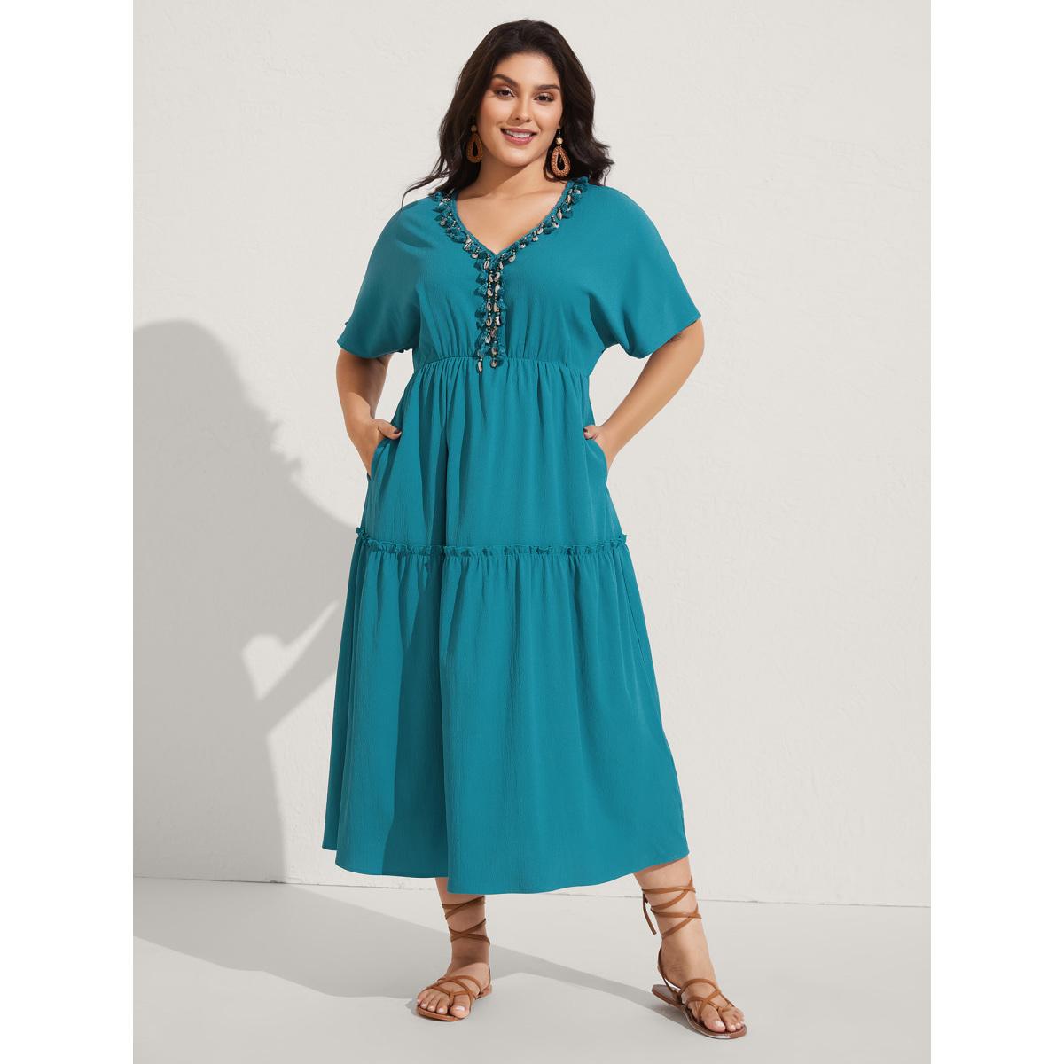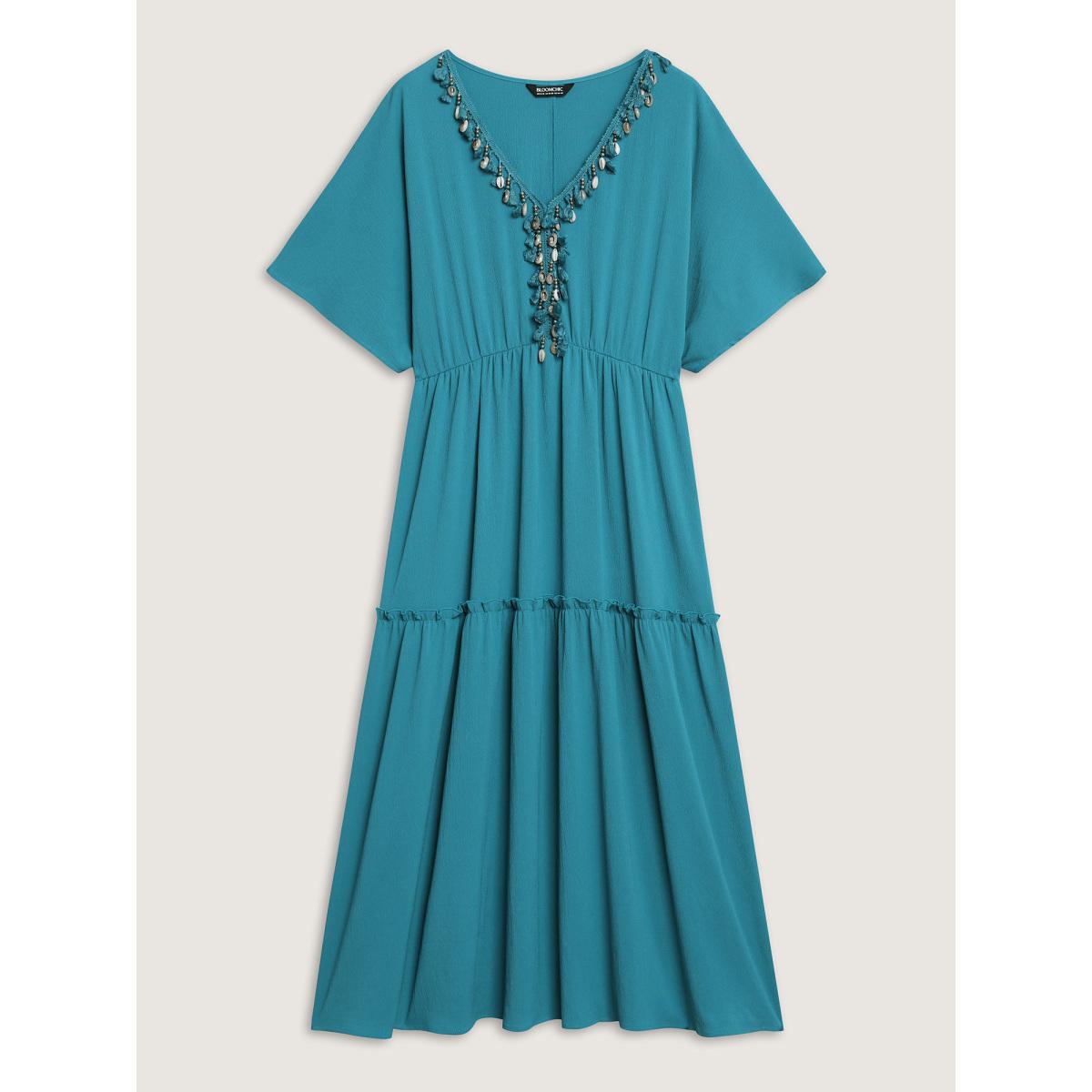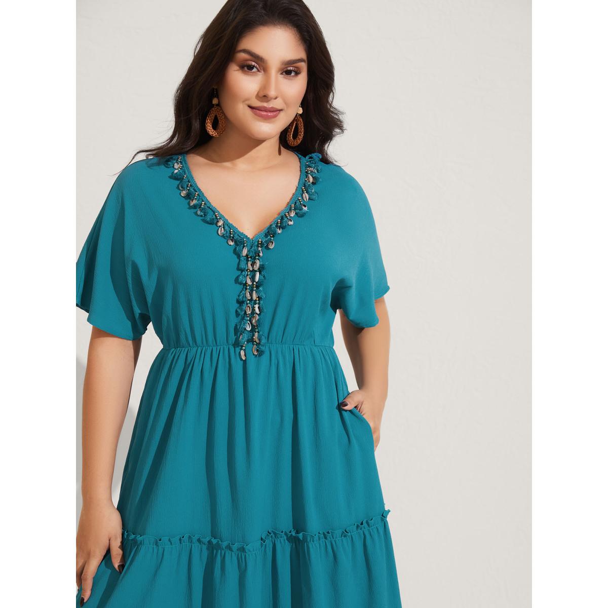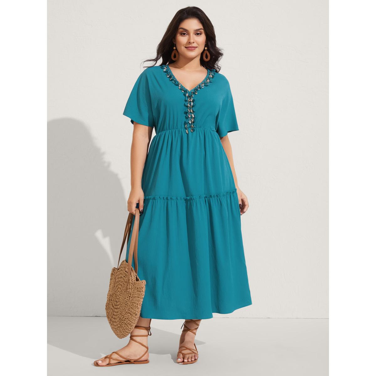 Plus Size Collar Seashells Tassels Tiered Maxi Dress Aegean Women V-neck Short sleeve Curvy BloomChic 22-24/3X