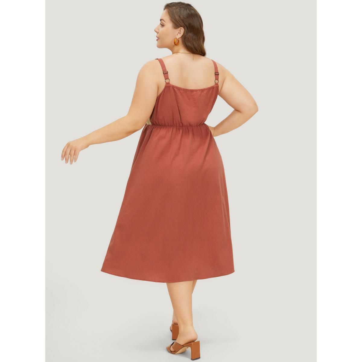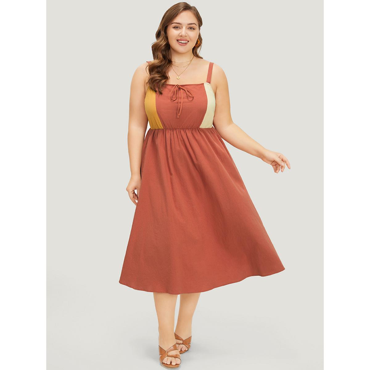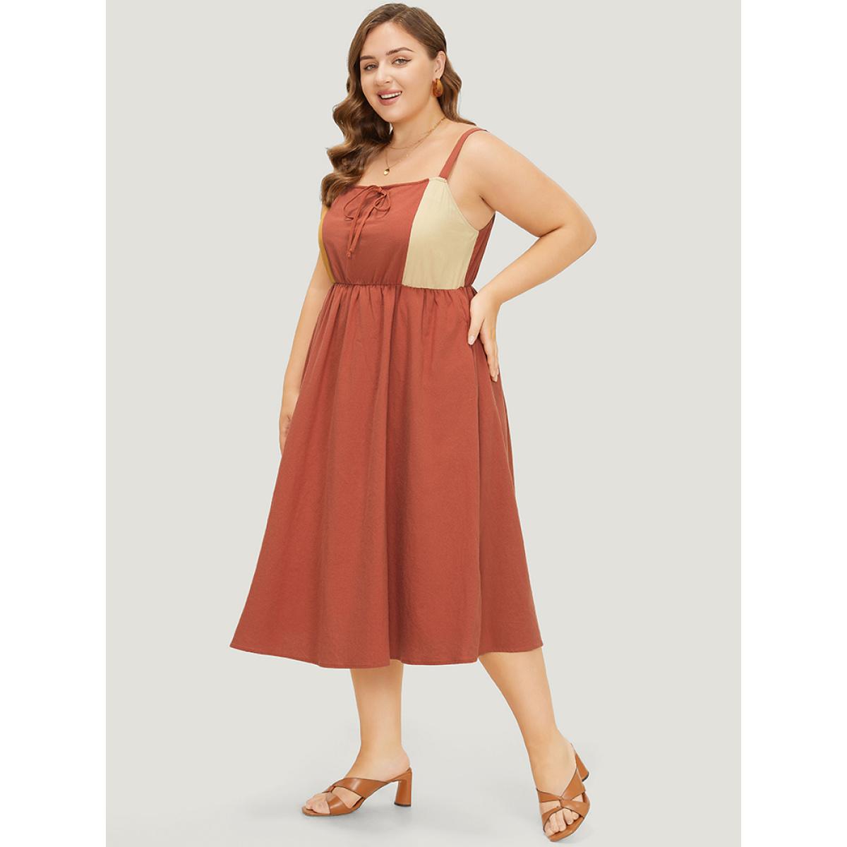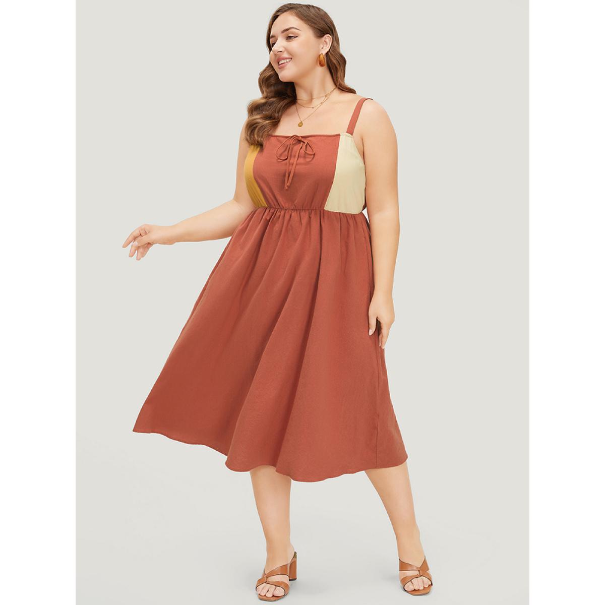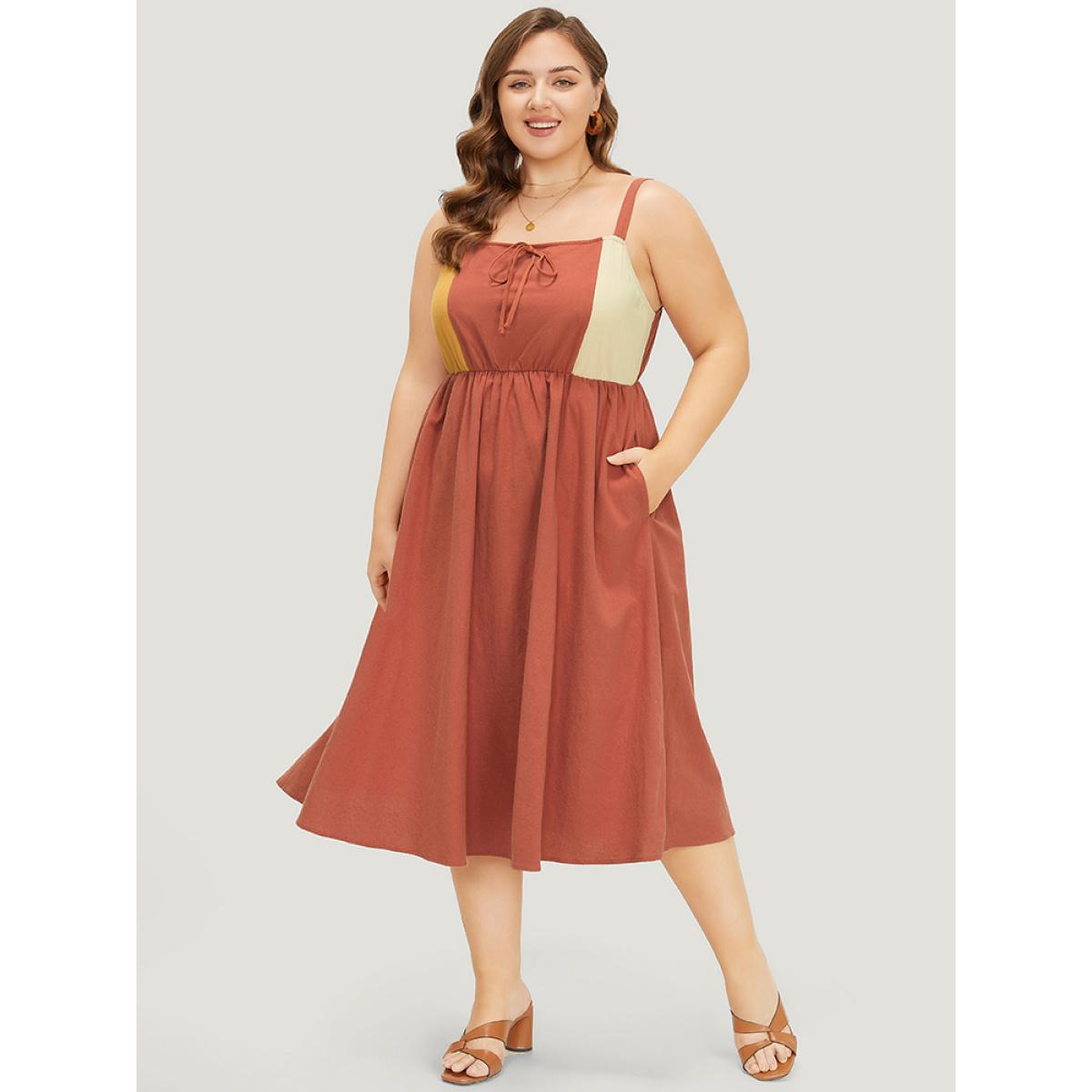 Plus Size Color Block Contrast Pocket Flutter Hem Knot Cami Dress Rust Women Casual Adjustable Straps Spaghetti Strap Sleeveless Curvy Midi Dress BloomChic 22-24/3X