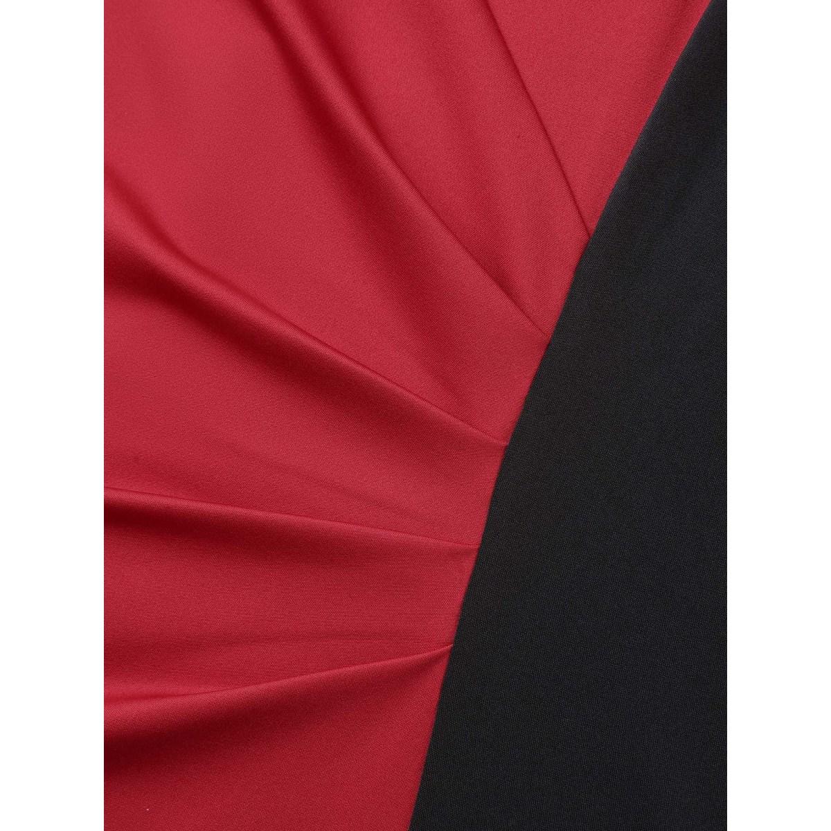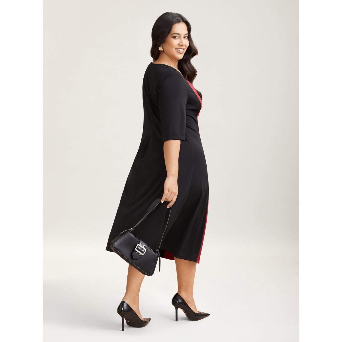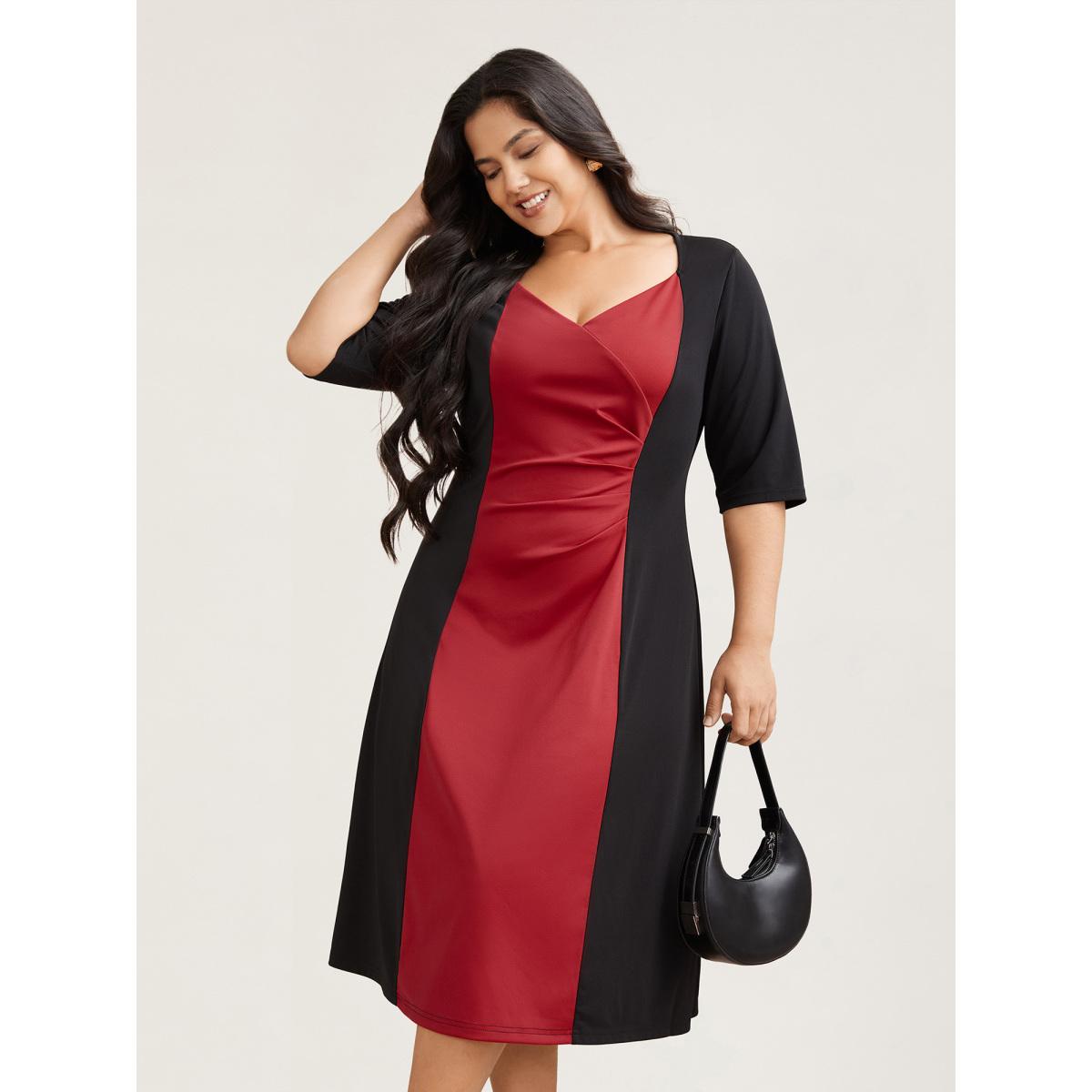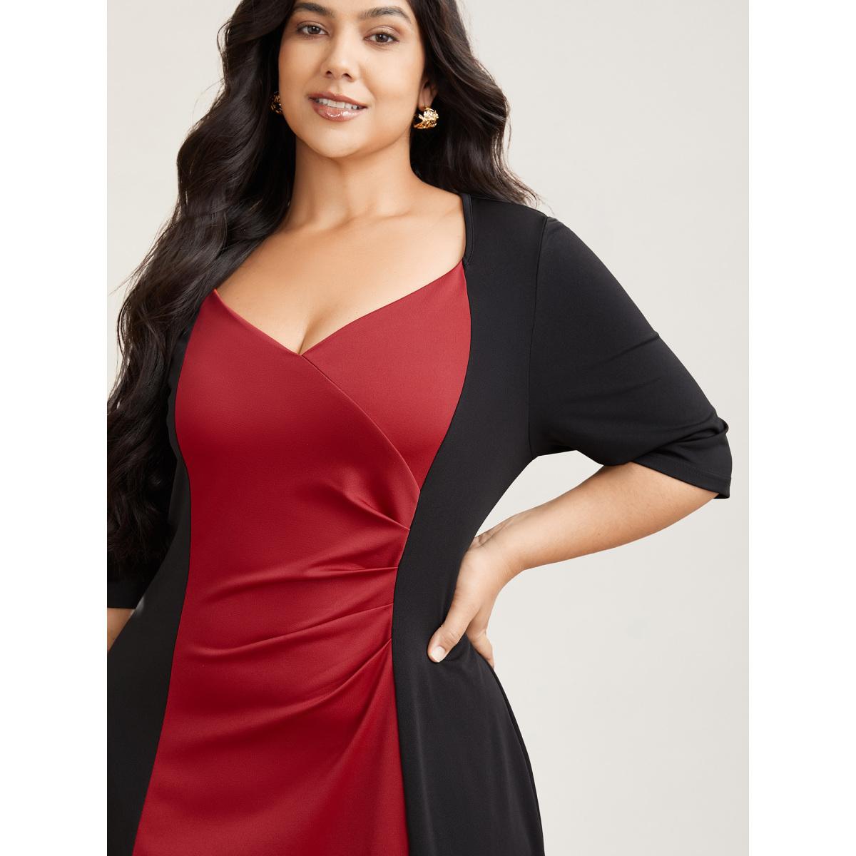 Plus Size Color Block Fitted Waist Overlap Neck Dress Burgundy Women At the Office Contrast Knit Dresses Bloomchic 14-16/1X
