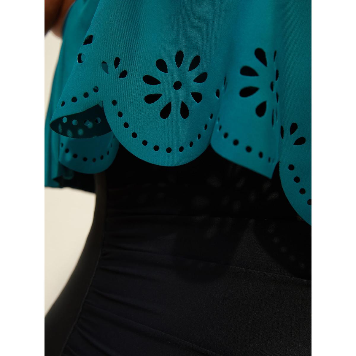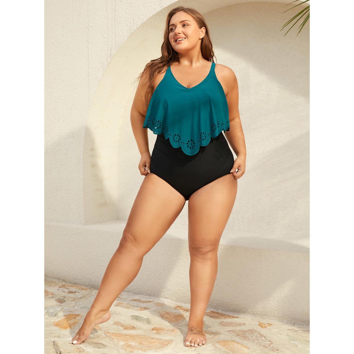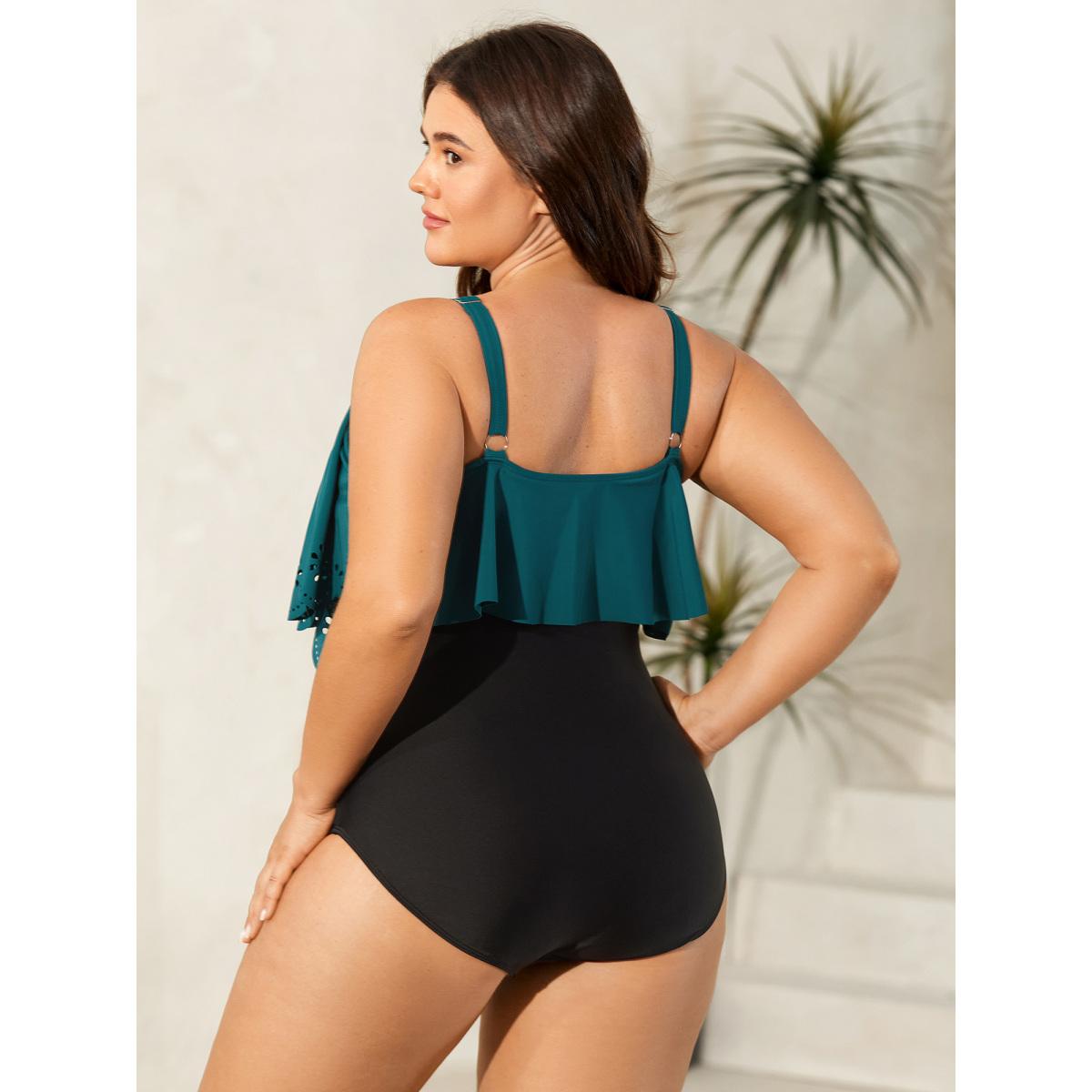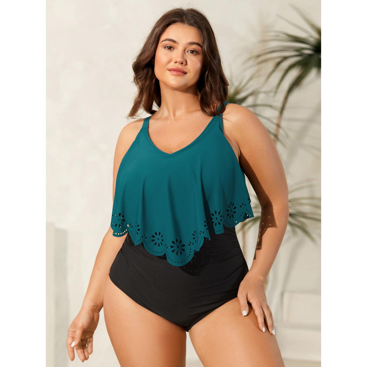 Plus Size Color Block Laser-Cut One-Piece Swimsuit Women's Swimwear Cyan Beach Laser Curve Bathing Suits High stretch One Pieces BloomChic 22-24/3X