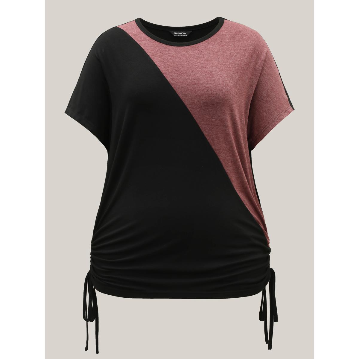 Plus Size Color Block Ruched Drawstring T-Shirt Black Women Leisure Contrast Round Neck Casual T-shirts BloomChic 28/5X