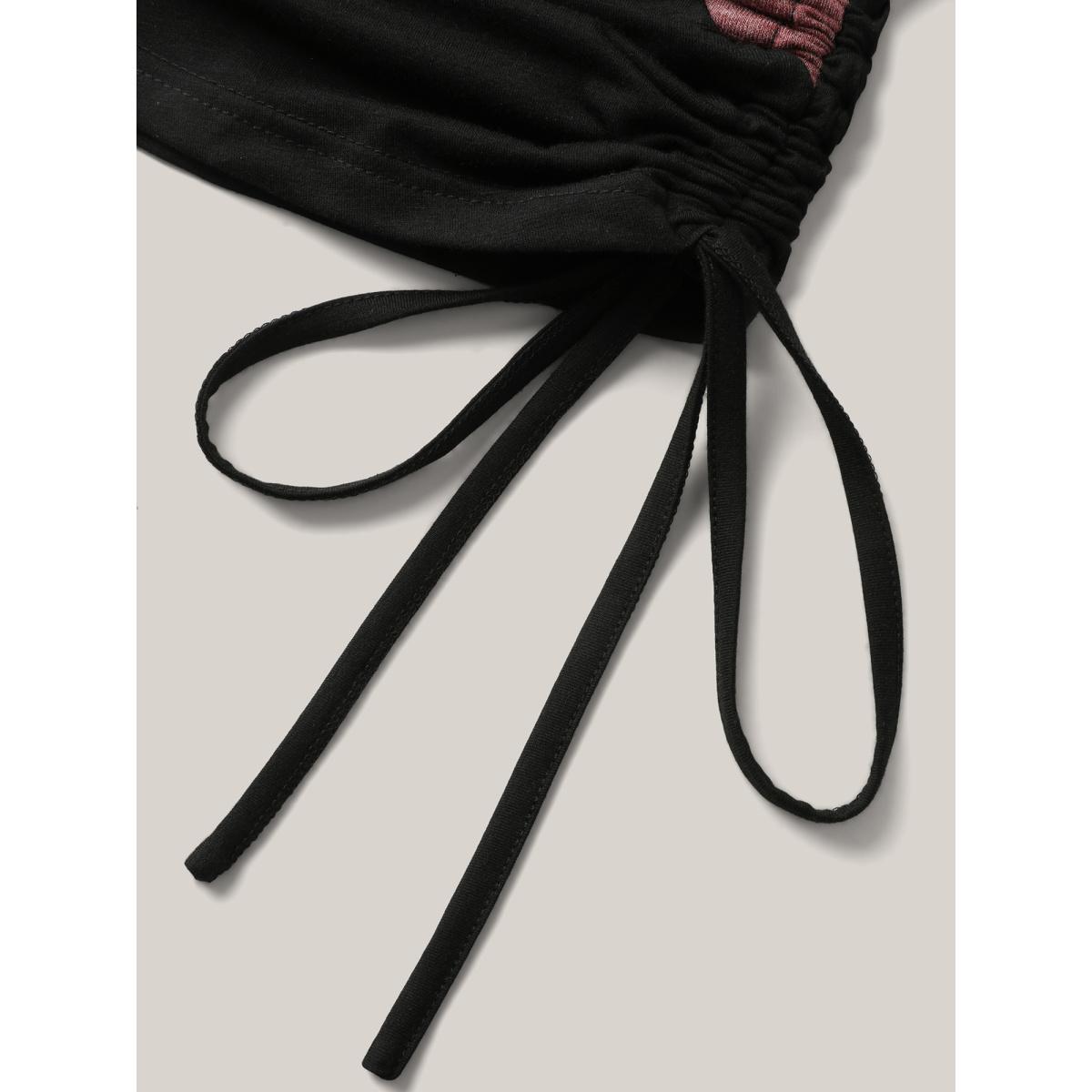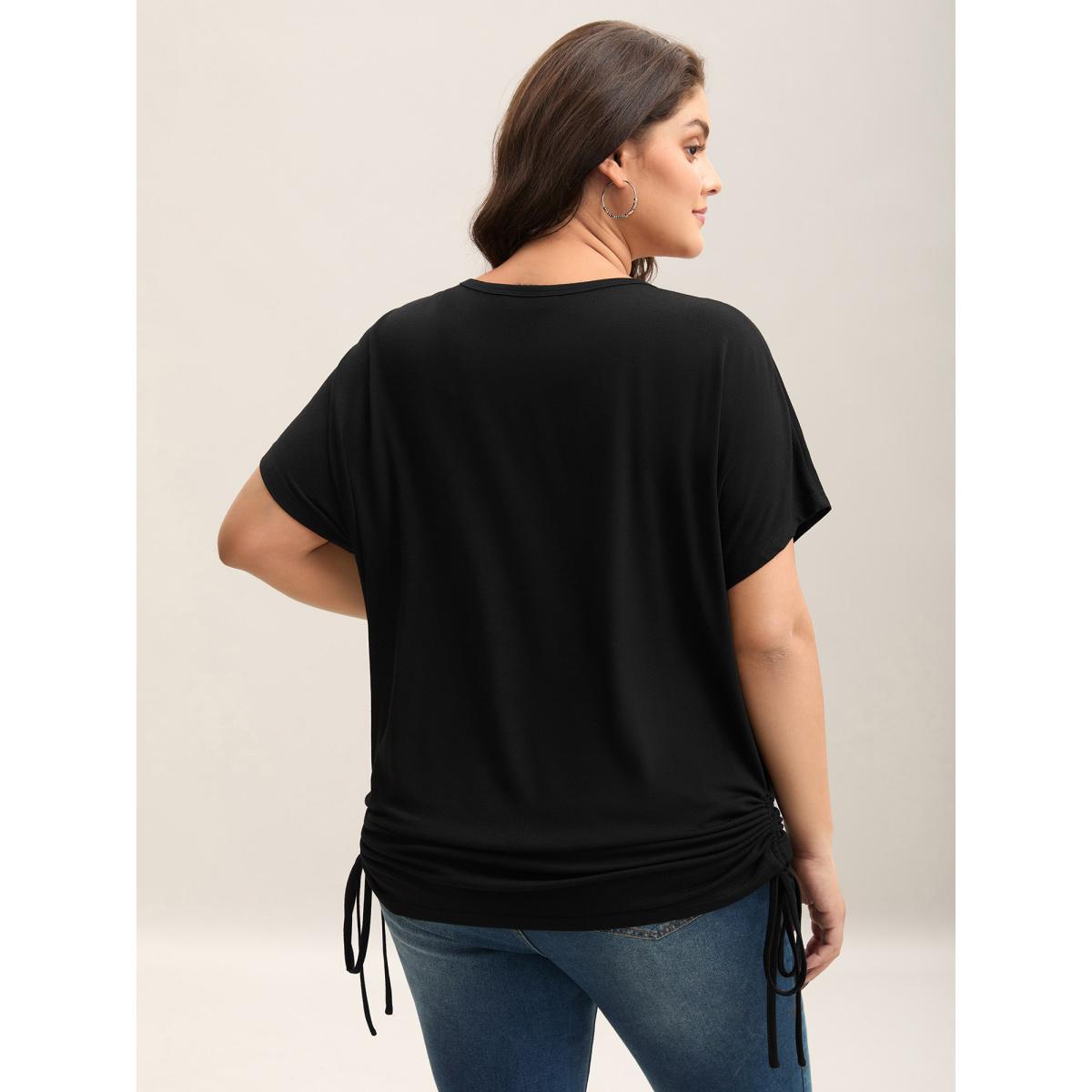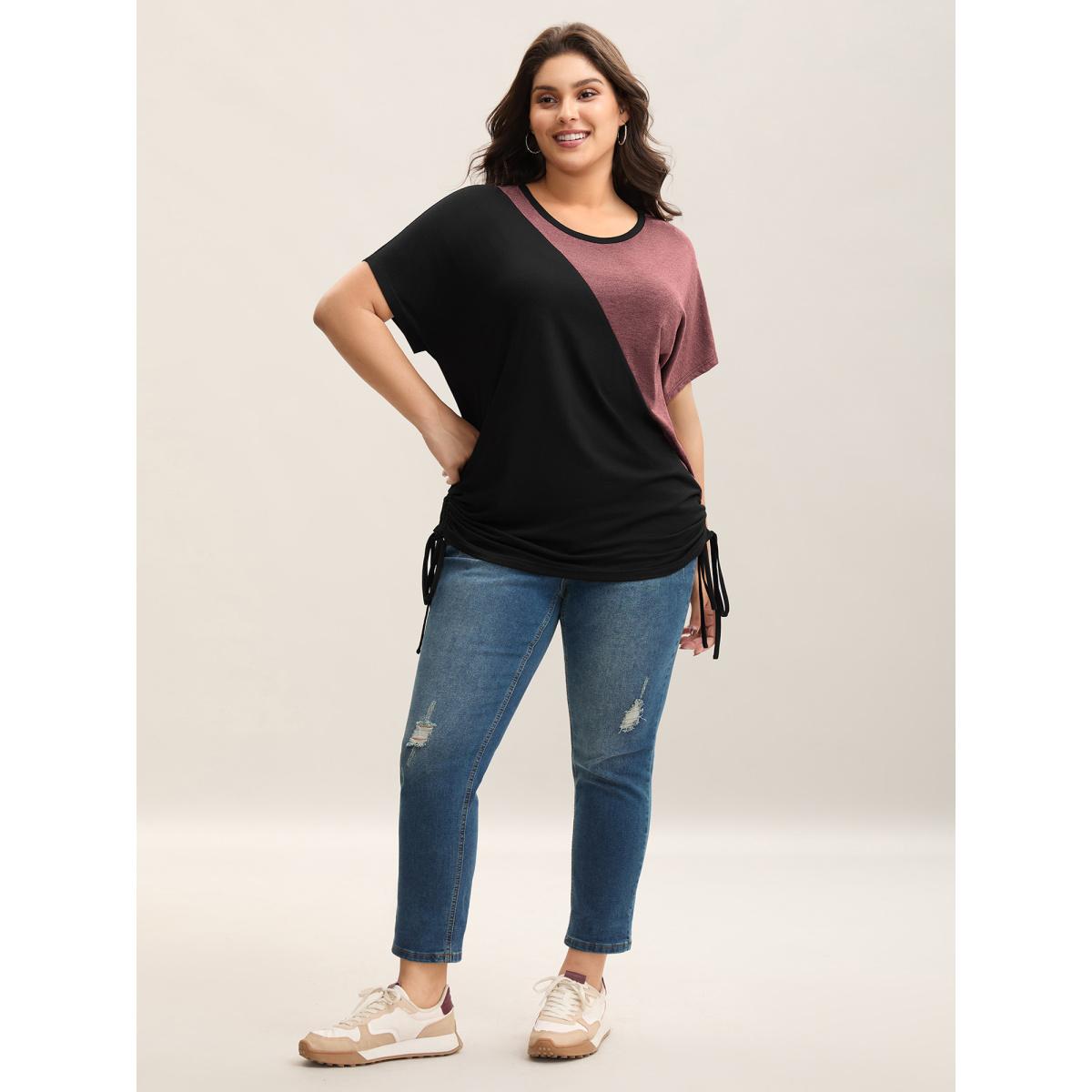 Plus Size Color Block Ruched Drawstring T-Shirt Black Women Leisure Contrast Round Neck Casual T-shirts BloomChic 28/5X Product Image