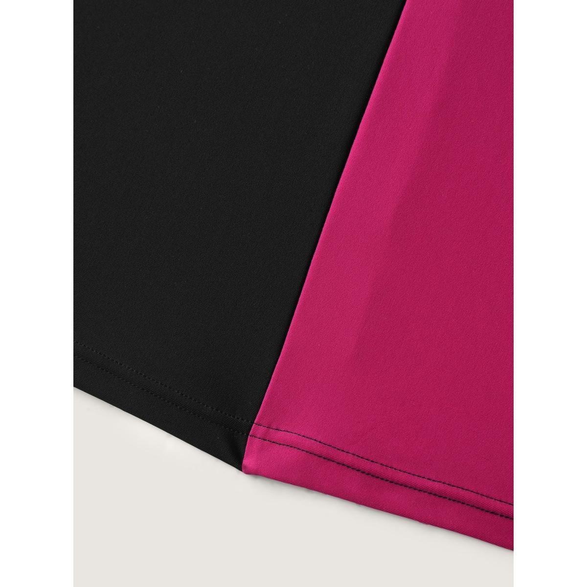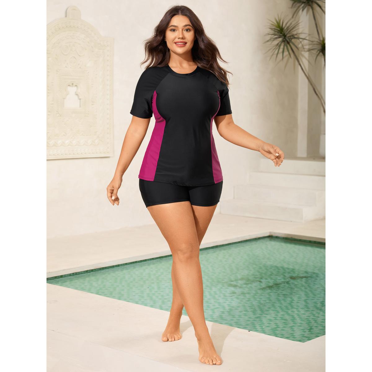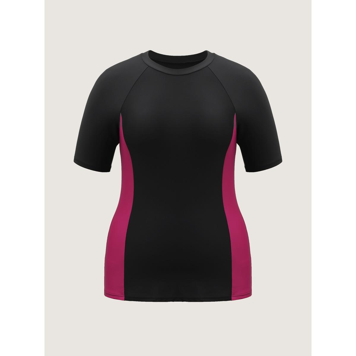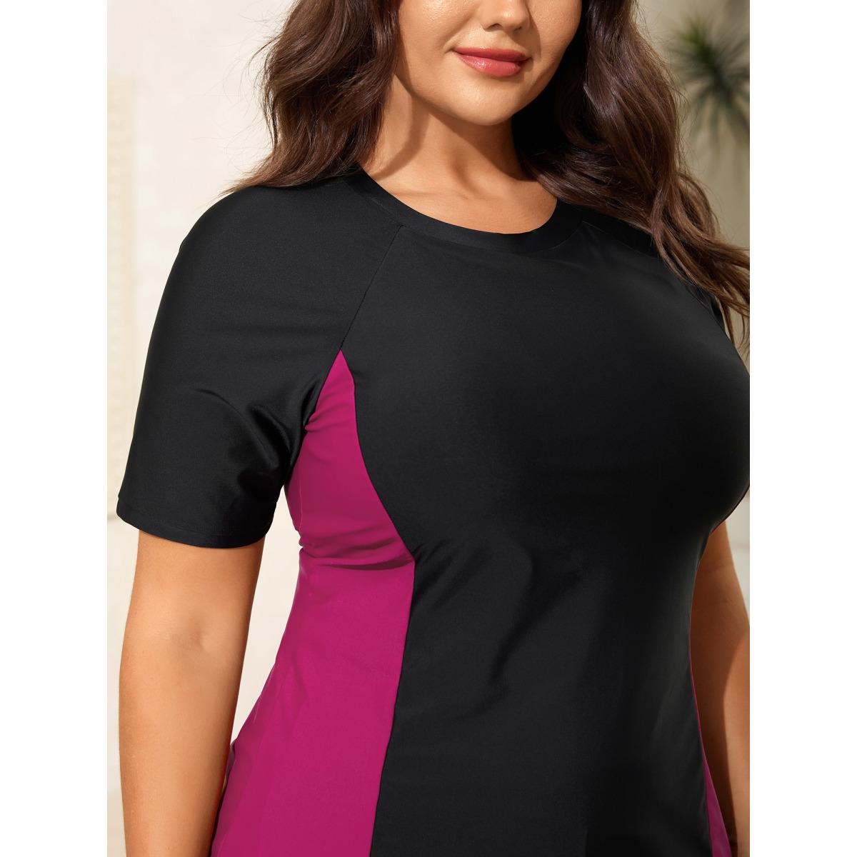Plus Size Color Block Sculpted Raglan Swim Top Women's Swimwear RedViolet Beach High stretch Skinny Round Neck Curve Swim Tops BloomChic 12/L