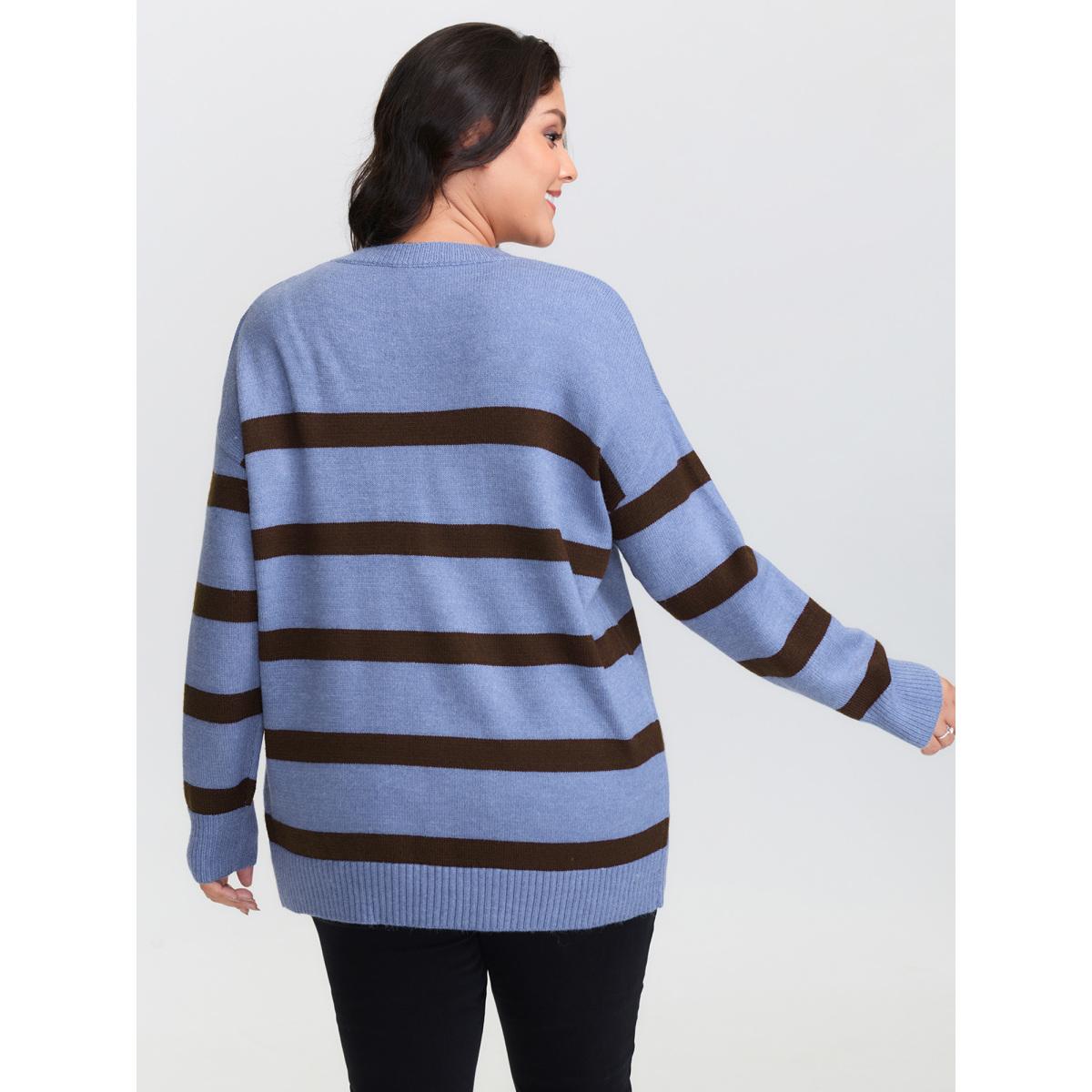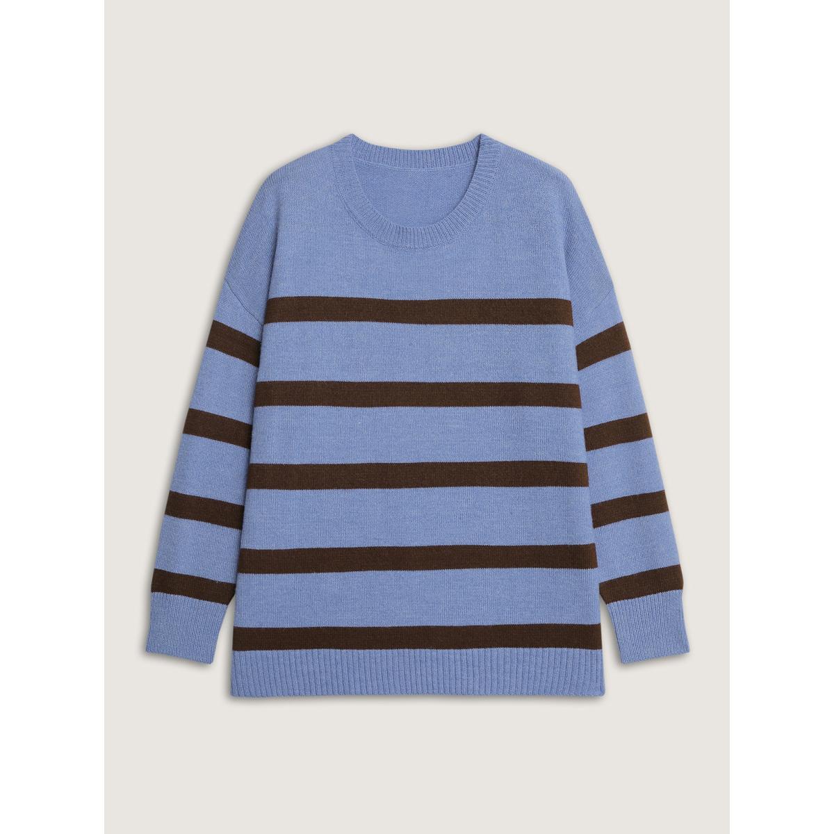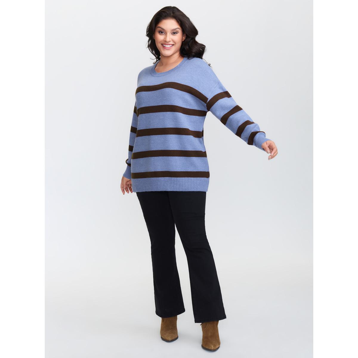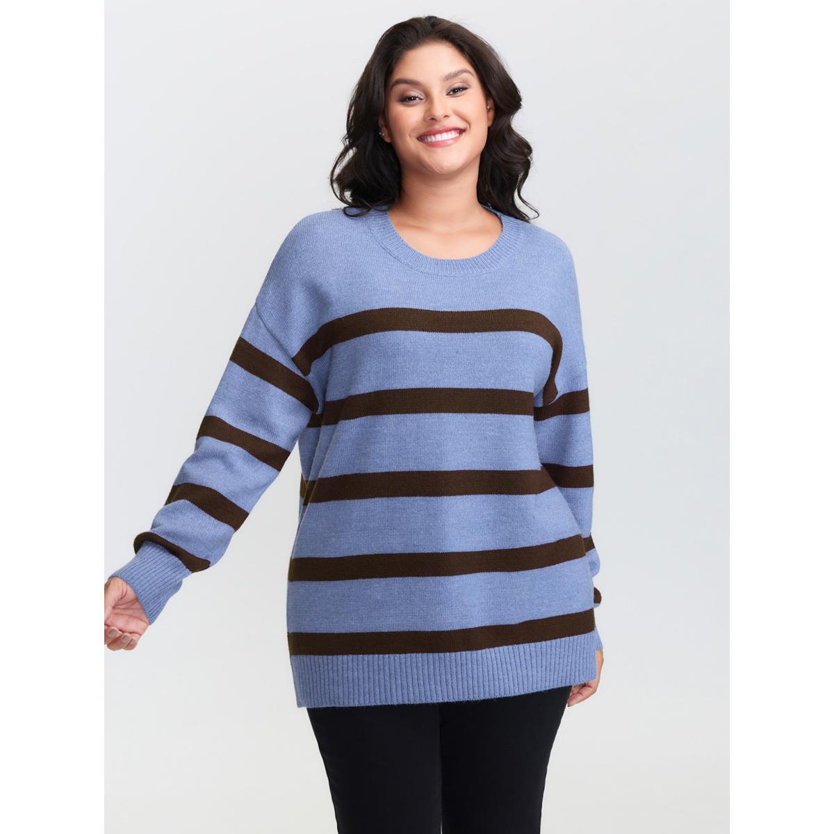 Plus Size Color Contrast Stripe Heather Textured Pullover Stone Women Leisure Loose Long Sleeve Round Neck Casual Pullovers BloomChic 28/5X