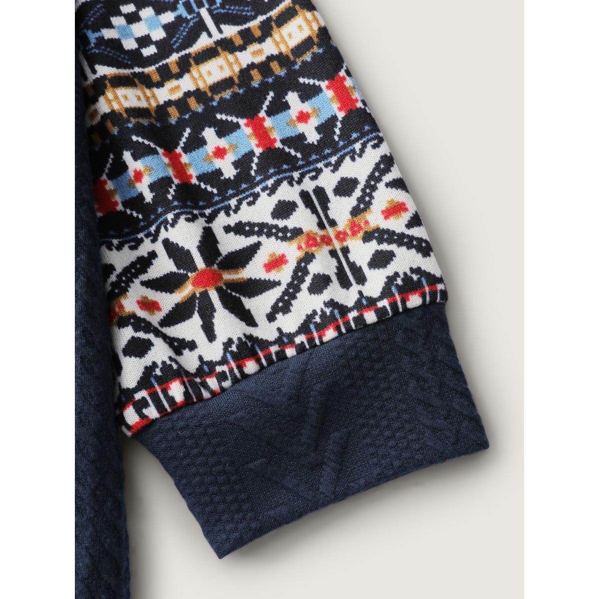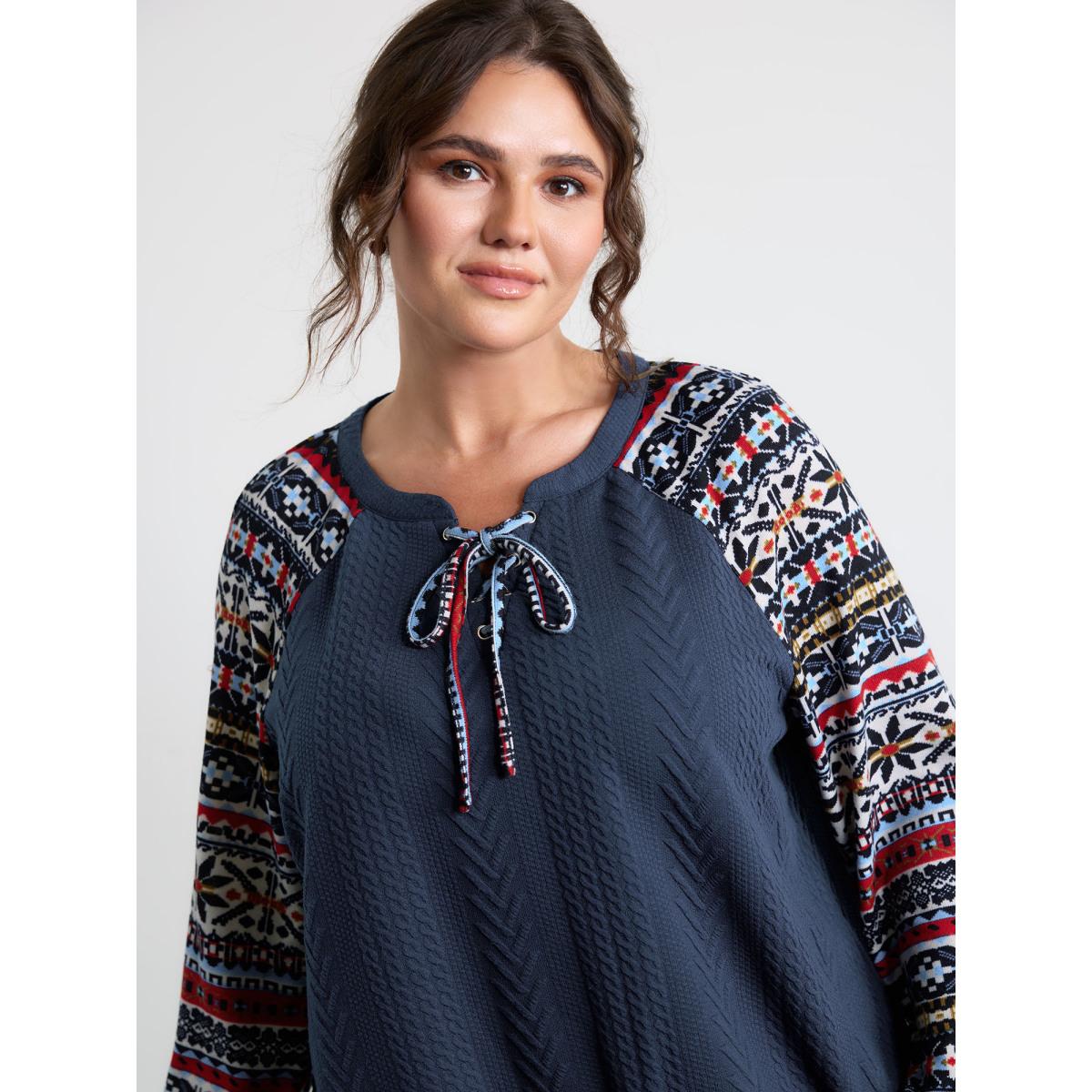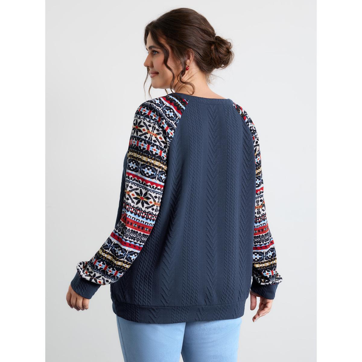 Plus Size Color Contrast Stripes Raglan Sleeve Sweatshirt Women Indigo Leisure Texture Flat collar with V-notch Casual Sweatshirts BloomChic 12/L