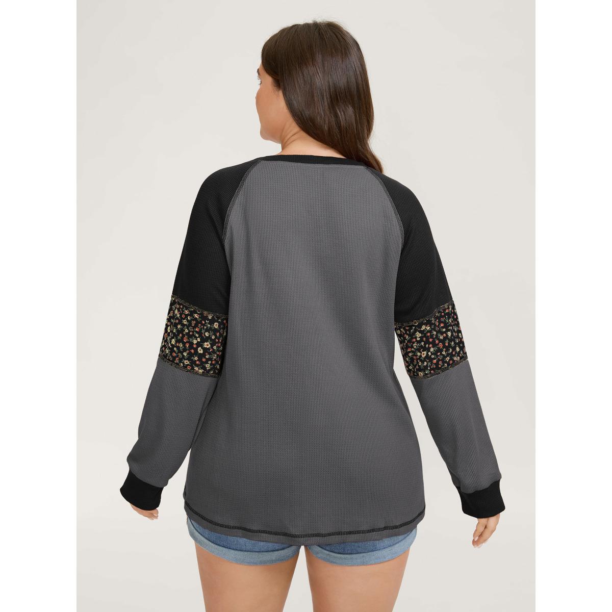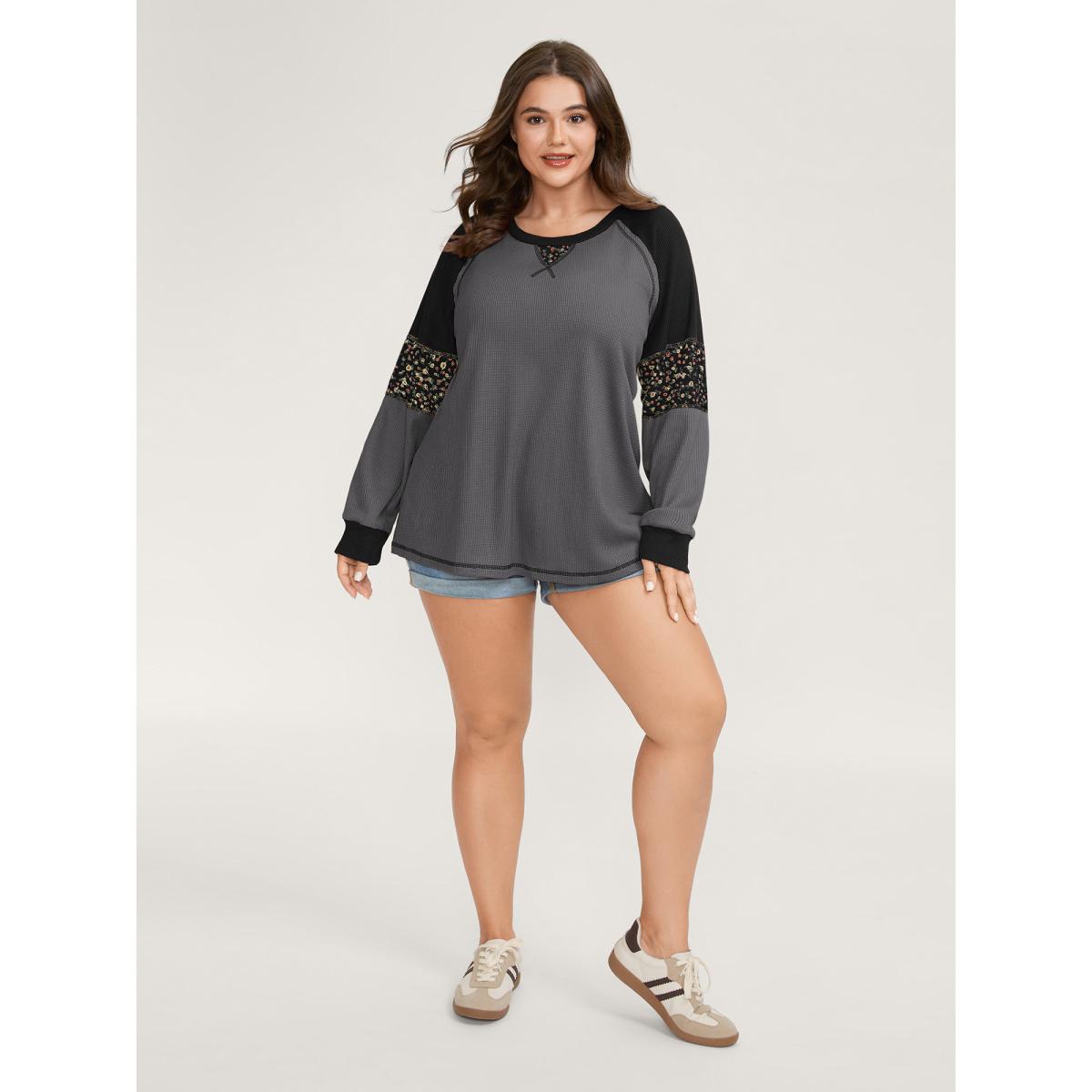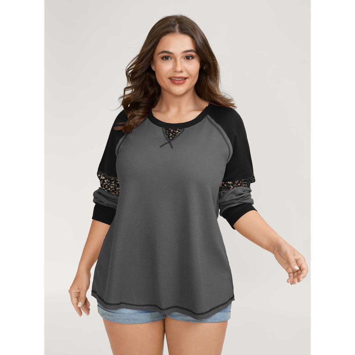 Plus Size Color Contrast Waffle Knit T-Shirt DimGray Women Leisure Topstitching Round Neck Casual T-shirts BloomChic 22-24/3X Product Image