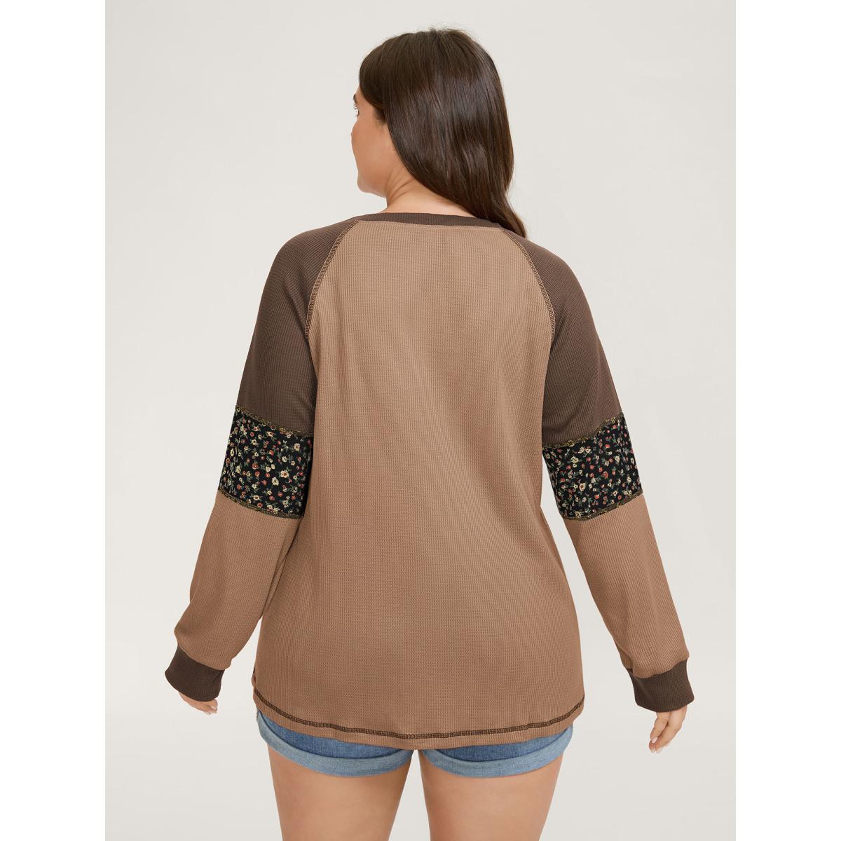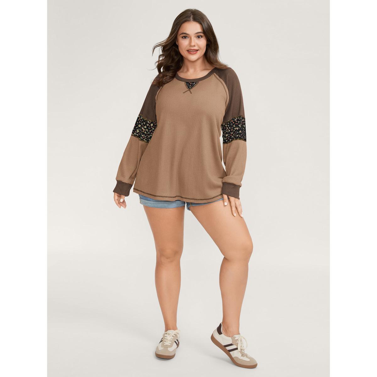 Plus Size Color Contrast Waffle Knit T-Shirt LightBrown Women Leisure Topstitching Round Neck Casual T-shirts BloomChic 12/L