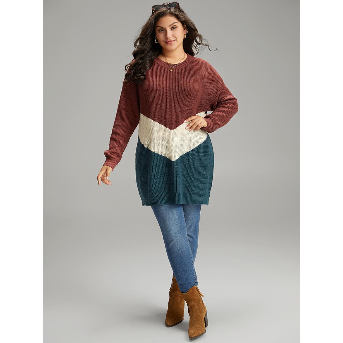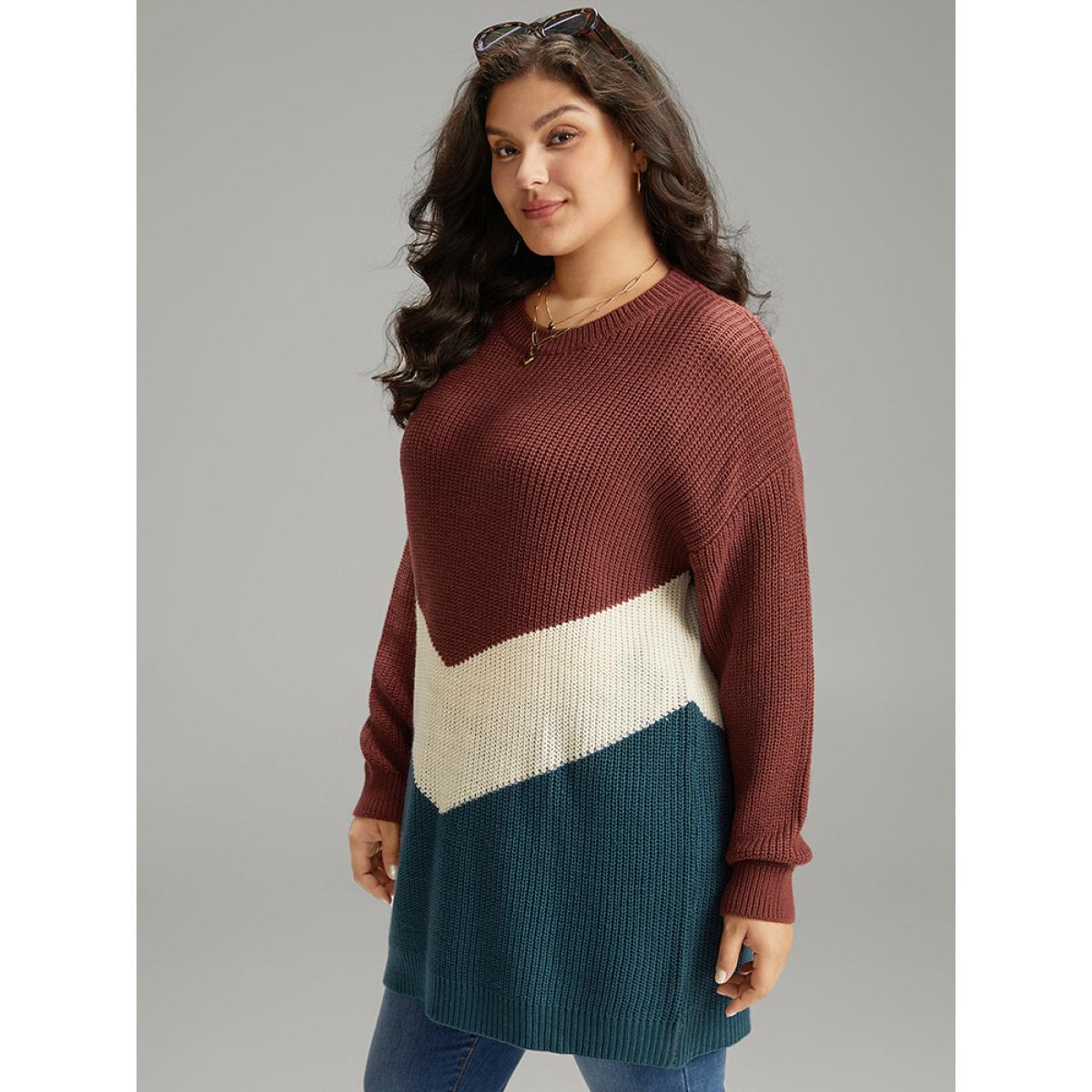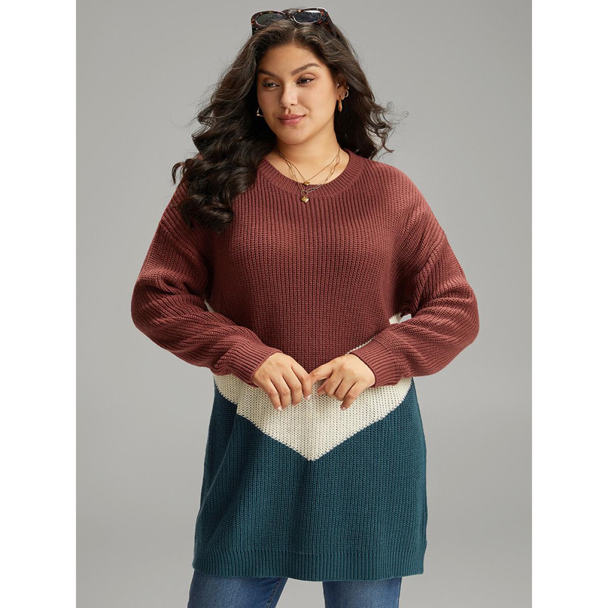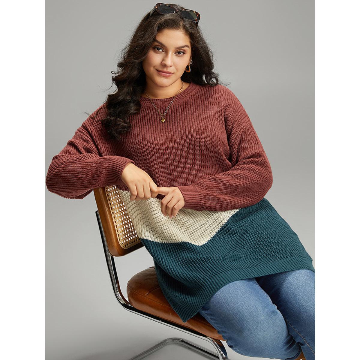Plus Size Colorblock Contrast Elastic Cuffs Pullover Multicolor Women Casual Loose Long Sleeve Round Neck Dailywear Pullovers BloomChic 12/L