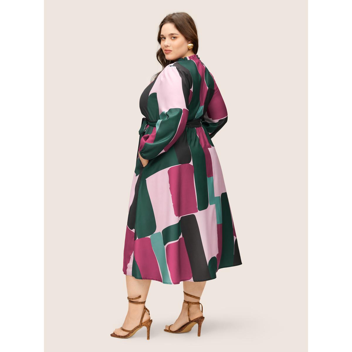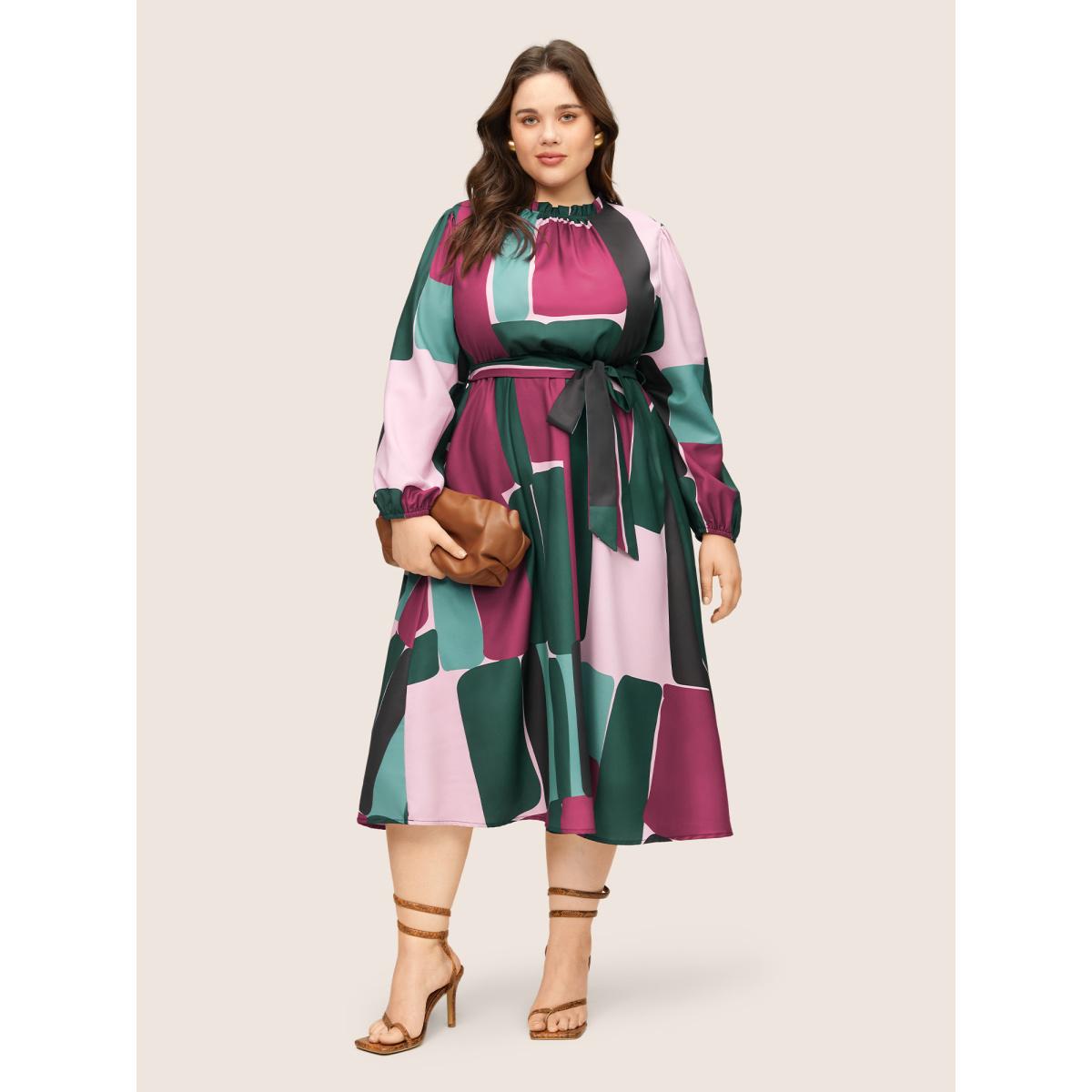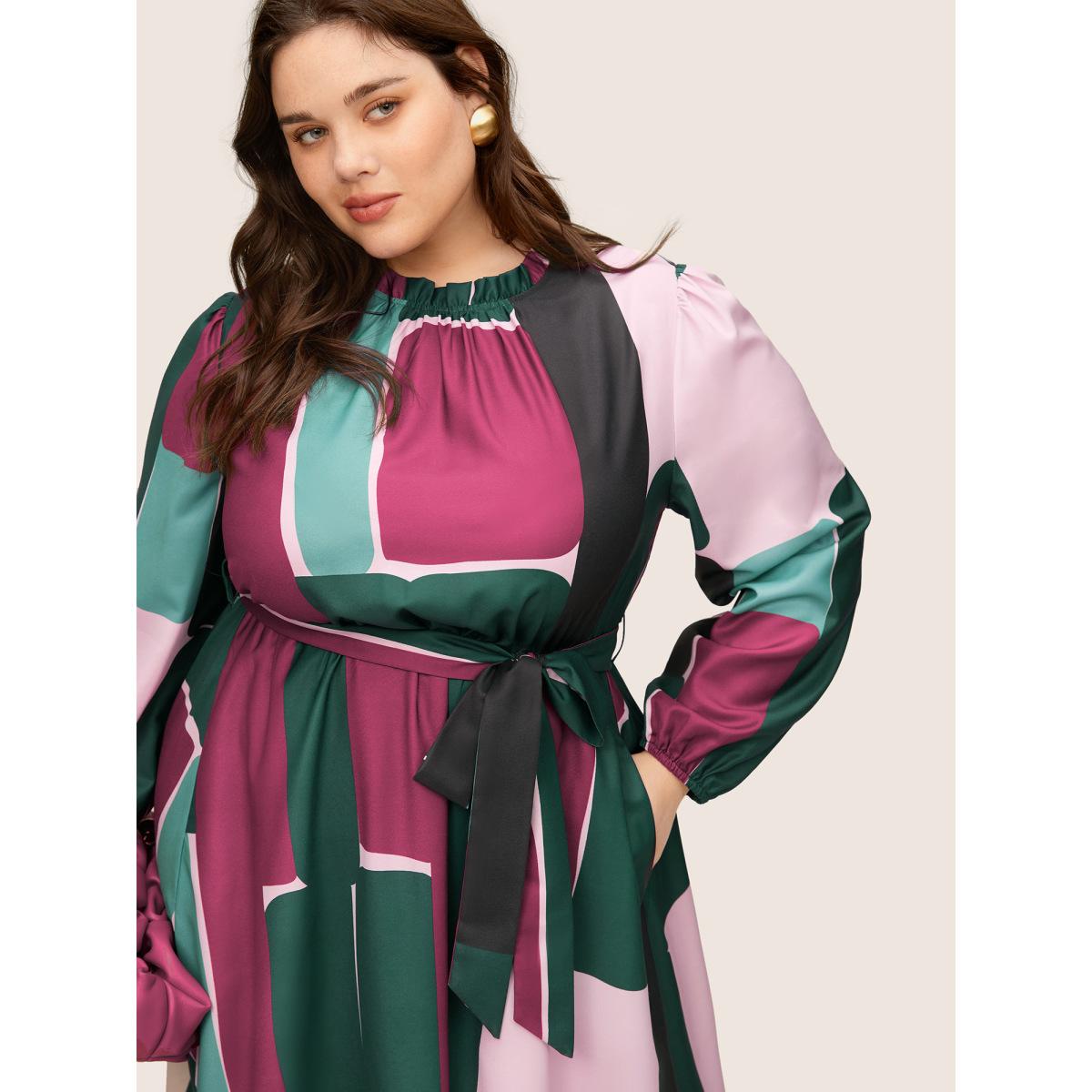 Plus Size Colorblock Contrast Gathered Frill Trim Belted Dress RedViolet Women Elegant Non Mock Neck Long Sleeve Curvy Midi Dress BloomChic 12/L