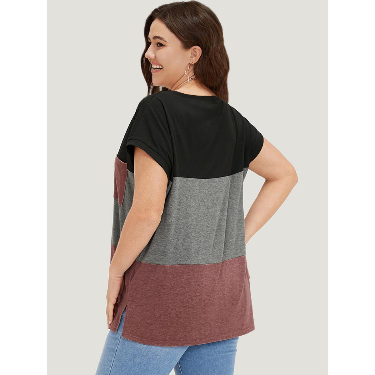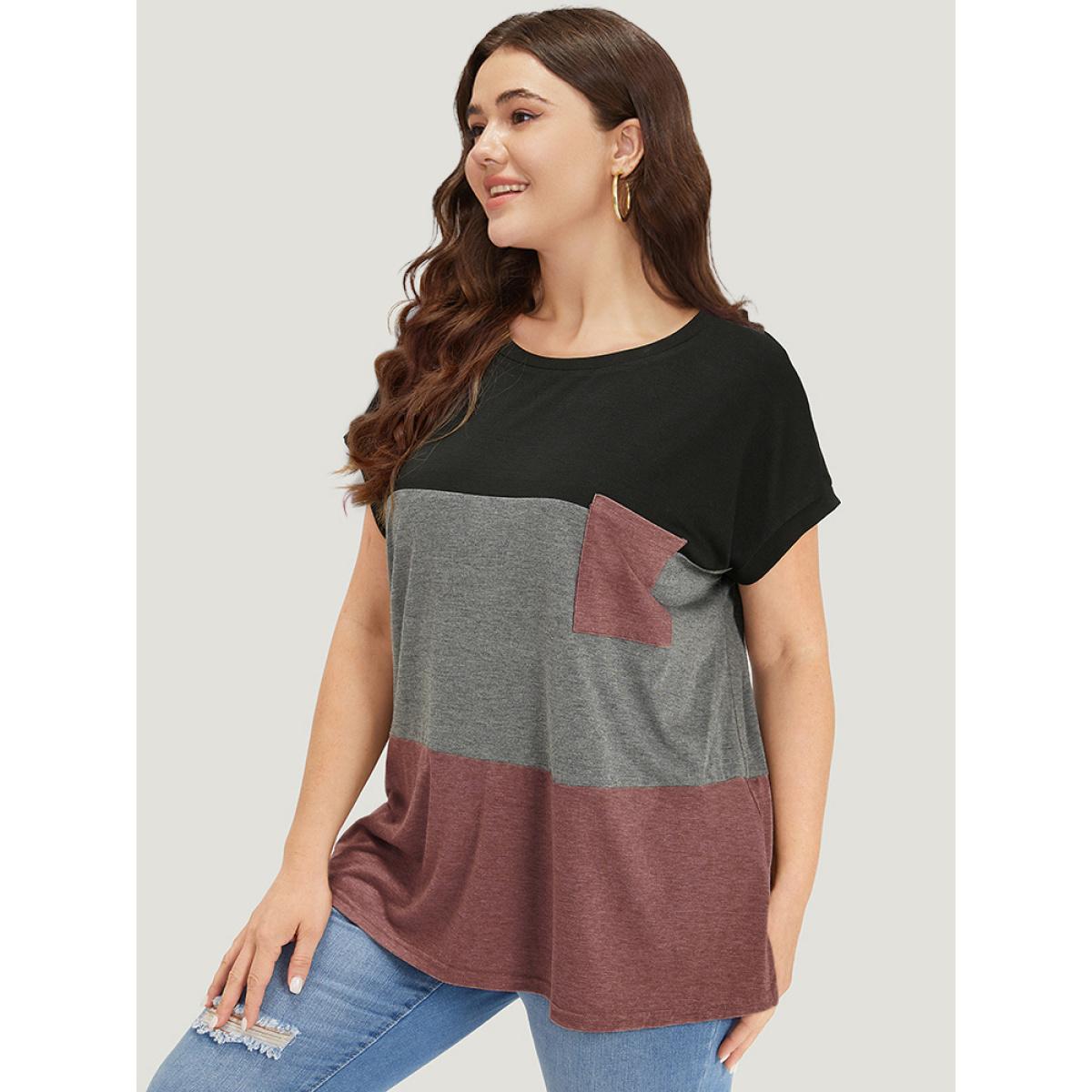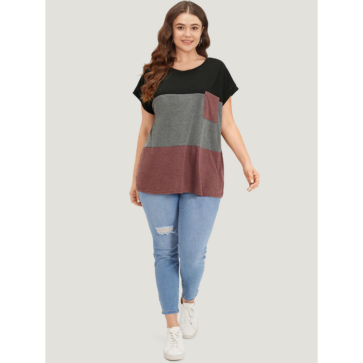 Plus Size Colorblock Contrast Patched Pocket Batwing Sleeve T-shirt Russet Women Casual Contrast Colorblock Round Neck Dailywear T-shirts BloomChic 18-20/2X