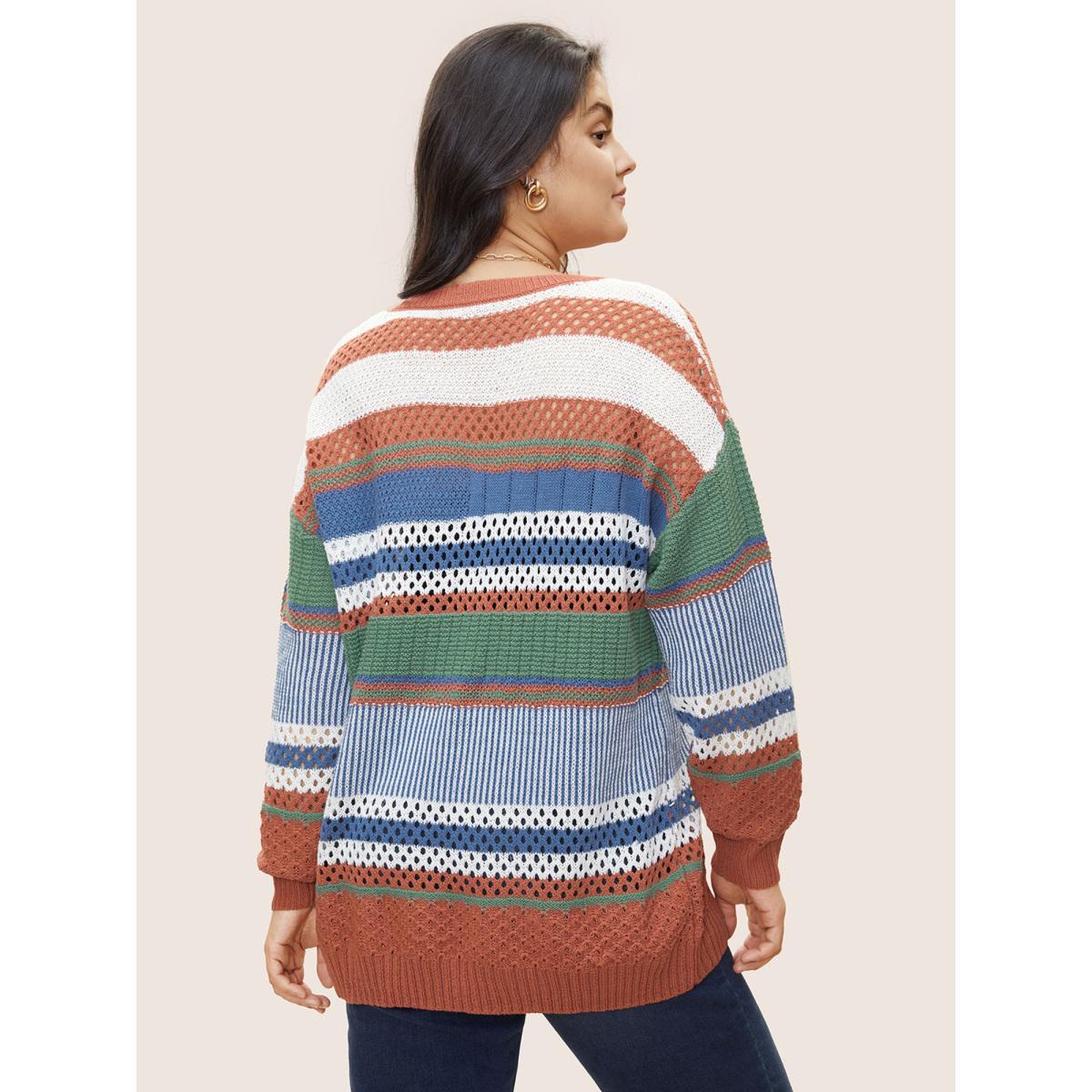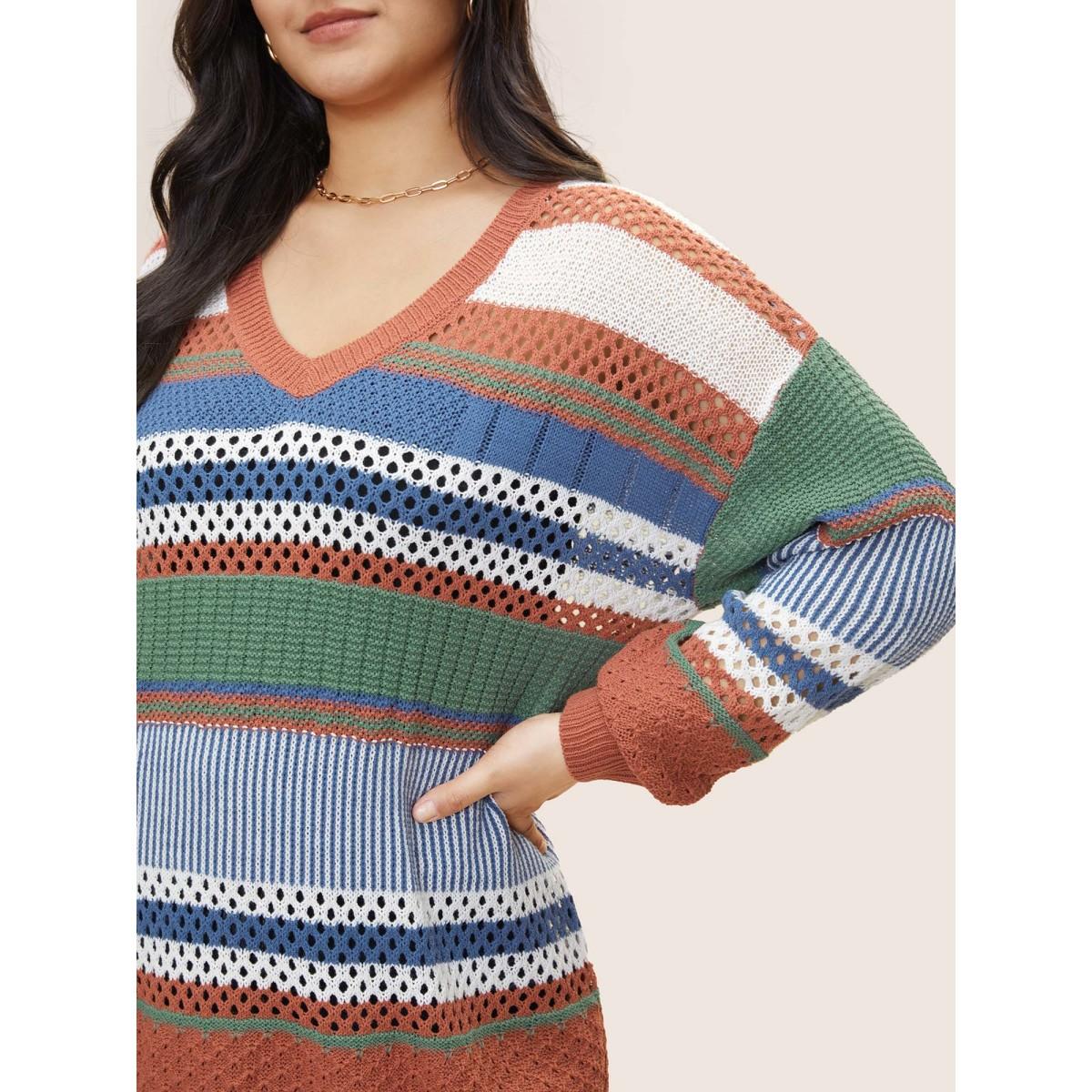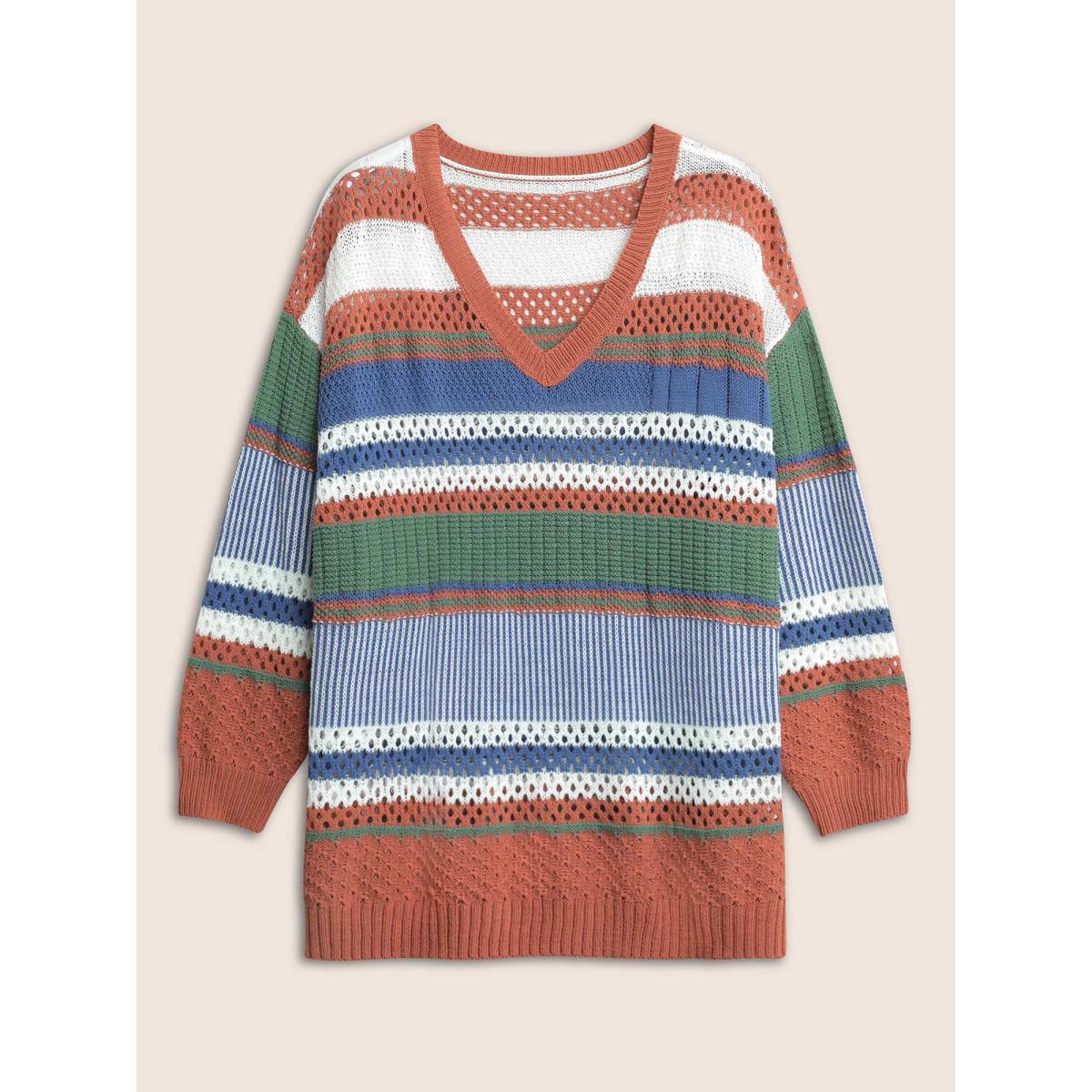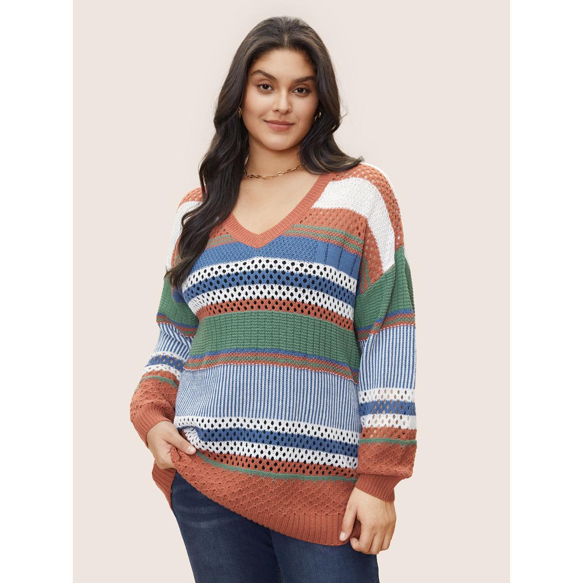 Plus Size Colorblock Contrast Pointelle Knit Pullover OrangeRed Women Casual Long Sleeve V-neck Everyday Pullovers BloomChic 14-16/1X