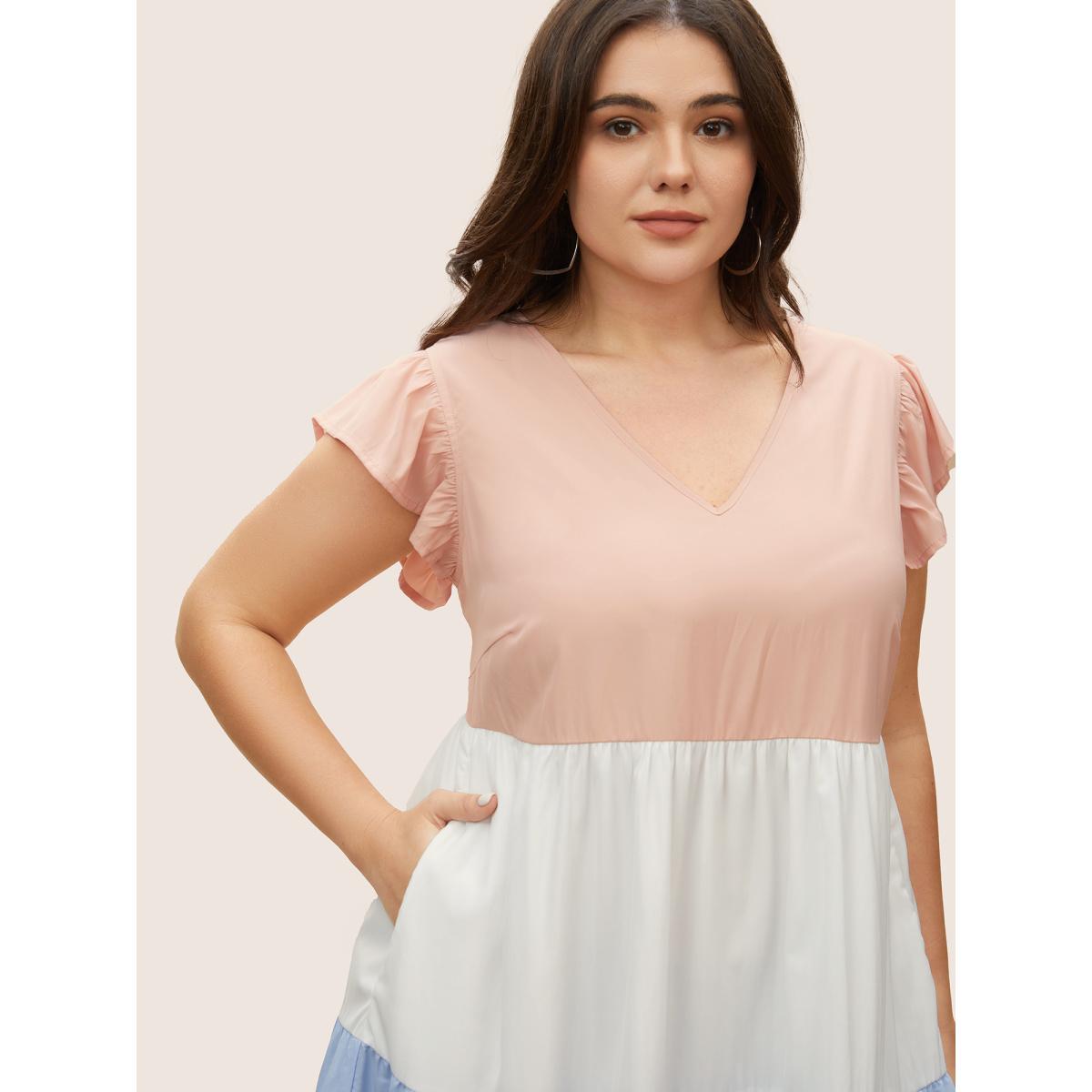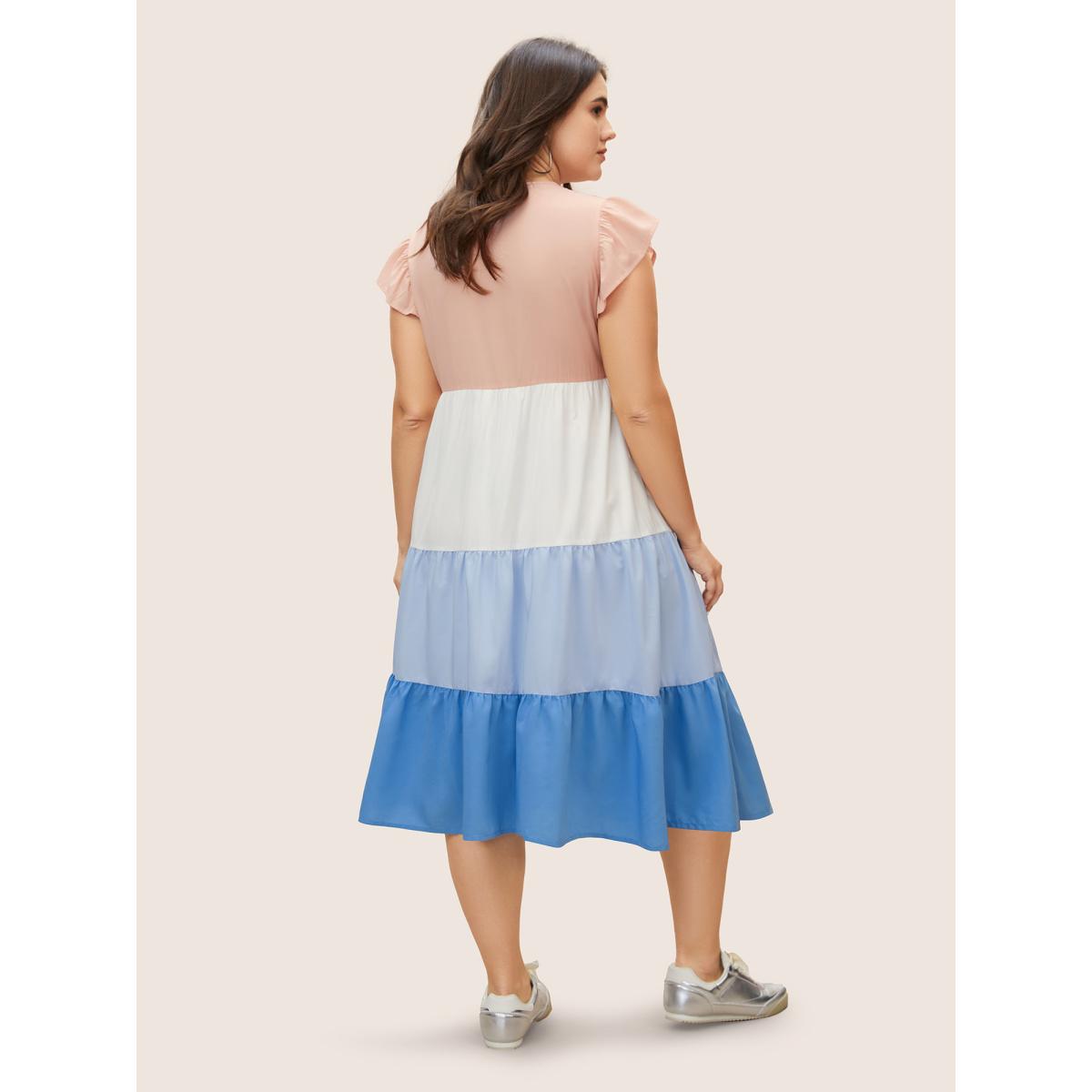 Plus Size Colorblock Contrast Ruffle Cap Sleeve Dress Multicolor Women Casual Patchwork V-neck Cap Sleeve Curvy BloomChic 12/L