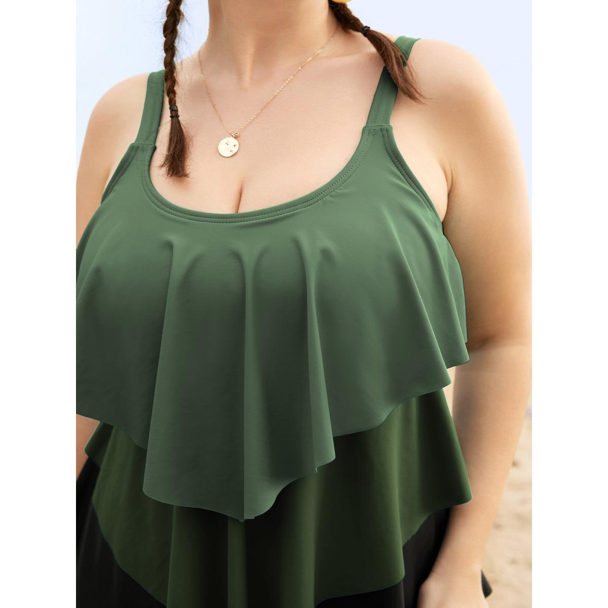 Plus Size Colorblock Contrast Ruffle Layered Hem Tankini Top Women's Swimwear Moss Resort Non High stretch Bodycon U-neck Curve Swim Tops BloomChic 30/6X