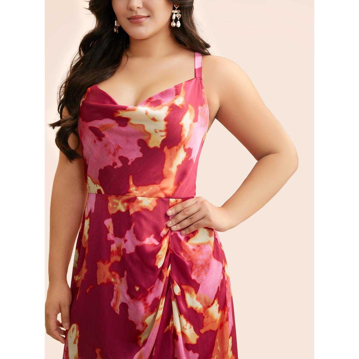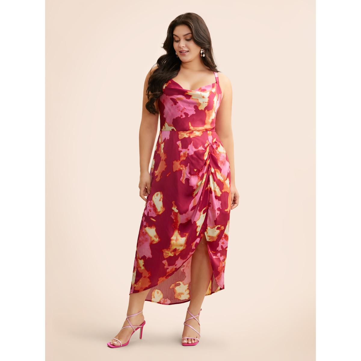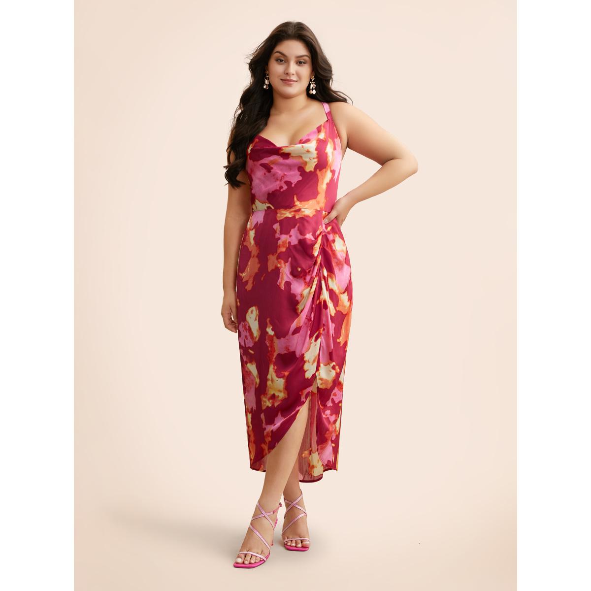 Plus Size Colorblock Contrast Shirred Pleated Dress RedViolet Women Formal Gathered Cowl Neck Sleeveless Curvy BloomChic 18-20/2X