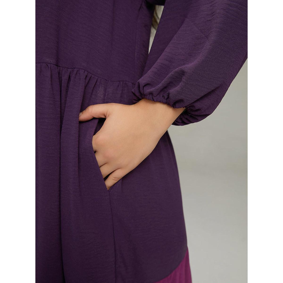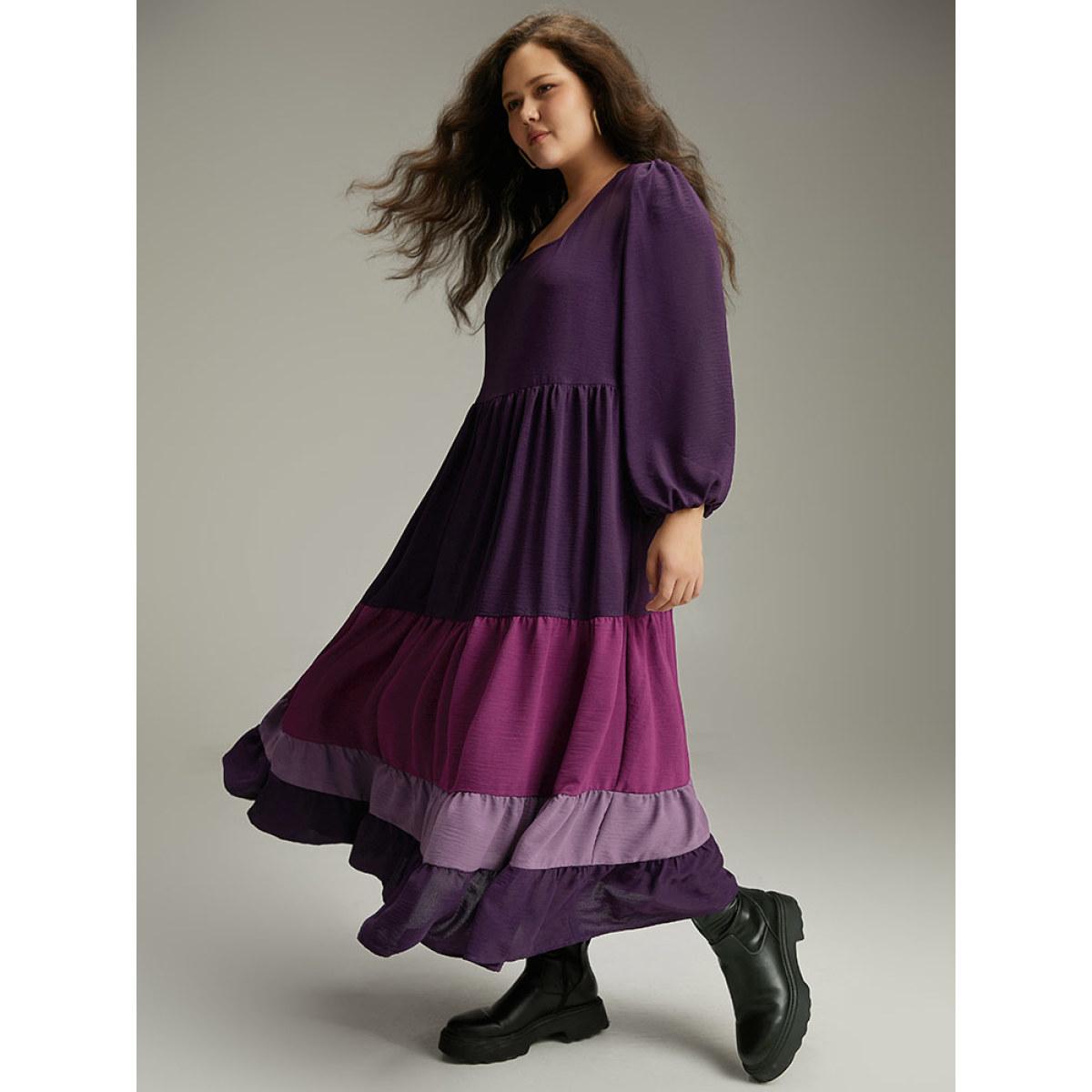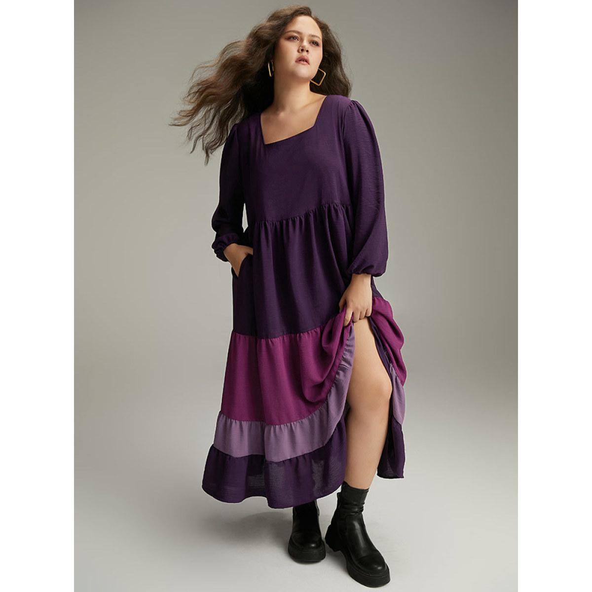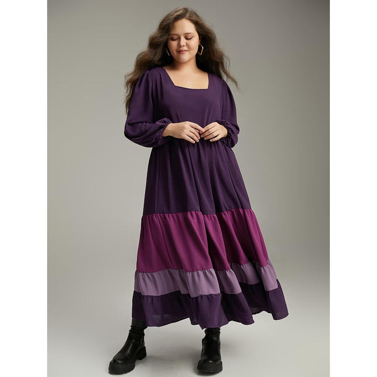 Plus Size Colorblock Contrast Square Neck Ruffle Layered Hem Dress Eggplant Women Casual Elastic cuffs Square Neck Long Sleeve Curvy Long Dress BloomChic 18-20/2X