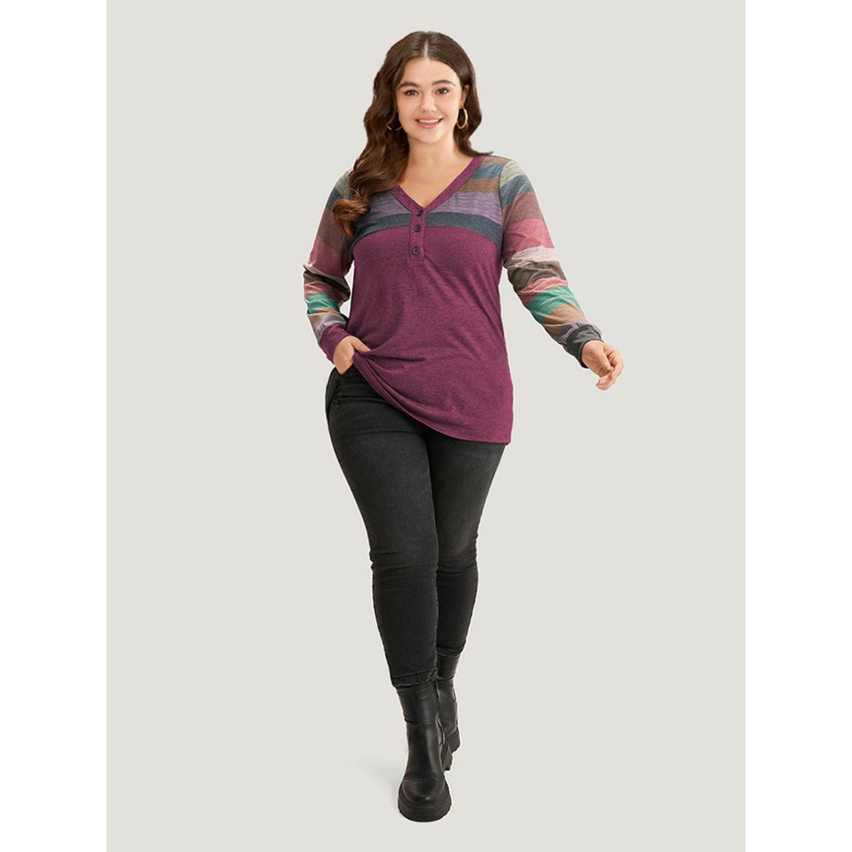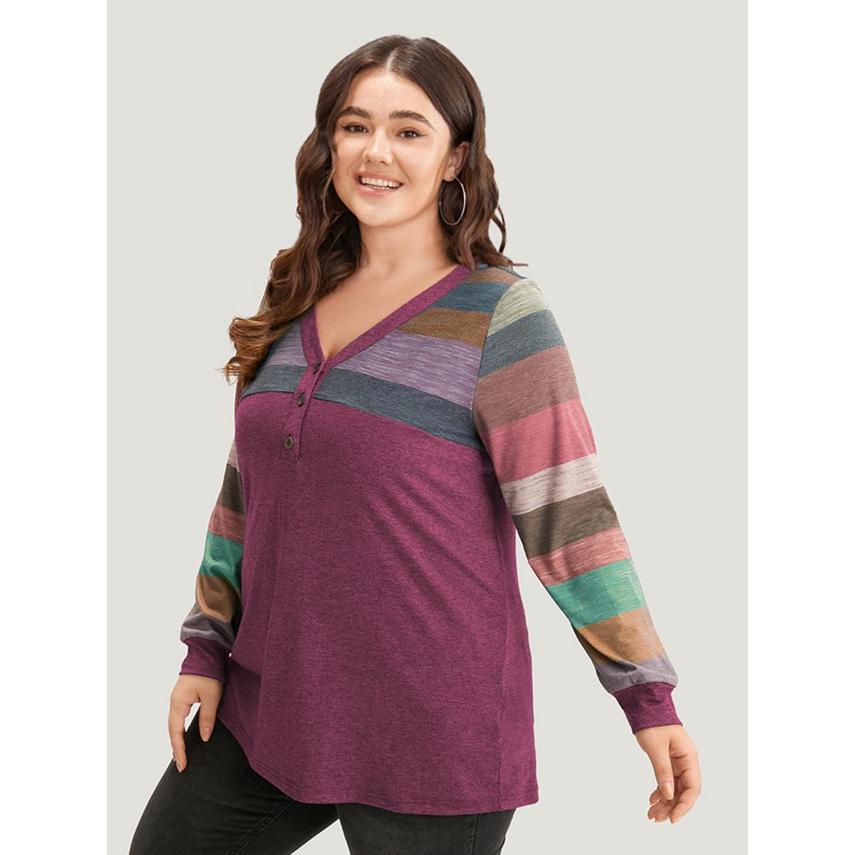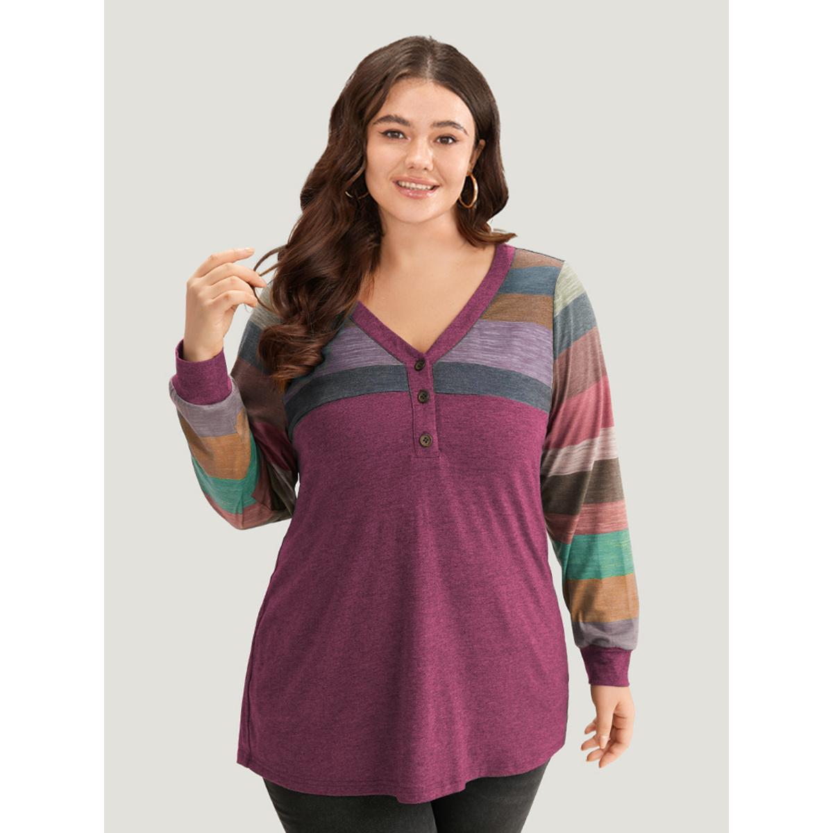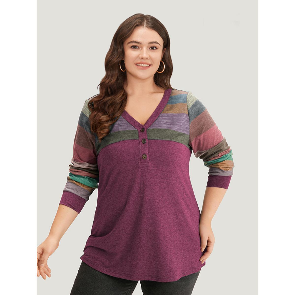 Plus Size Colorblock Contrast V Neck Button Up T-shirt Russet Women Casual Elastic cuffs Striped V-neck Everyday T-shirts BloomChic 12/L