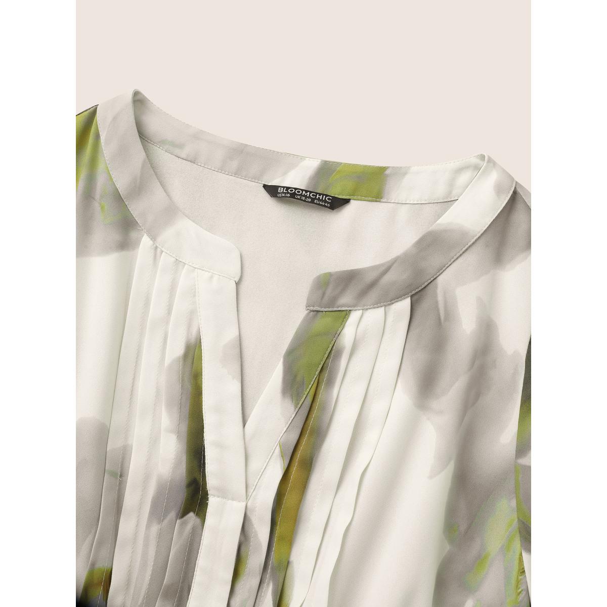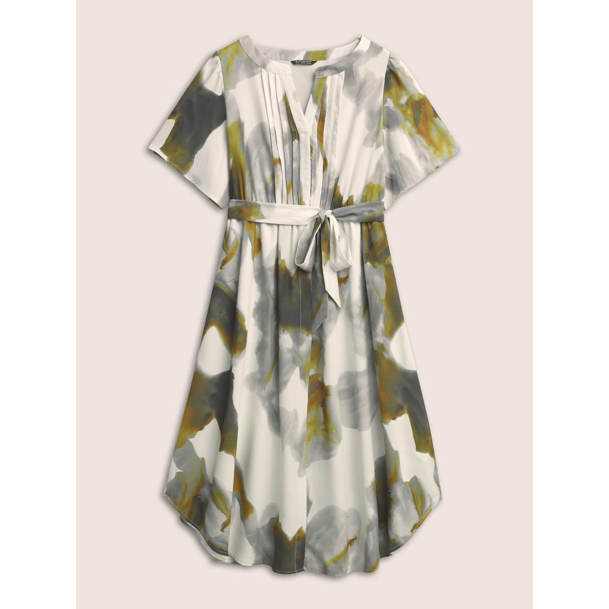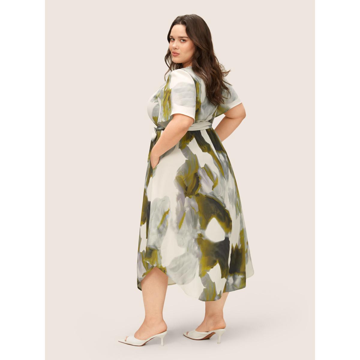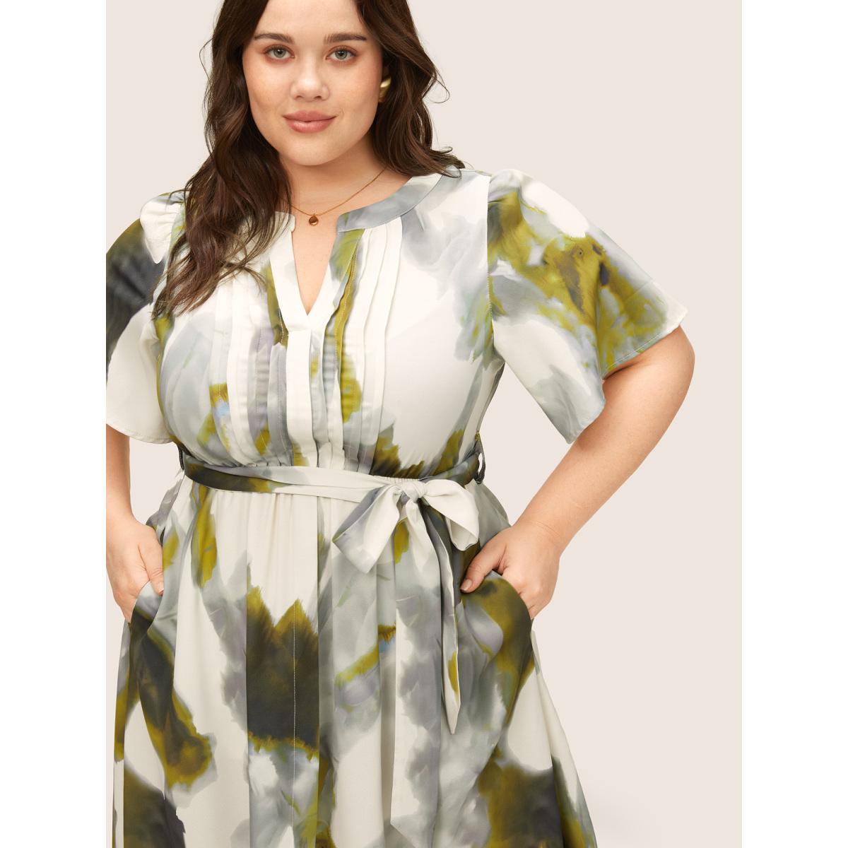 Plus Size Colorblock Notched Pleated Belted Curved Hem Dress Sage Women At the Office Non Notched collar Short sleeve Curvy Midi Dress BloomChic 18-20/2X