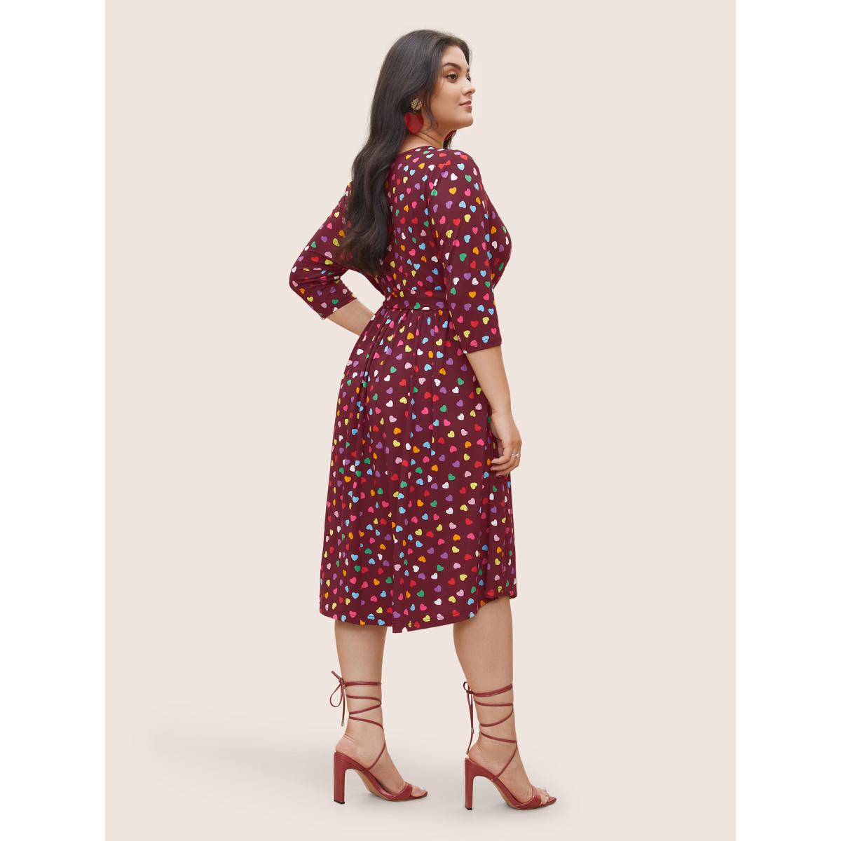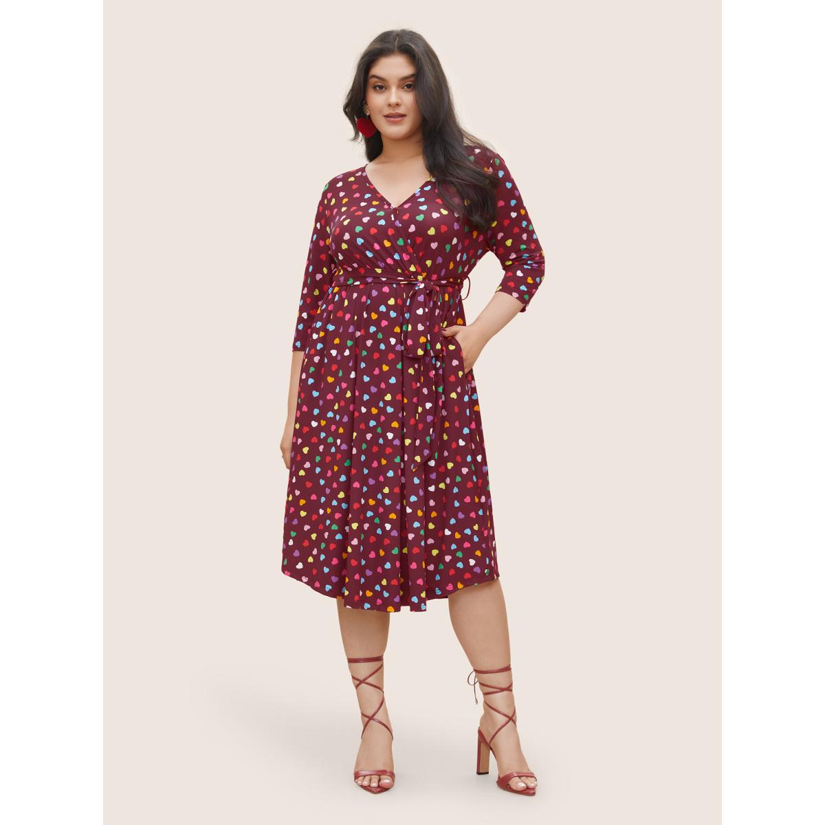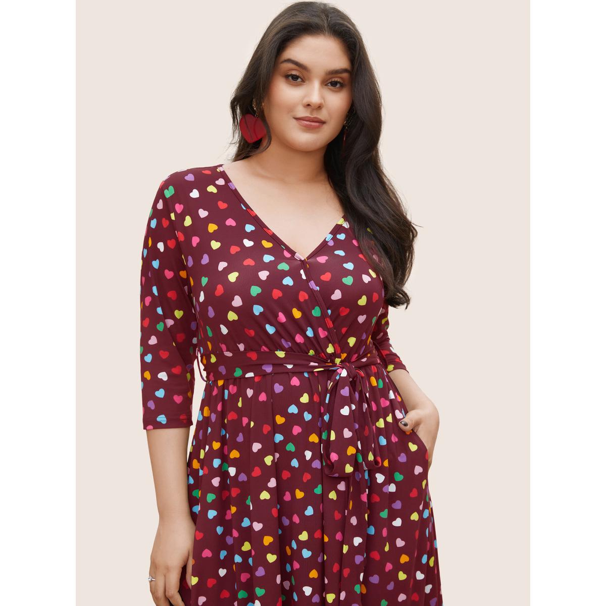 Plus Size Colored Heart Print Belted Overlap Collar Dress Burgundy Women Casual Belted Overlap Collar Elbow-length sleeve Curvy Midi Dress BloomChic 10/M