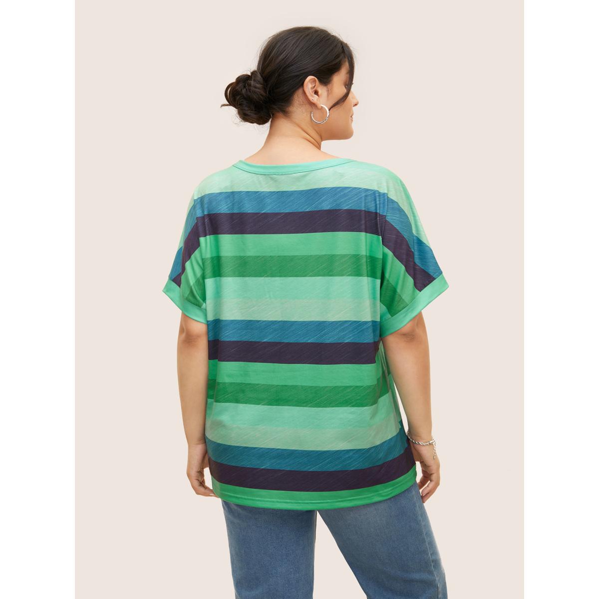 Plus Size Colored Striped Crew Neck Batwing Sleeve T-shirt Malachitegreen Women Casual Contrast Round Neck Everyday T-shirts BloomChic 28/5X