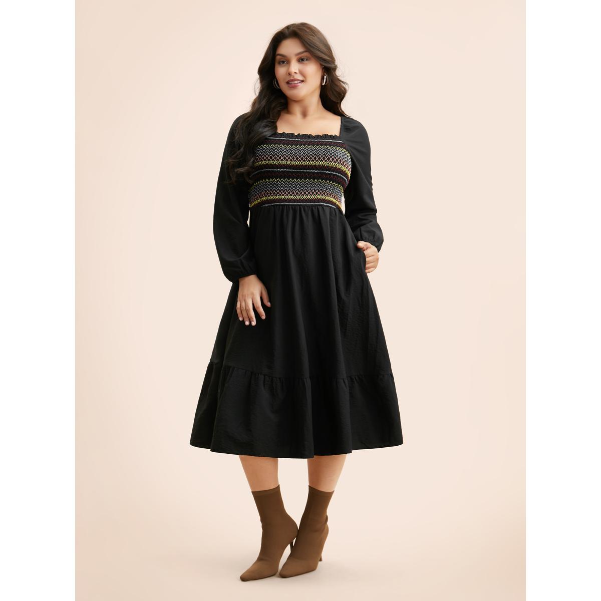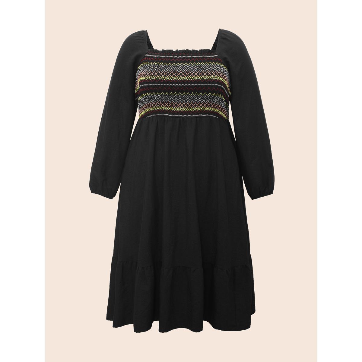Plus Size Colored Striped Shirred Frill Trim Dress Black Women Elegant Topstitching Square Neck Long Sleeve Curvy BloomChic 14-16/1X