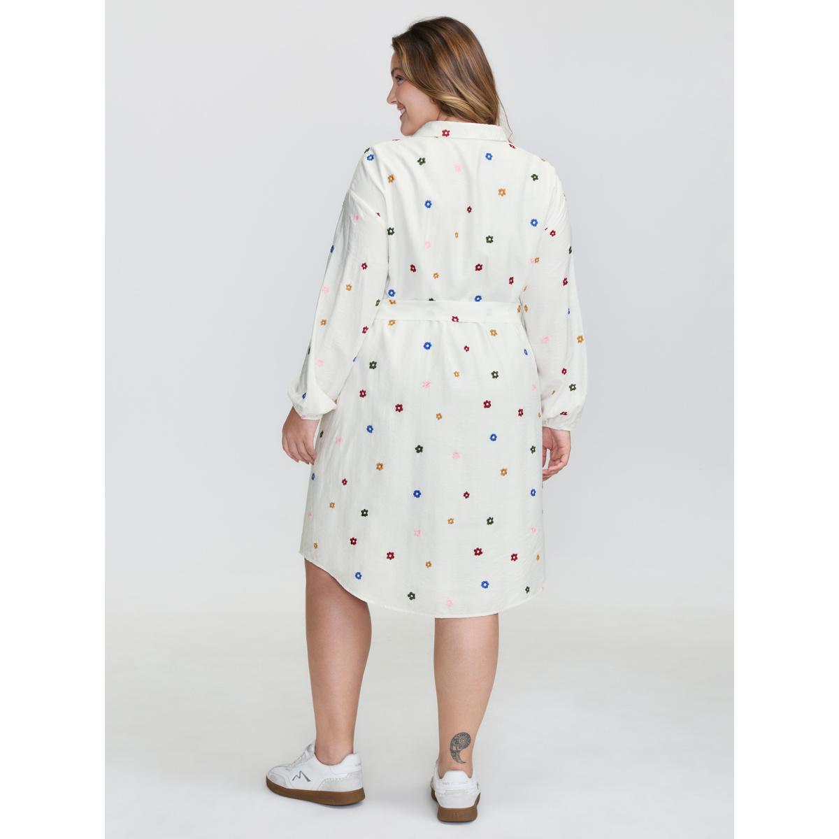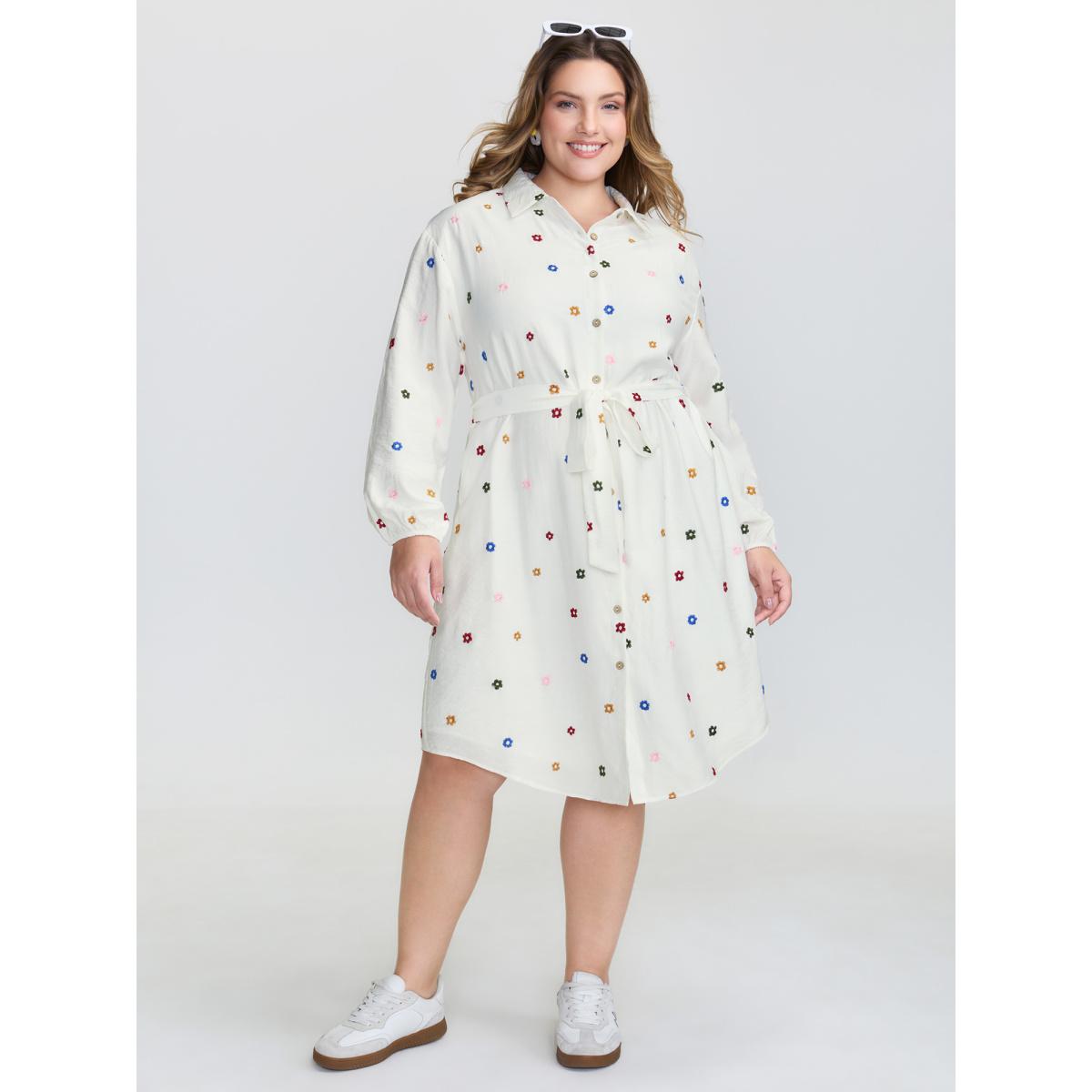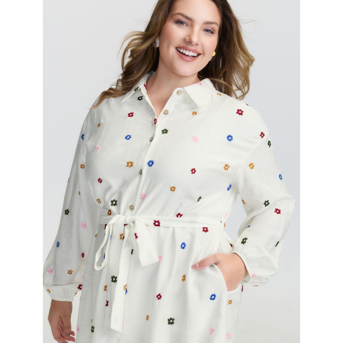 Plus Size Colorful Floral Embroidery Pockets Midi Dress WhiteSmoke Women Playful Texture Shirt collar Long Sleeve Curvy BloomChic 26/4X