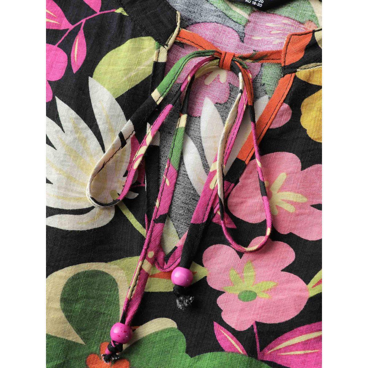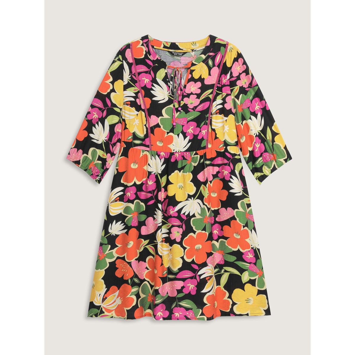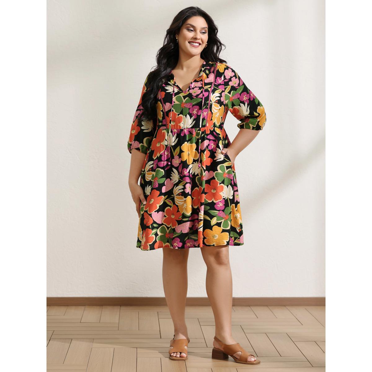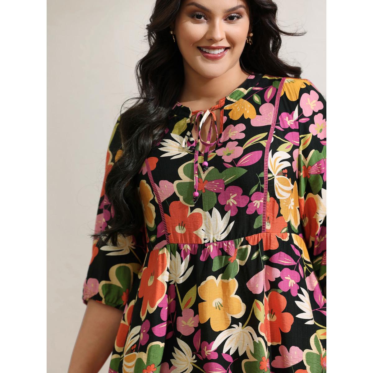Plus Size Colorful Floral Print Beaded A-Line Midi Dress Black Women Leisure Flat collar with V-notch Elbow-length sleeve Curvy BloomChic 18-20/2X