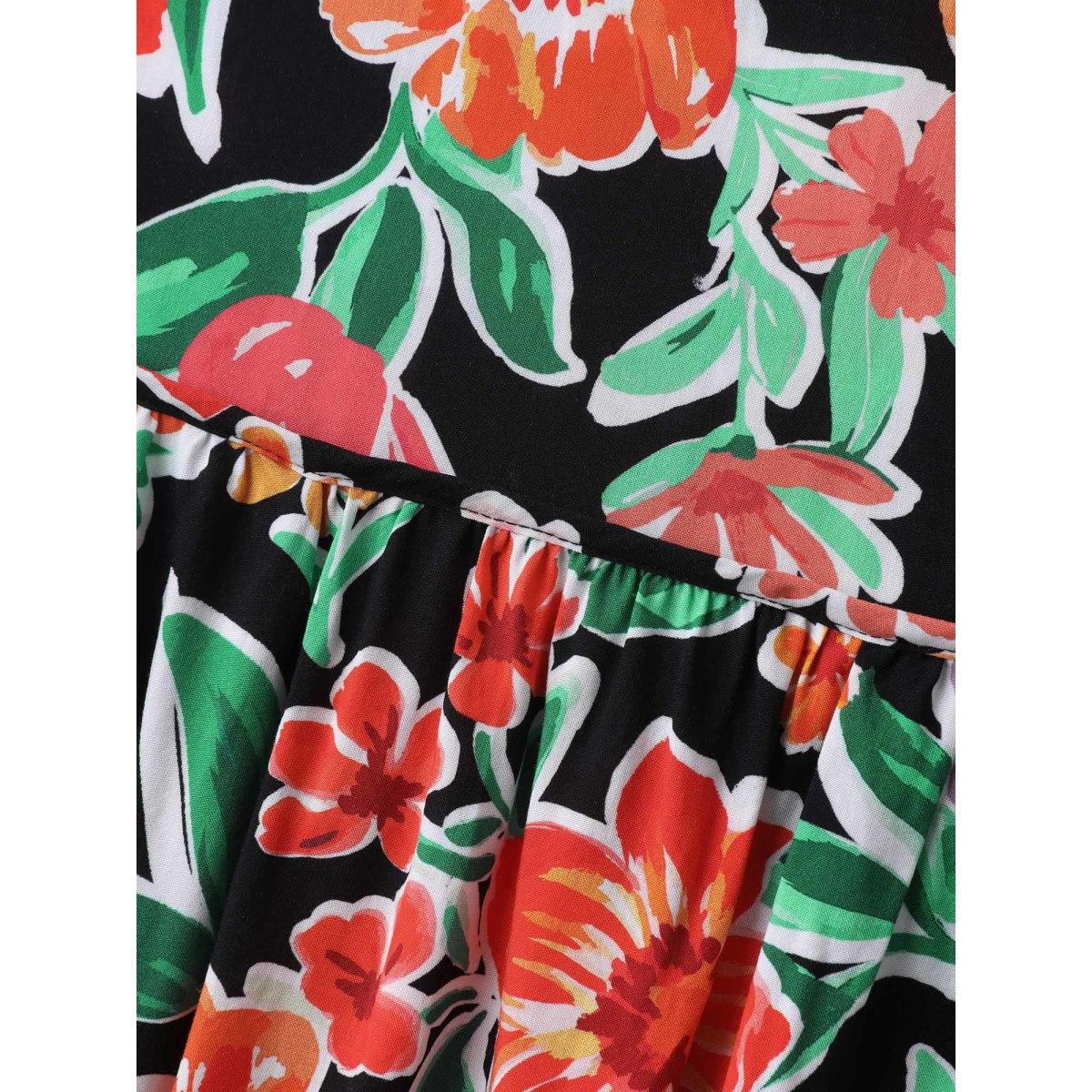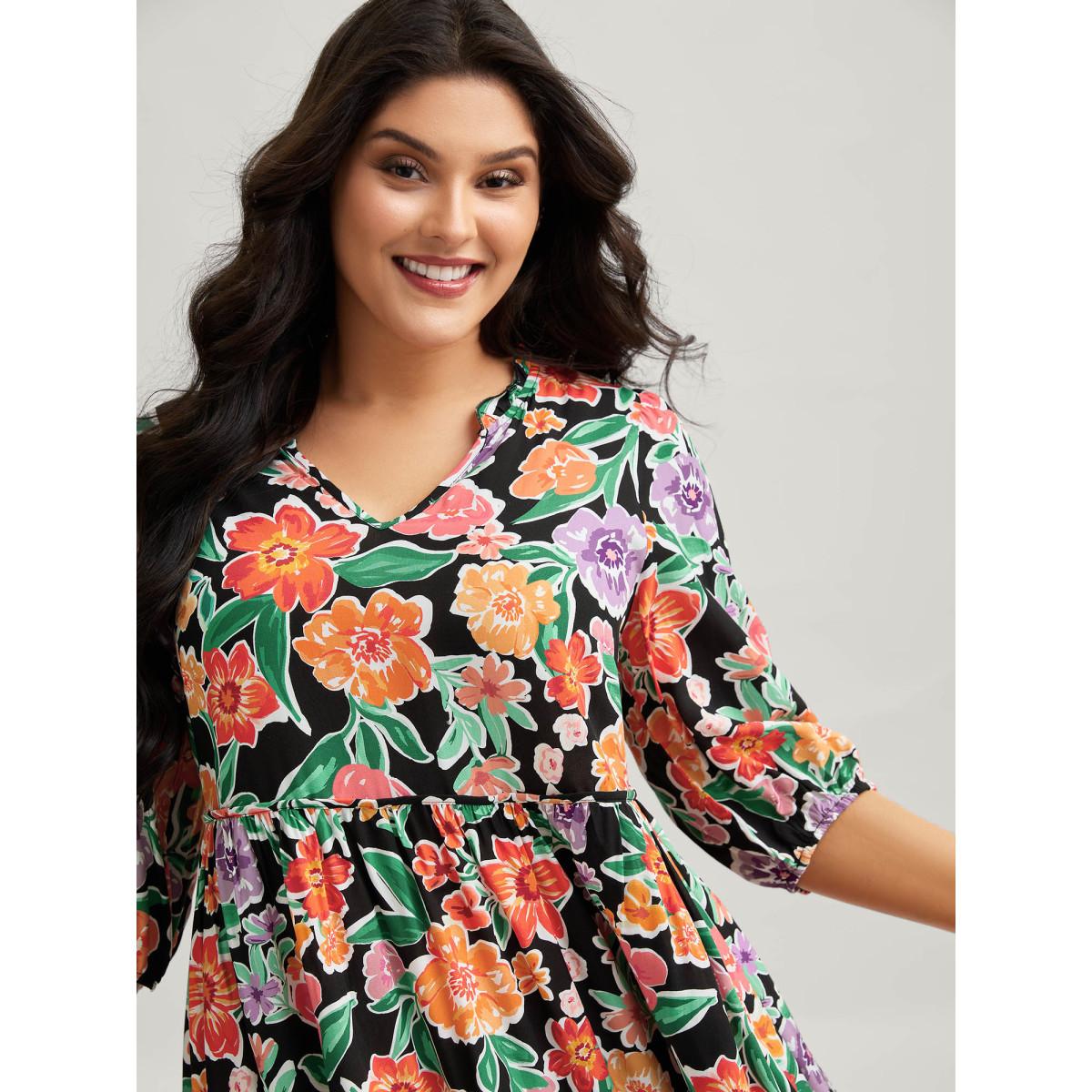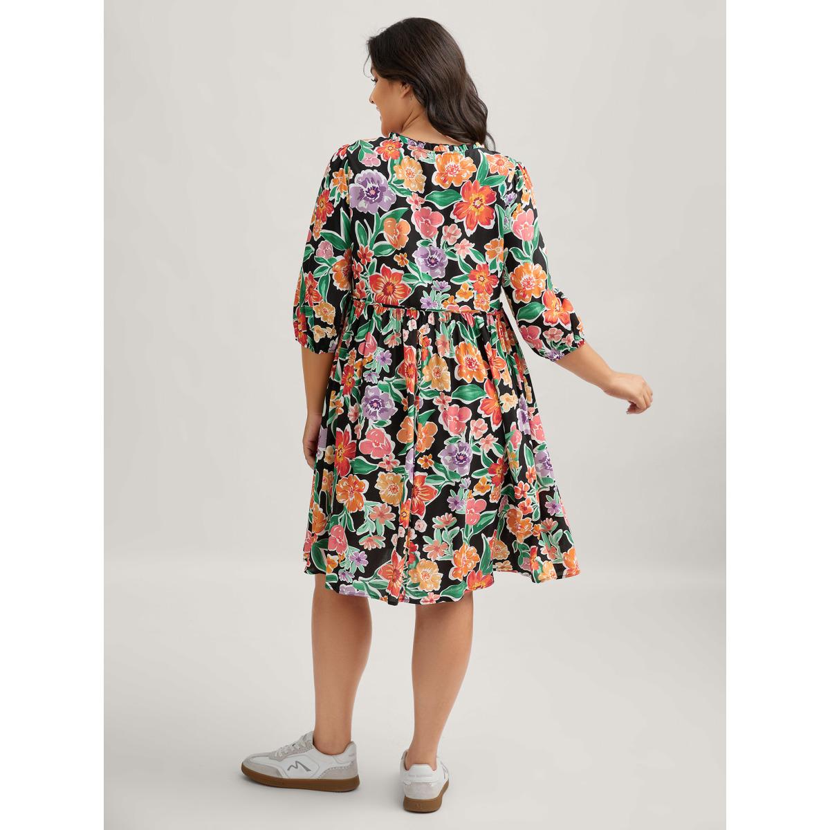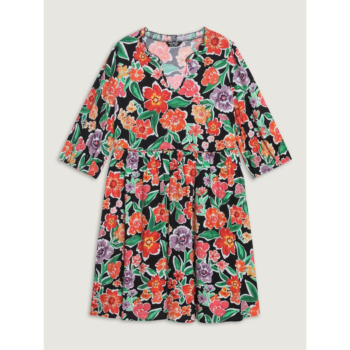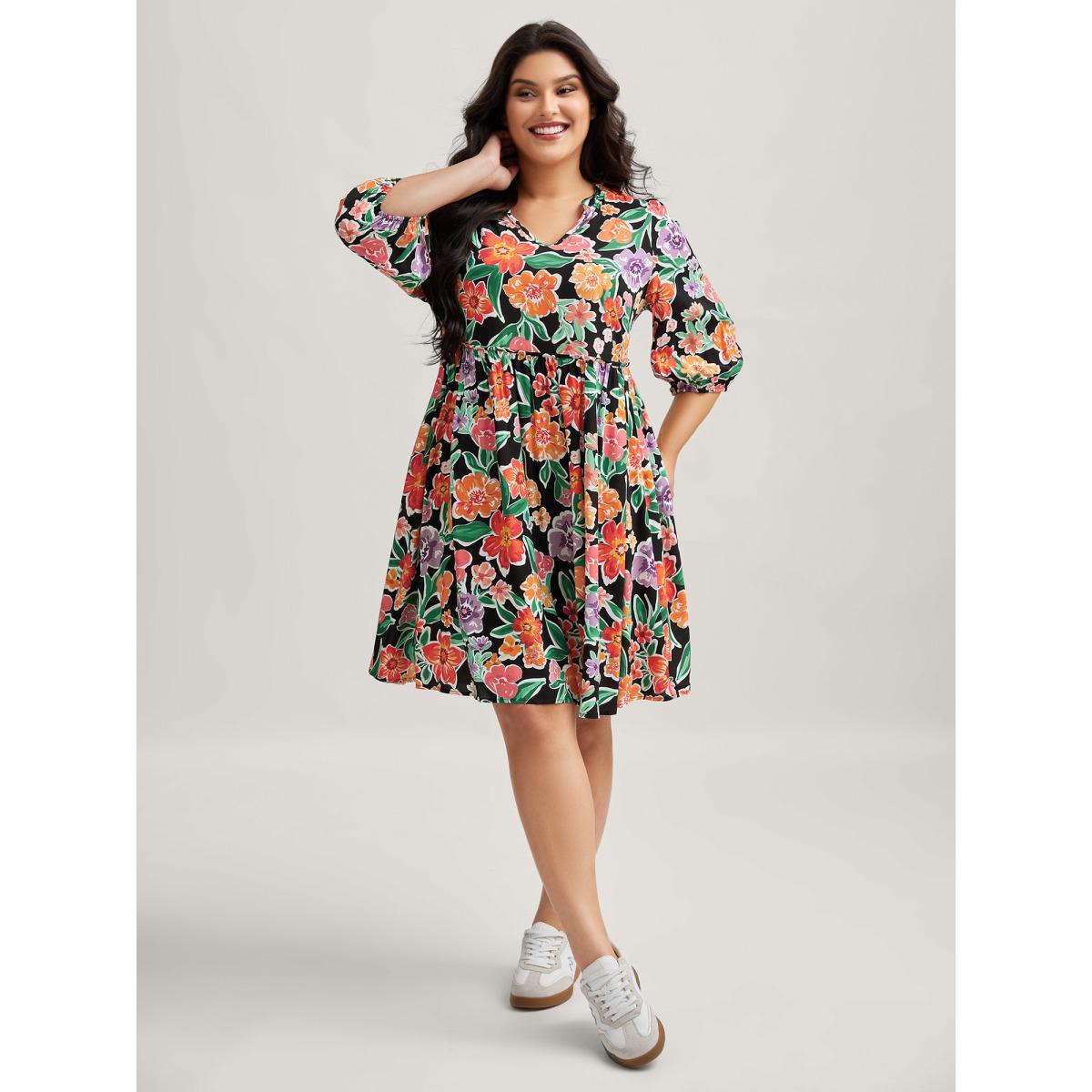 Plus Size Colorful Floral Print Pockets Knee-Length Dress Multicolor Women Playful Frill Trim Notched collar Elbow-length sleeve Curvy BloomChic 10/M