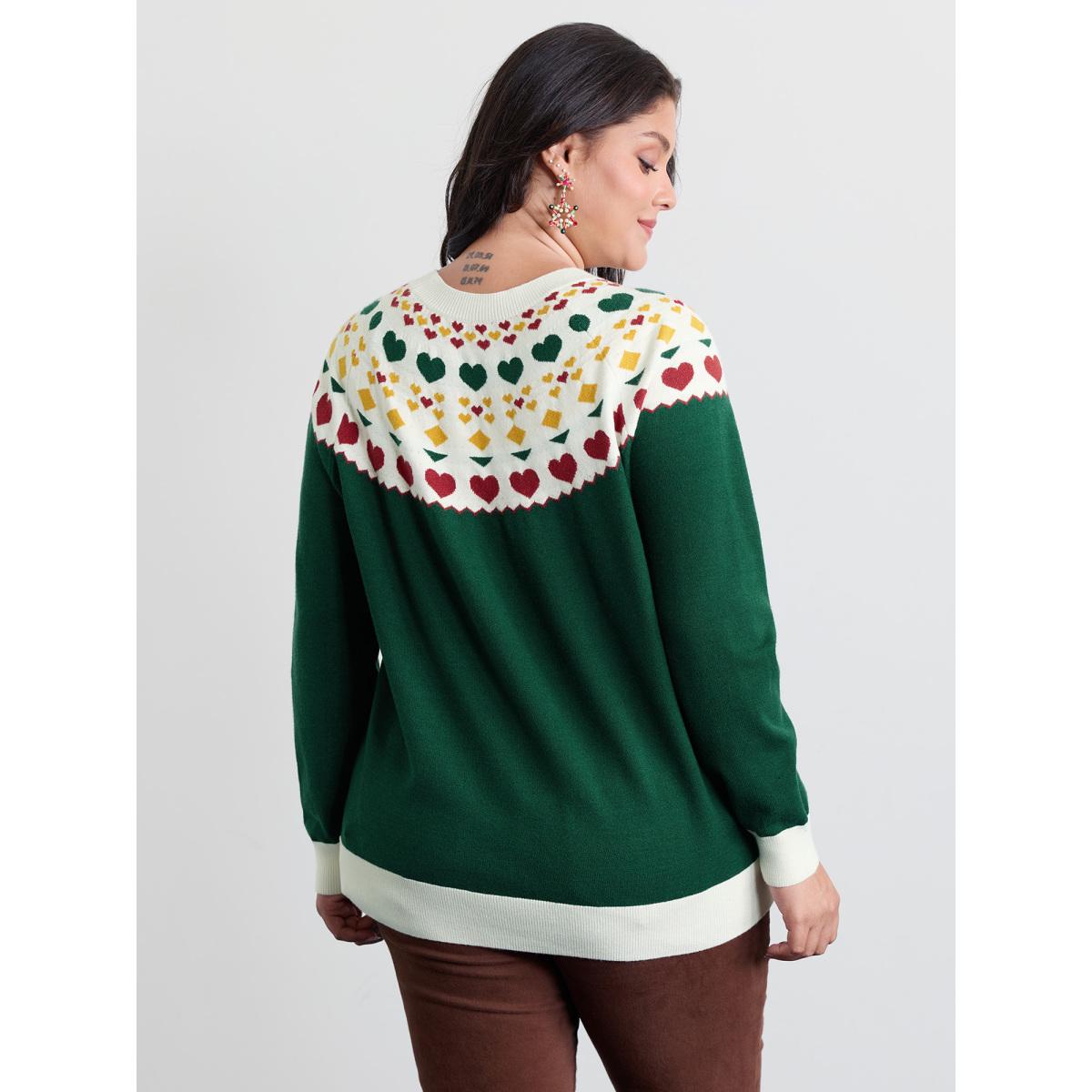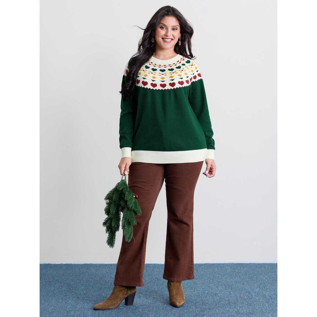 Plus Size Colorful Heart Jacquard Round Neck Pullover DarkGreen Women Playful Loose Long Sleeve Round Neck Casual Pullovers BloomChic 26/4X