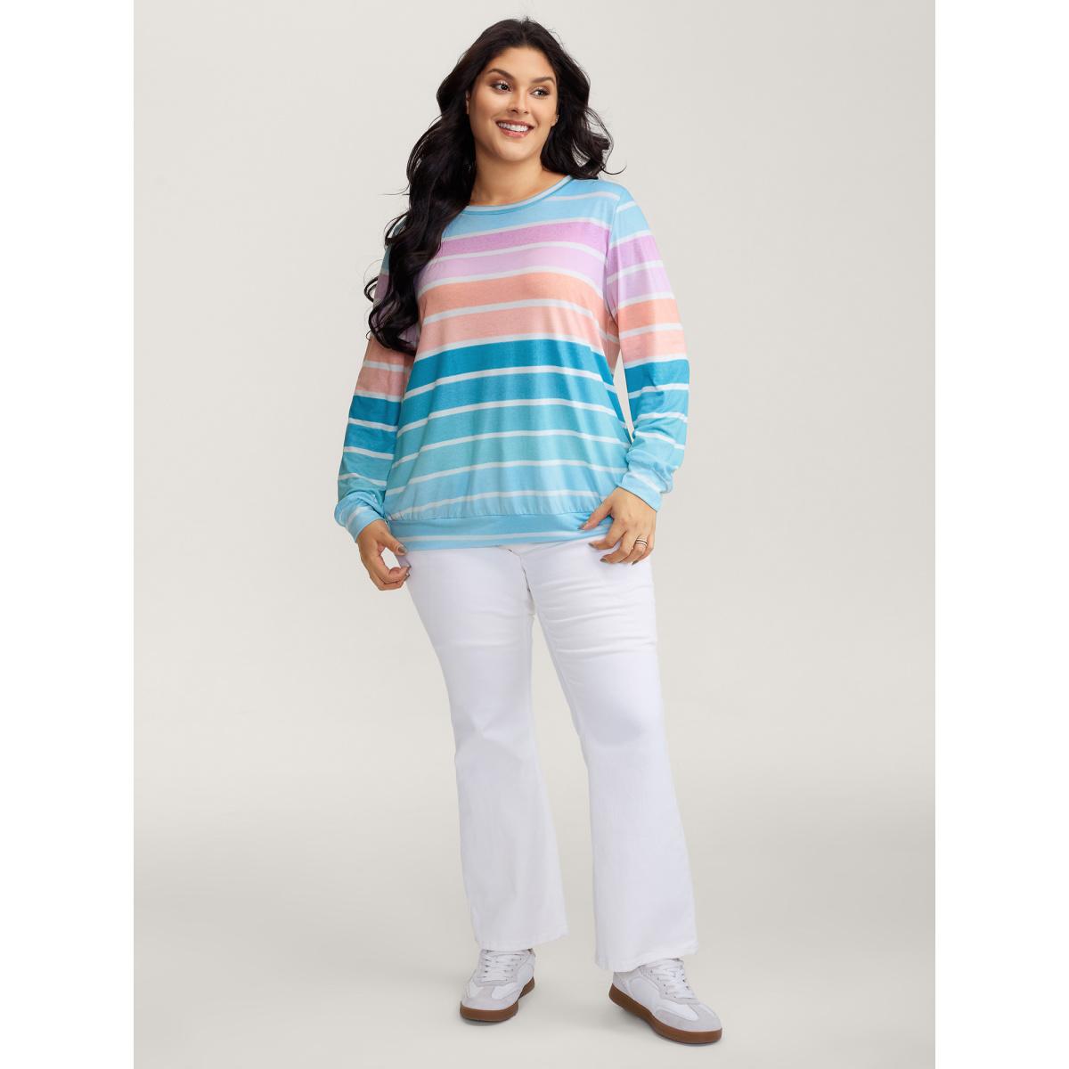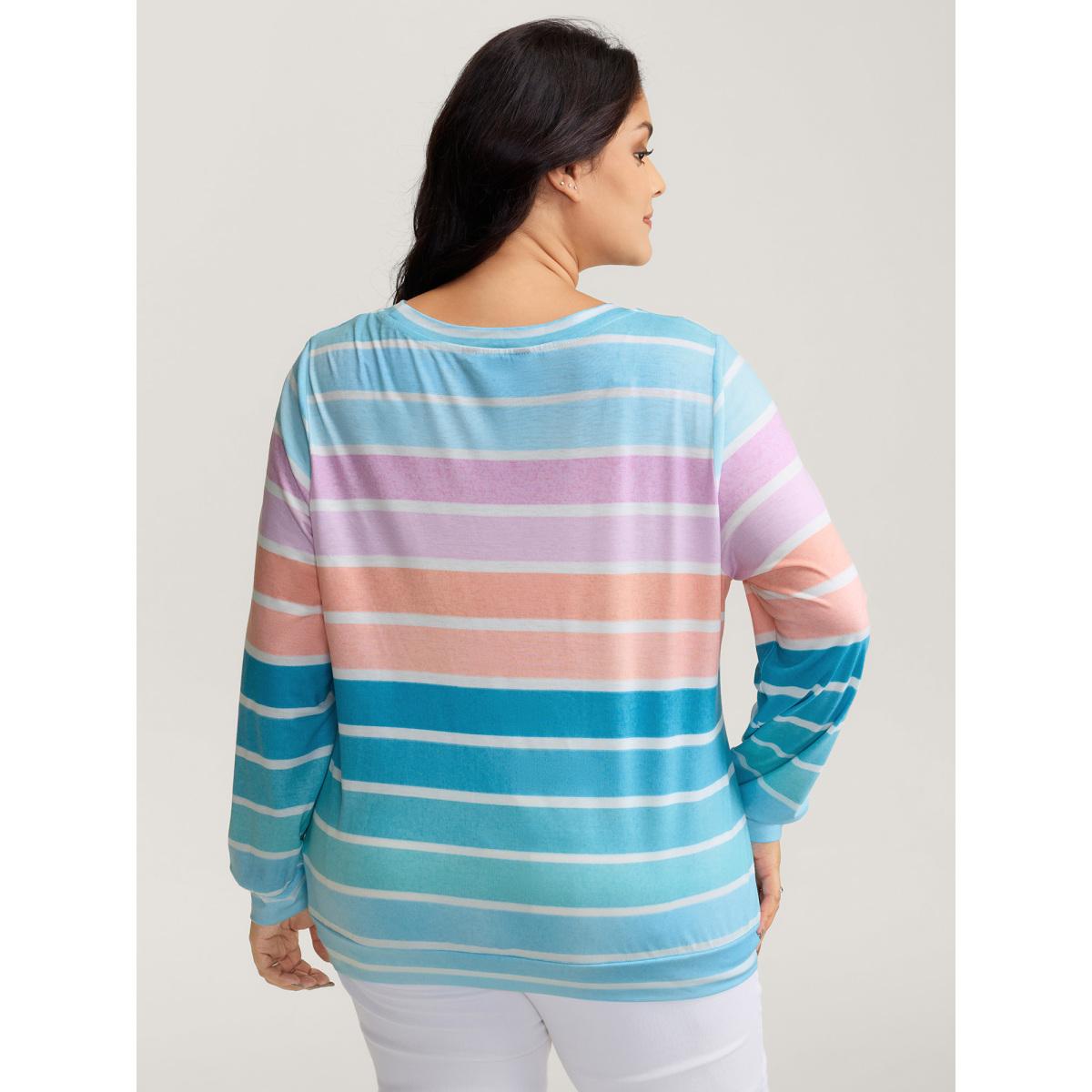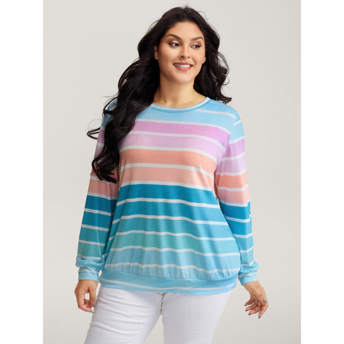 Plus Size Colorful Stripe Relaxed-Fit Stretchy Hem T-Shirt Multicolor Women Playful Non Striped Round Neck Casual T-shirts BloomChic 30/6X