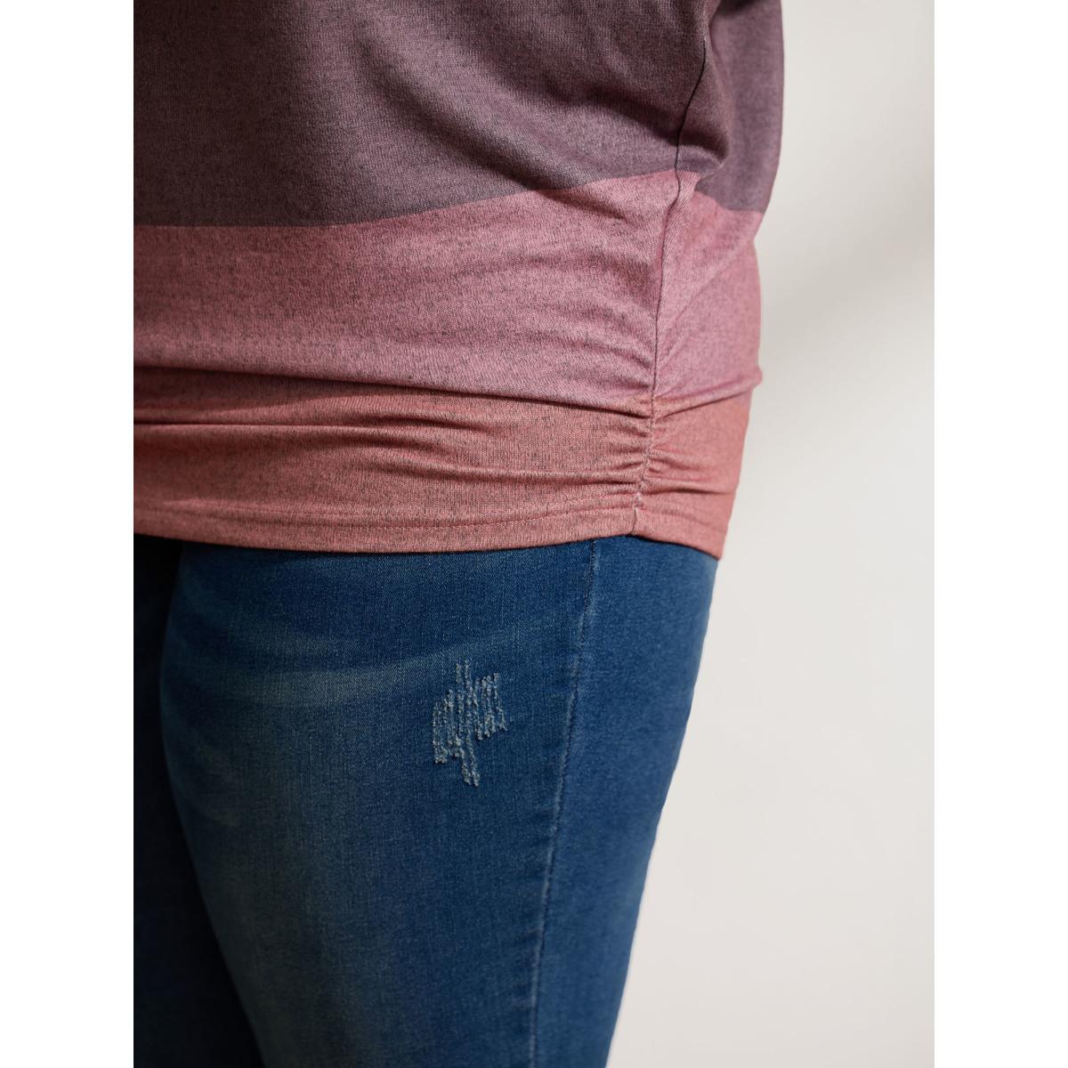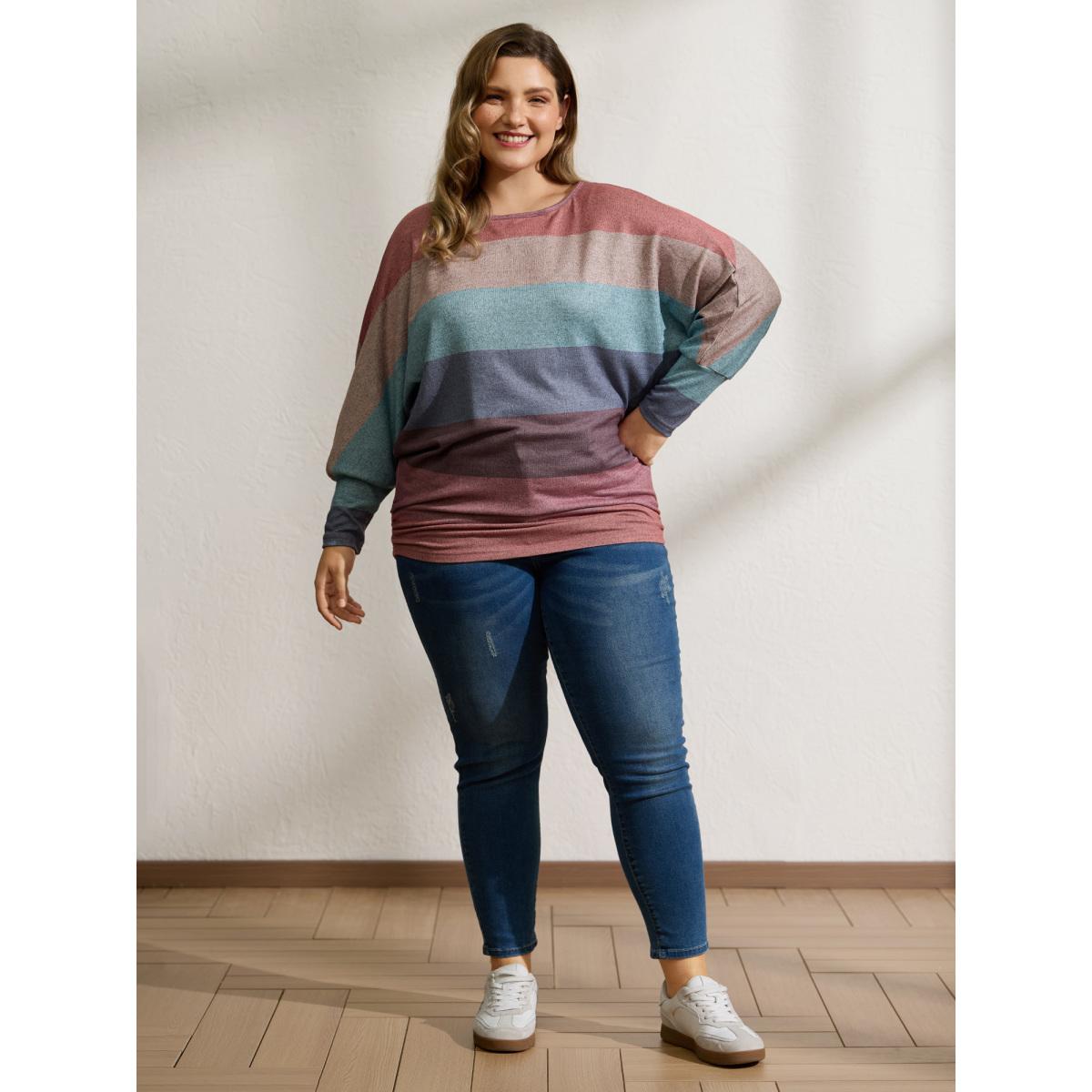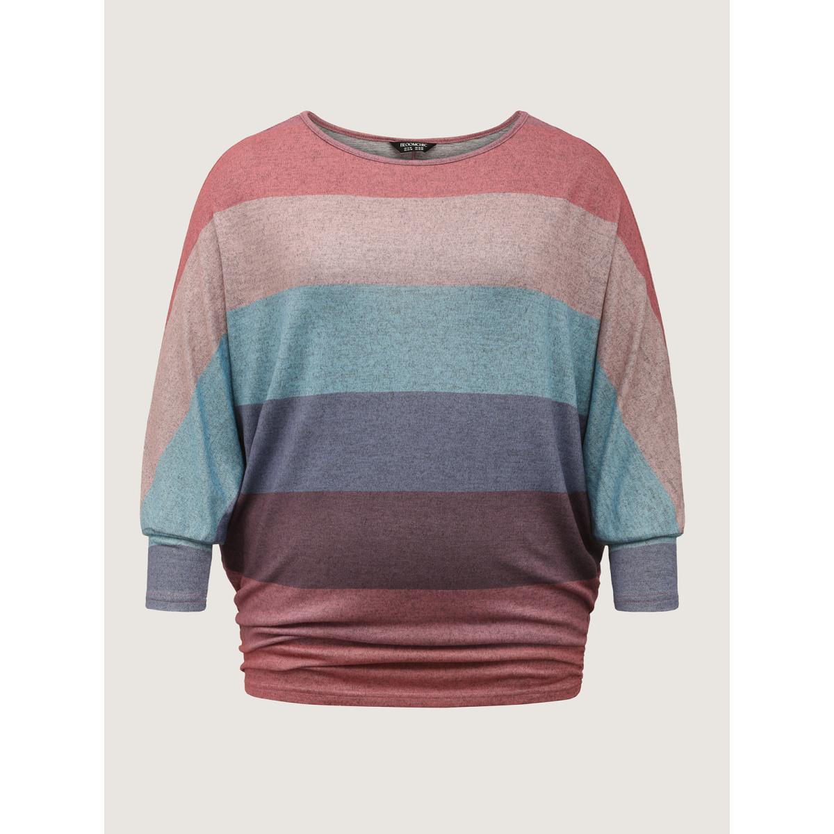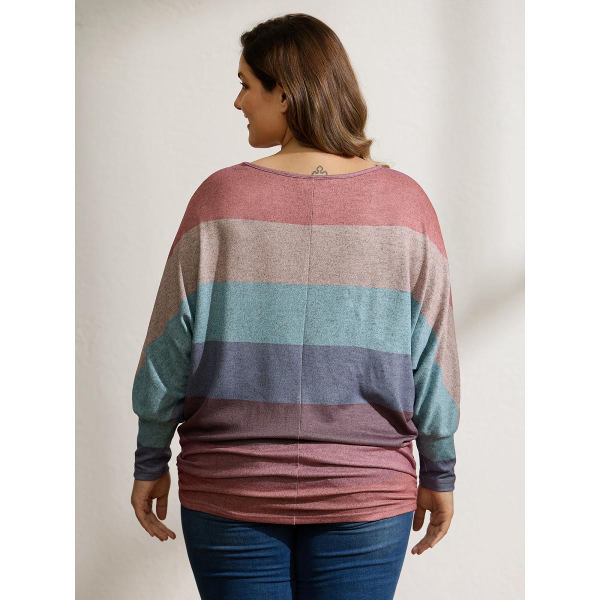 Plus Size Colorful Stripes Dolman Sleeve T-Shirt Multicolor Women Leisure Gathered Boat Neck Loose Casual T-shirts BloomChic 30/6X