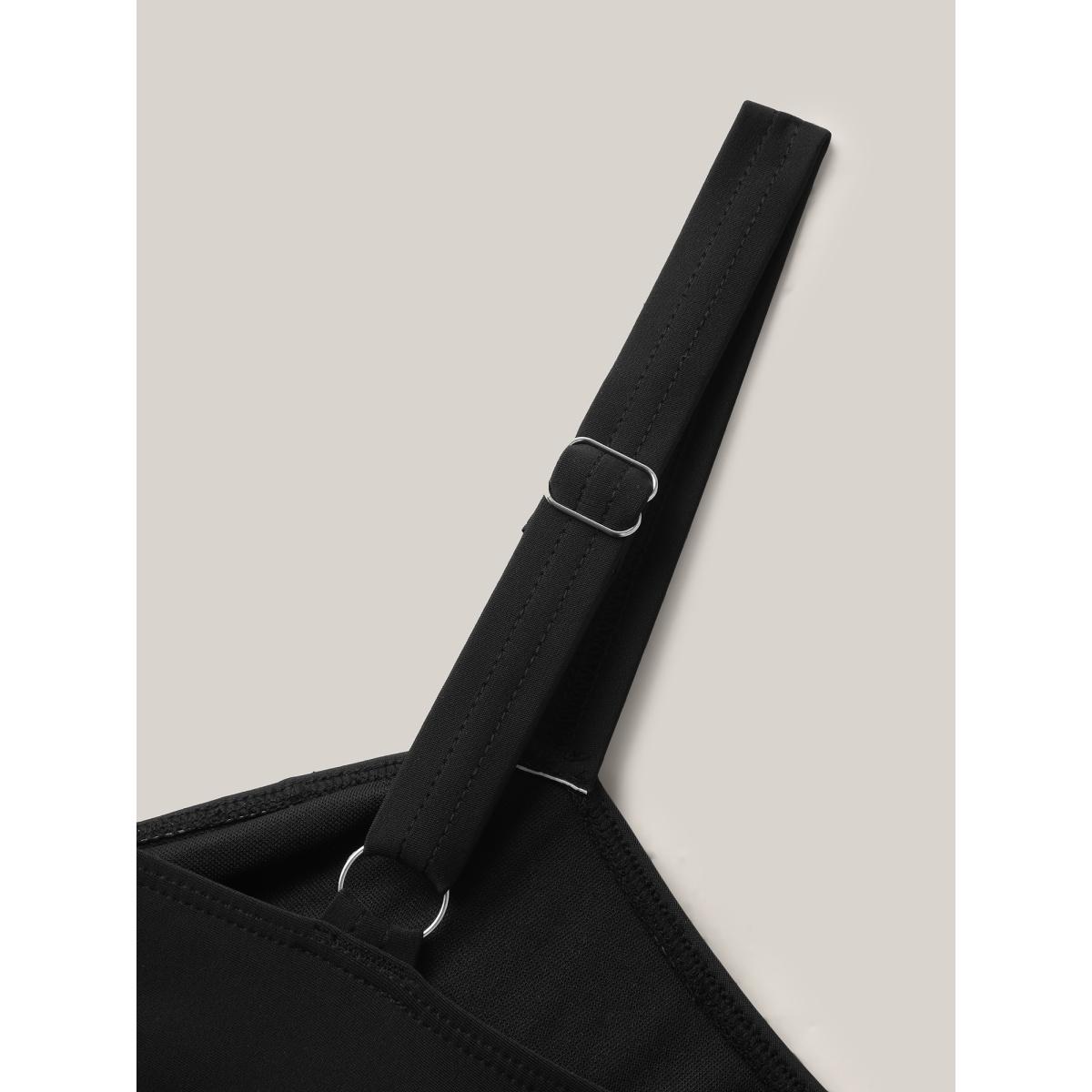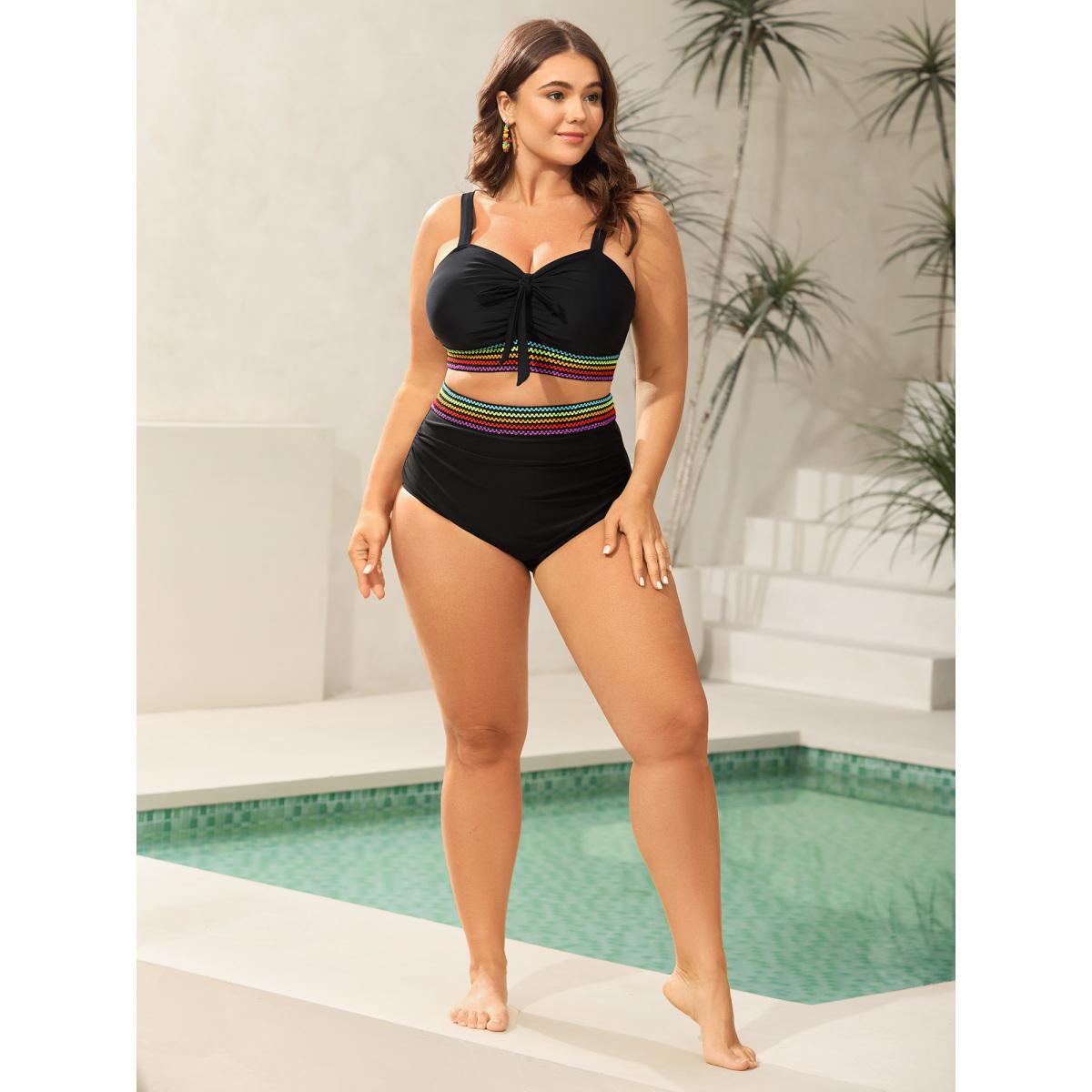 Plus Size Colorful Webbed Knotted Front Swim Top Women's Swimwear Black Resort Woven ribbon&lace trim High stretch Skinny Heart neckline Curve Swim Tops BloomChic 10/M