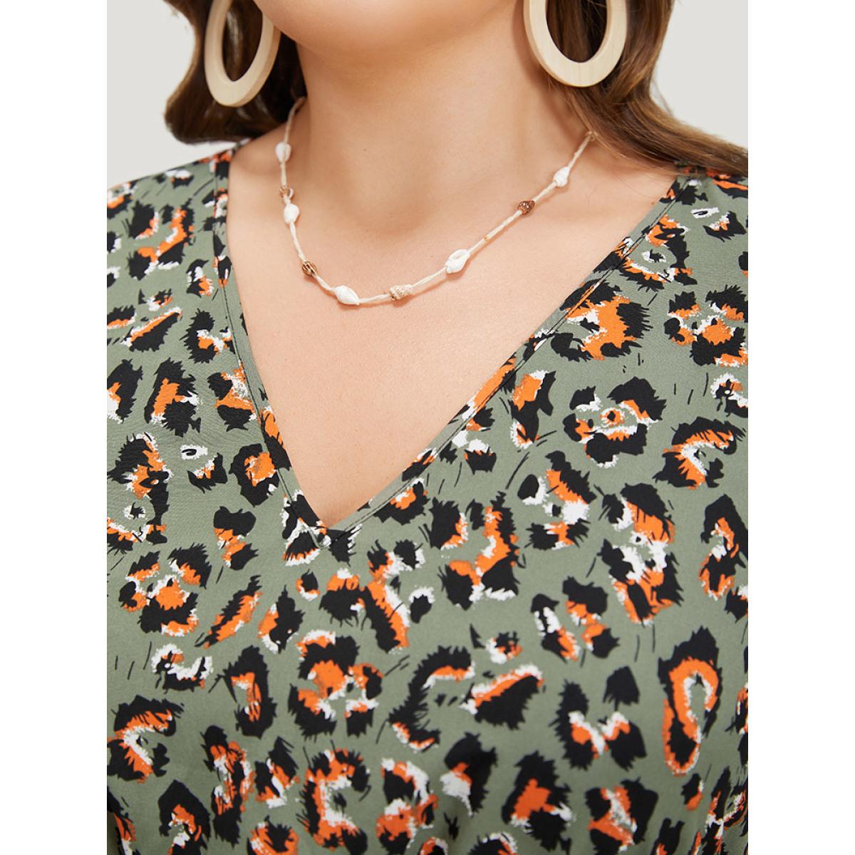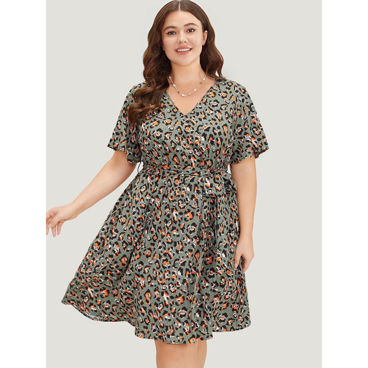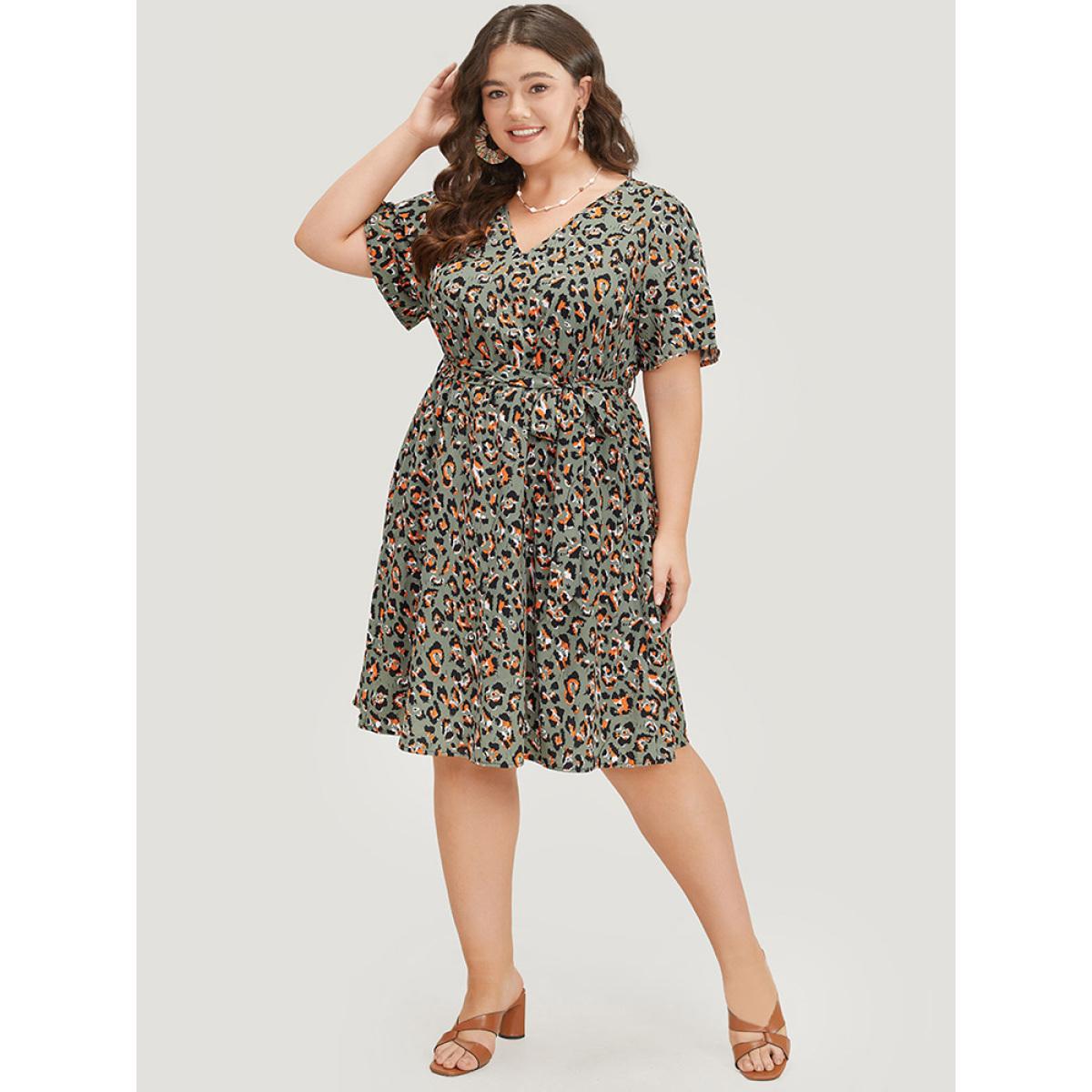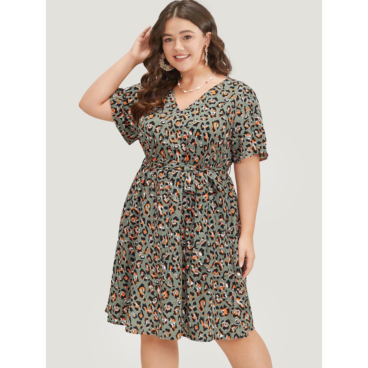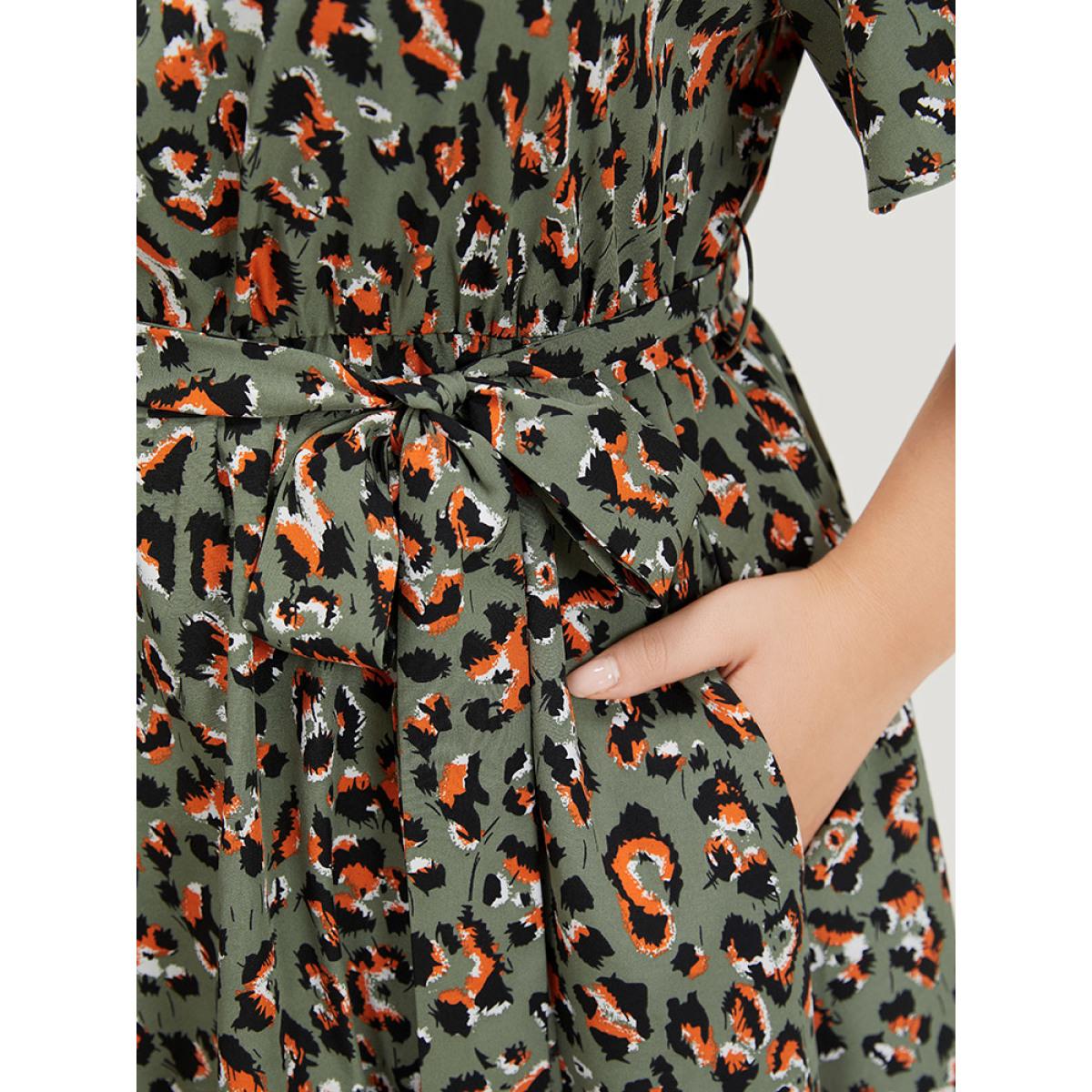 Plus Size Colour Leopard Print Belted Ruffle Hem Pocket Dress ArmyGreen Women Elegant Gathered V-neck Short sleeve Curvy Knee Dress BloomChic 14-16/1X