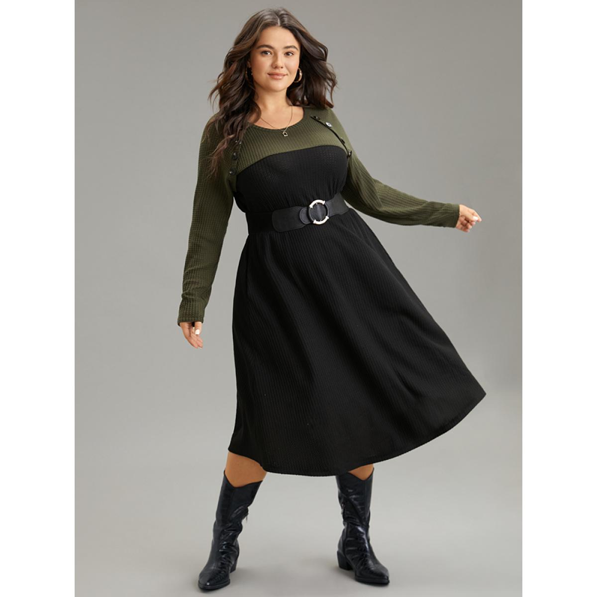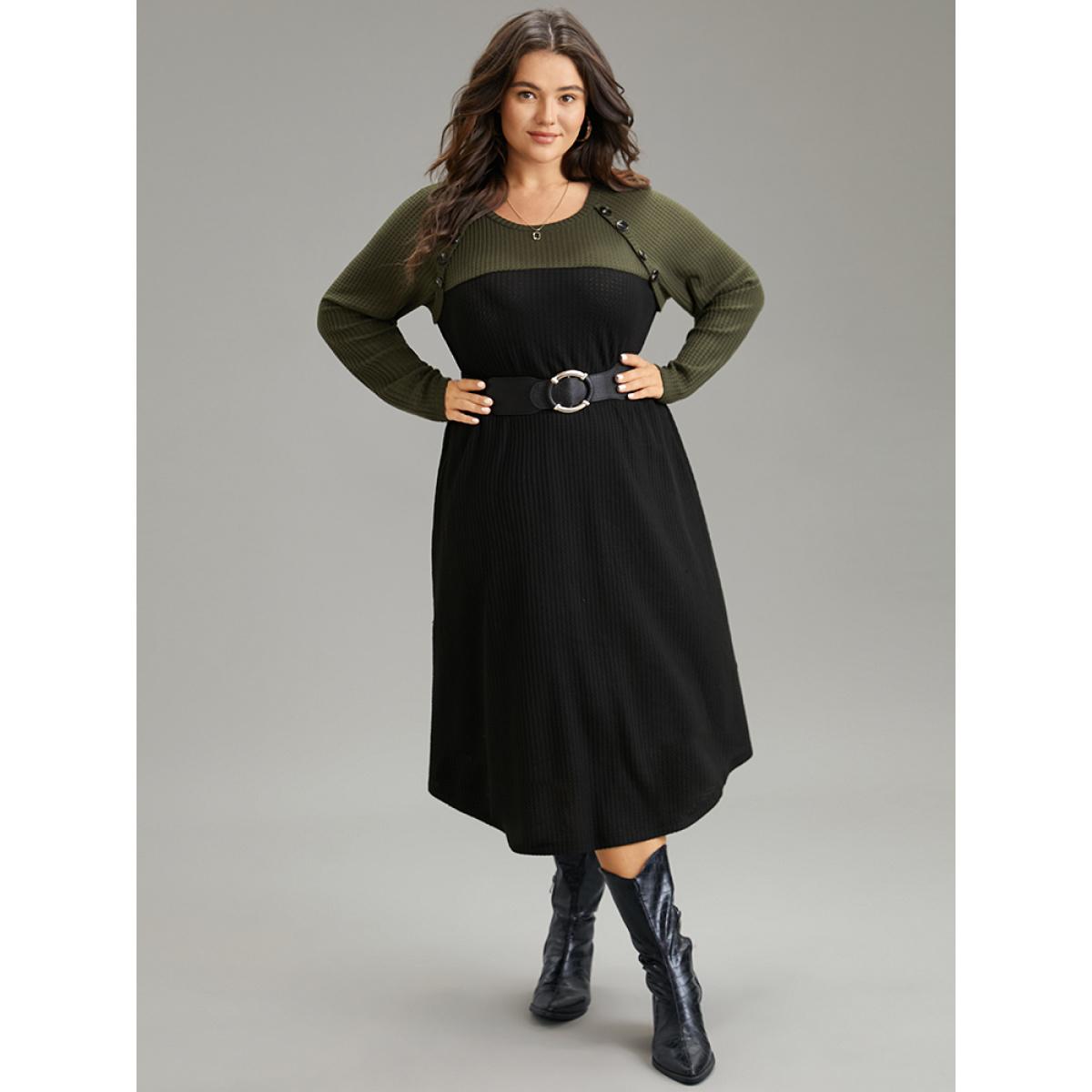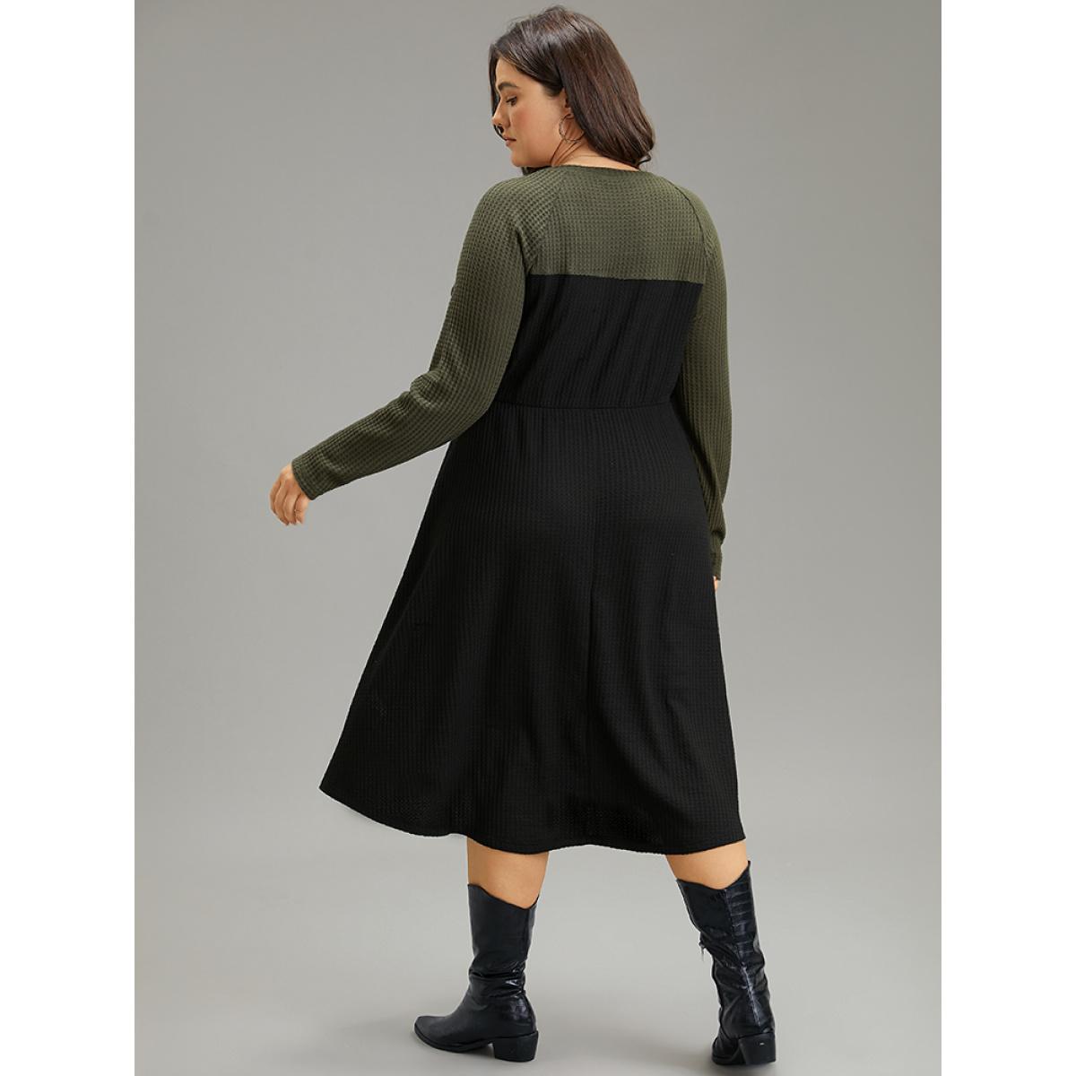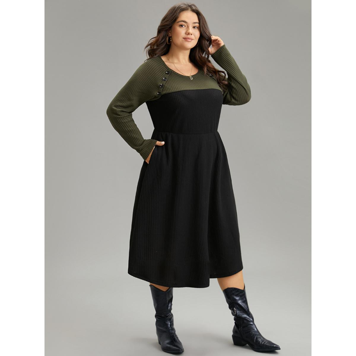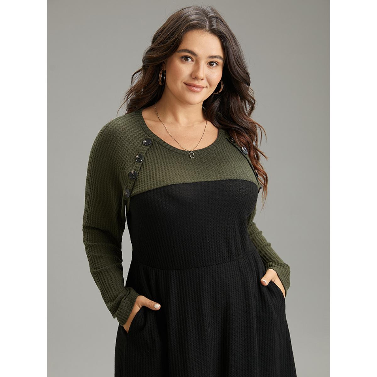Plus Size Contrast Button Detail Waffle Knit Pocket Dress ArmyGreen Women Casual Waffle Knit Round Neck Long Sleeve Curvy Midi Dress BloomChic 18-20/2X